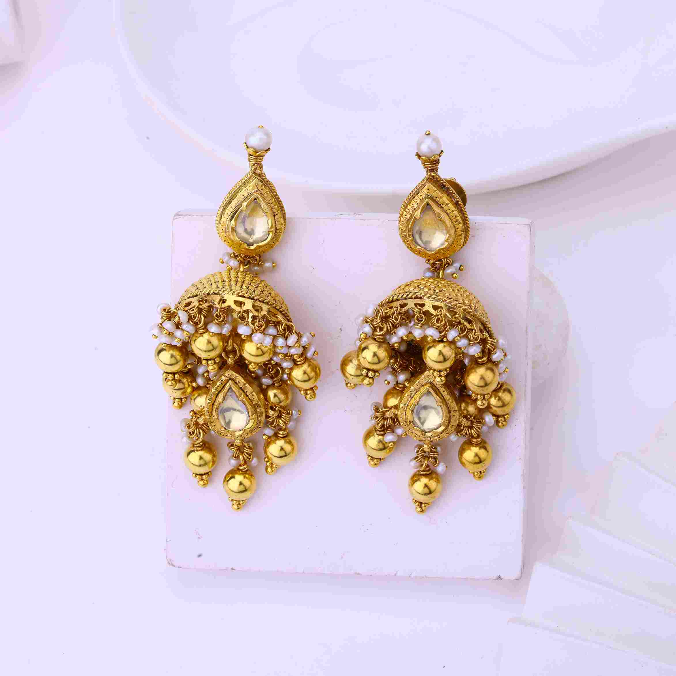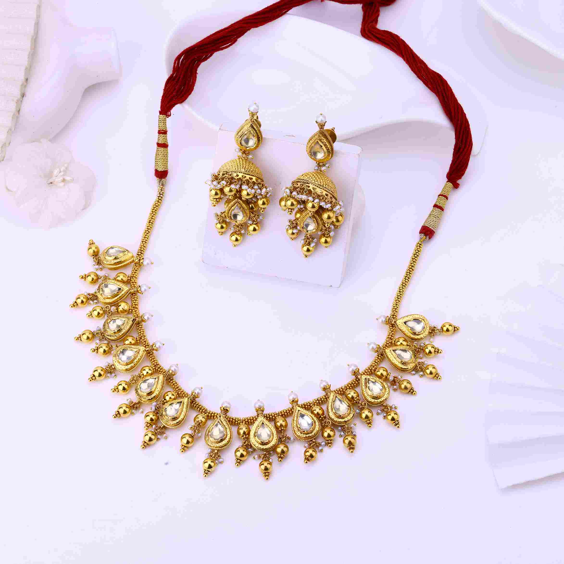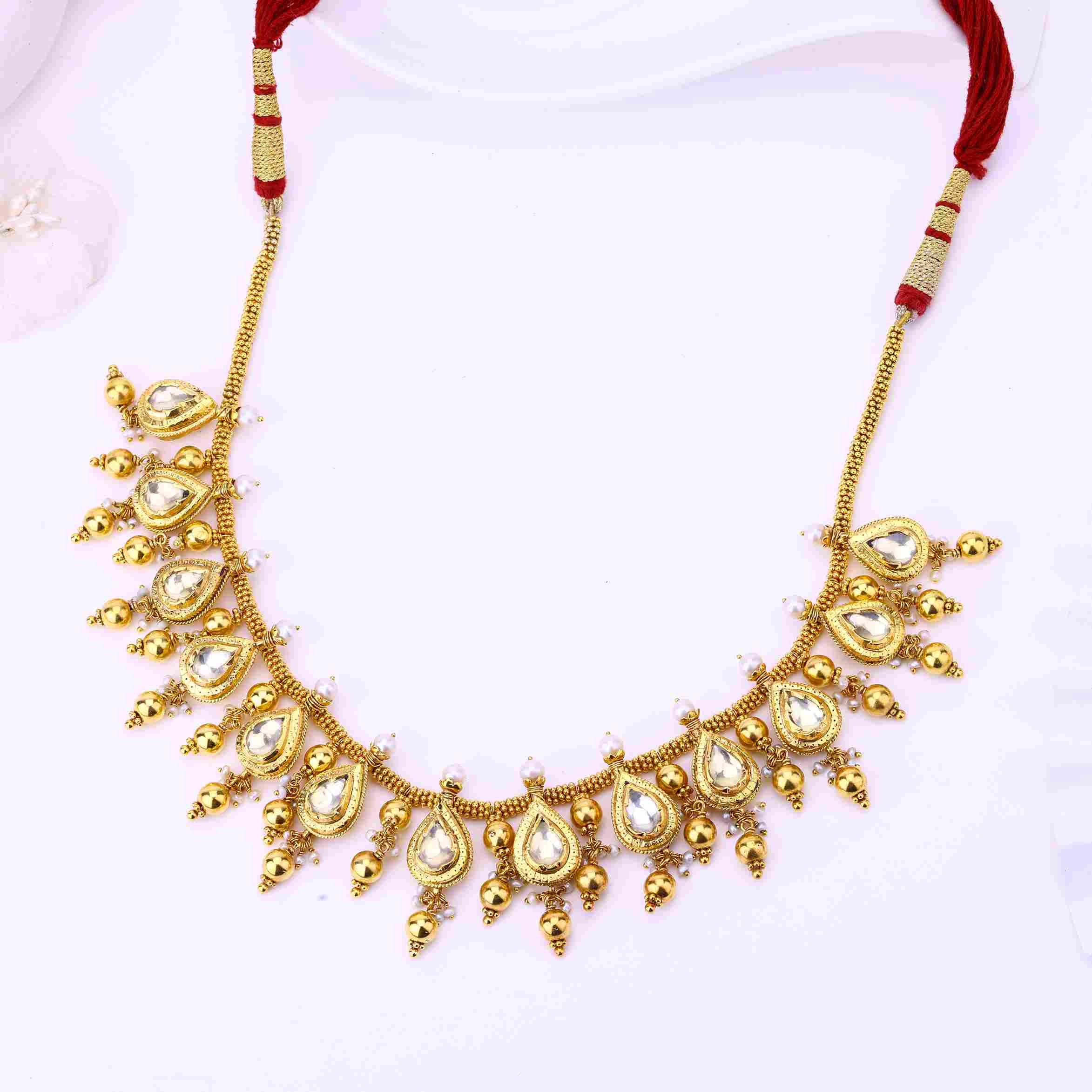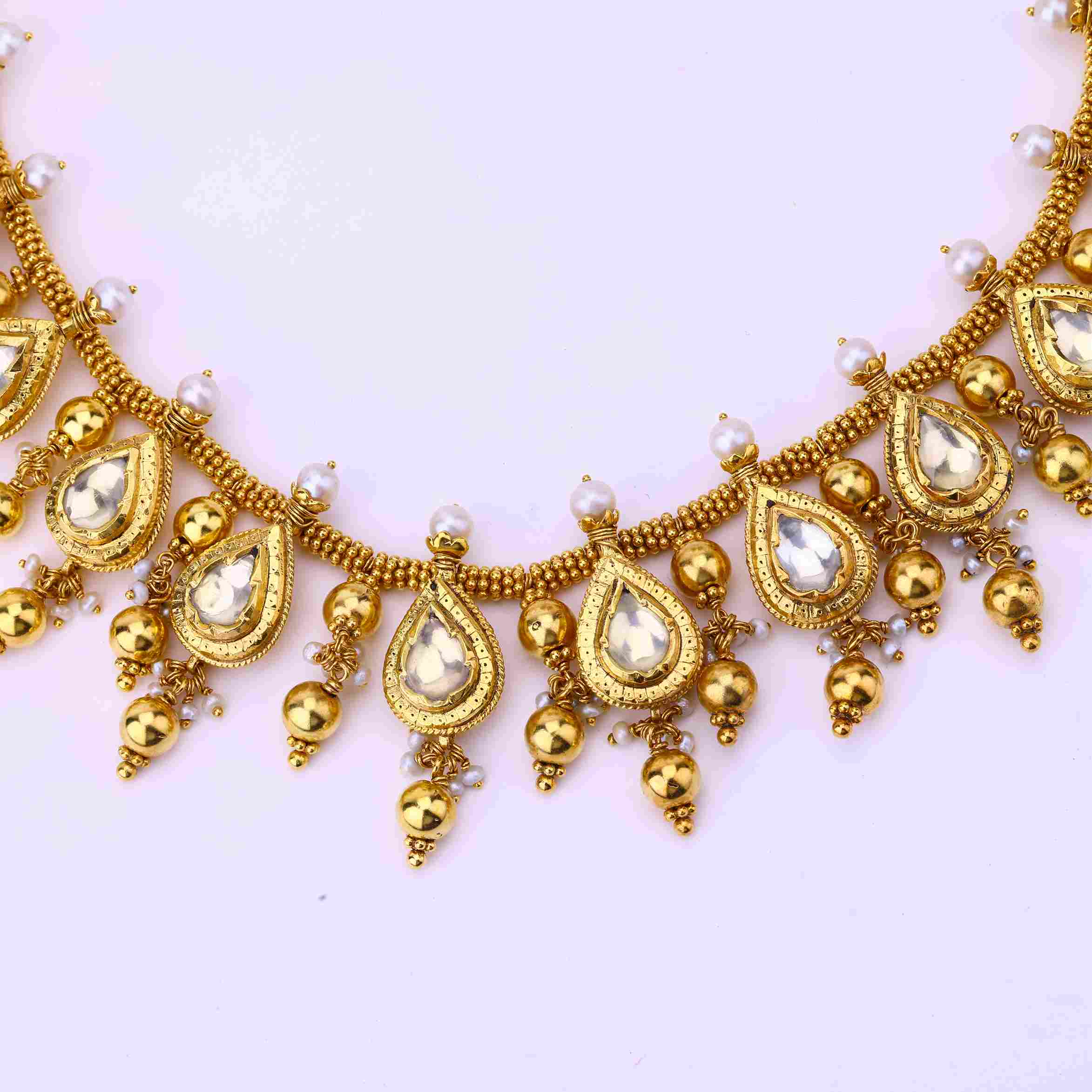 Grace and grandeur converge in this celestial necklace set, a shimmering union of ancient Indian artistry and sumptuous contemporary glamor. Khakho pearls drape across the neck like a string of moonbeams, while radiant moissanite stones flicker with prismatic brilliance. Handcrafted using the centuries-old Jadau technique, each lustrous piece is a wearable heirloom plated with precious 18K gold. Whether for a lavish gala or intimate gathering, this regal necklace set adds instant sophistication, transforming any occasion into a moment of regality. Own a bespoke work of art that will turn heads for generations to come.