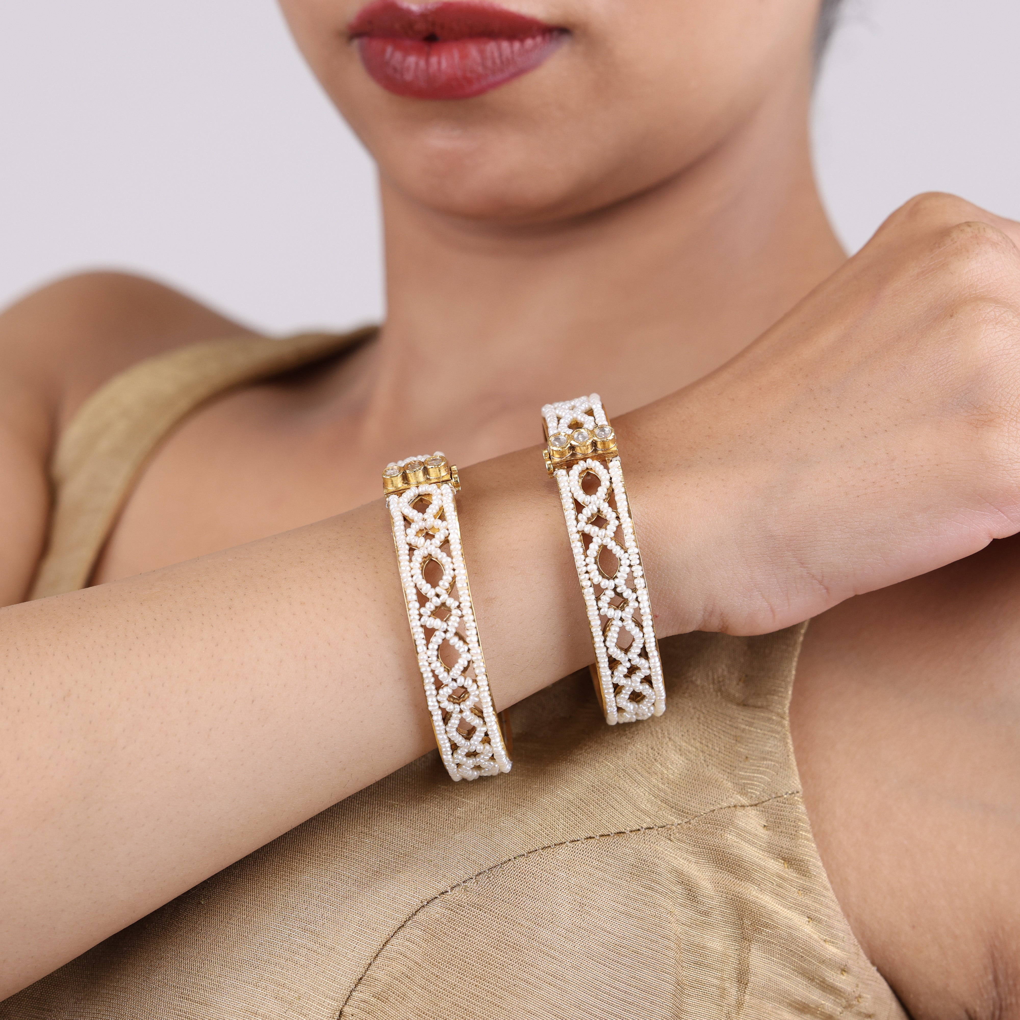 A design inspired from Mughal traditions, it is a structural wonder. Carefully threaded cultured pearls and set upon the winding symmetry of its form, the bangles represent simpicity and elegance at the paramount level of beauty. To be effortlessly slipped on for a date night or a laid back evenings, pair them with any attire of choice.