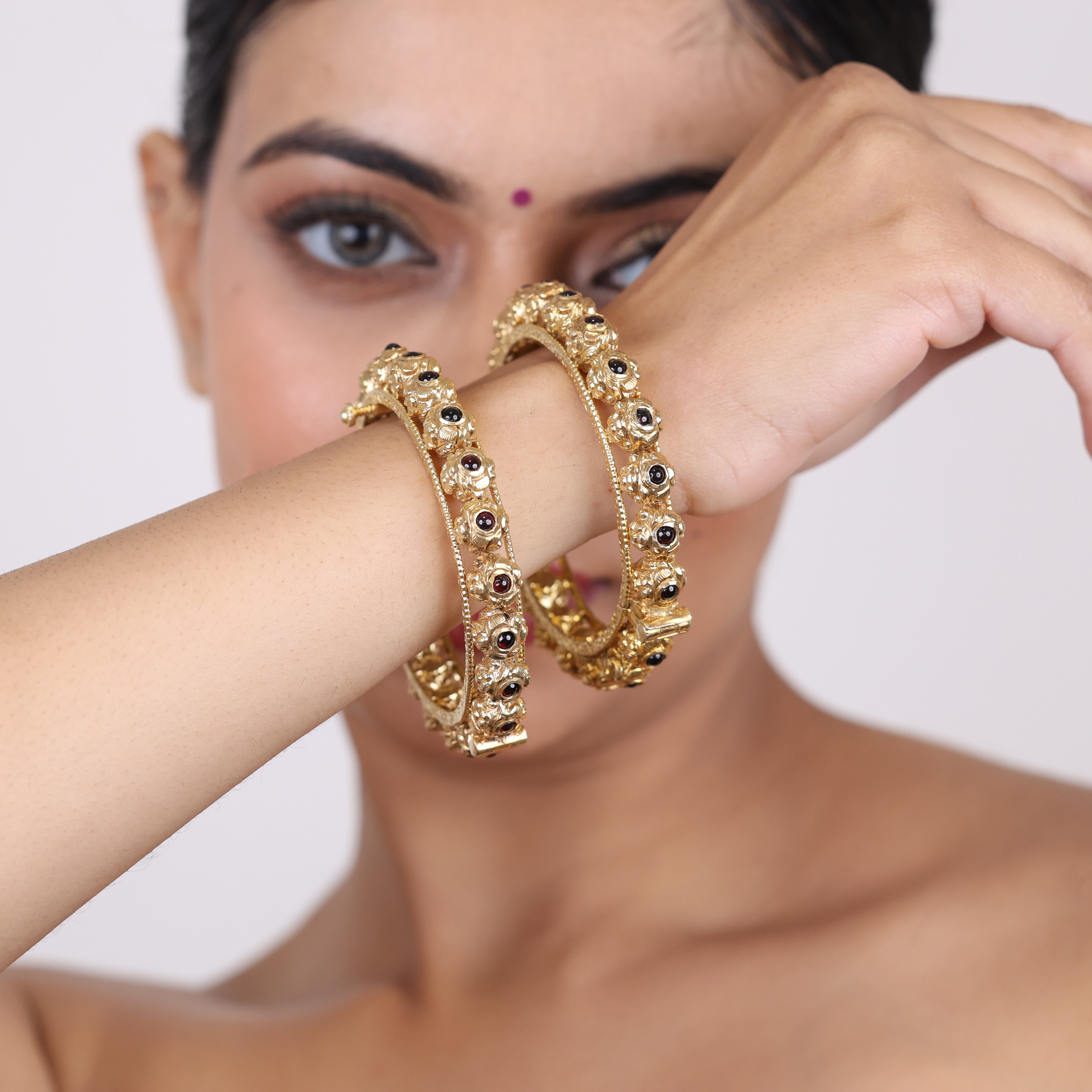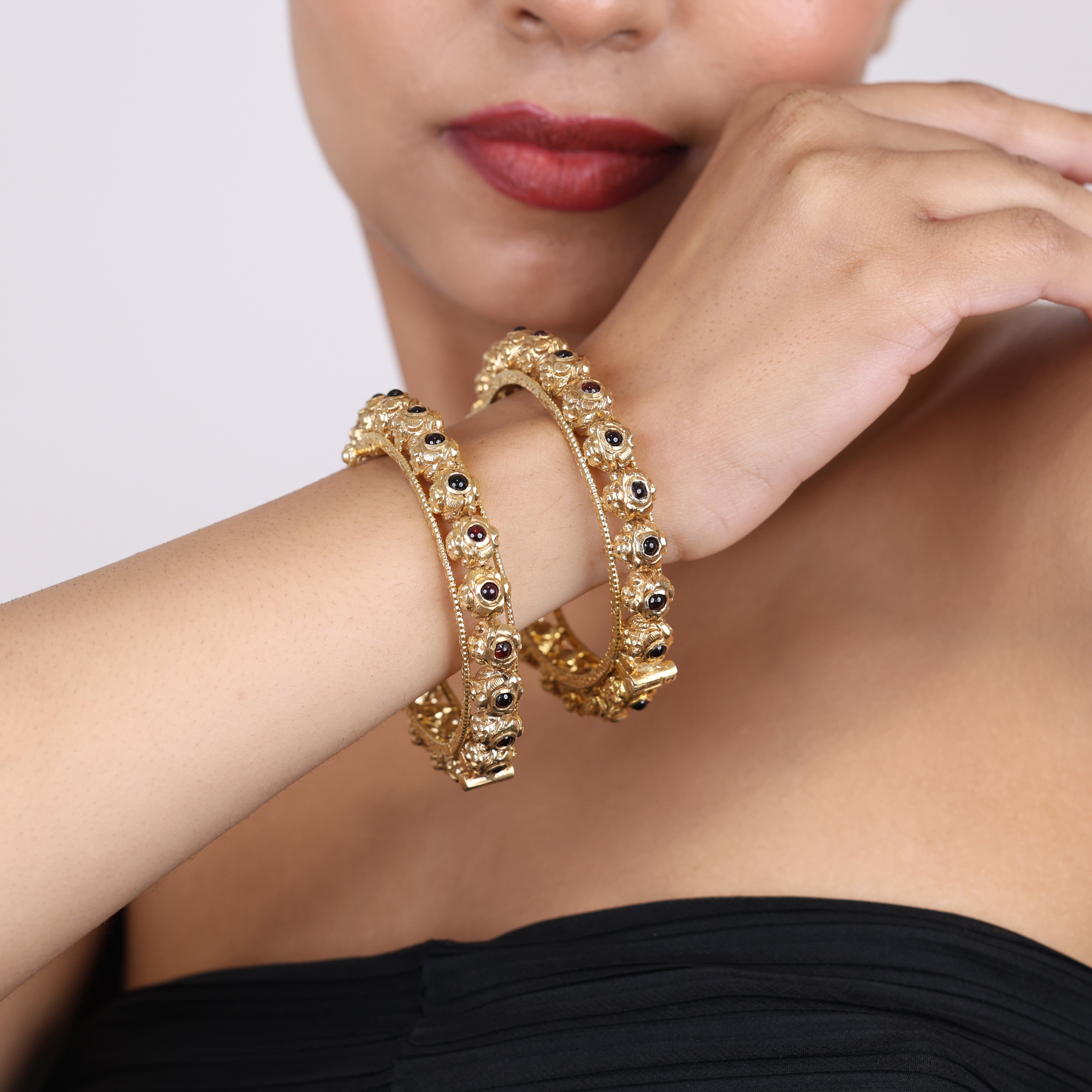 Garnet's fiery crimson hue ignites a sensual flame in these Crysantha bangles. Each dazzling bangle weaves traditional Indian artistry with modern opulence, its smooth gemstone blend radiating regal splendor. Slide one over your wrist and feel the surge of confidence and desire that garnet inspires. After all, this ravishing red stone has long symbolized passion, courage, and the protective power of love. Worn for centuries at grand weddings and auspicious festivals, garnet bangles remain cherished heirlooms passed through generations. With their alluring shimmer and timeless elegance, this daring set promises to turn heads and captivate hearts wherever it's worn. Indulge your boldest cravings—adorn yourself in these beacons of beauty and let your inner goddess shine.
