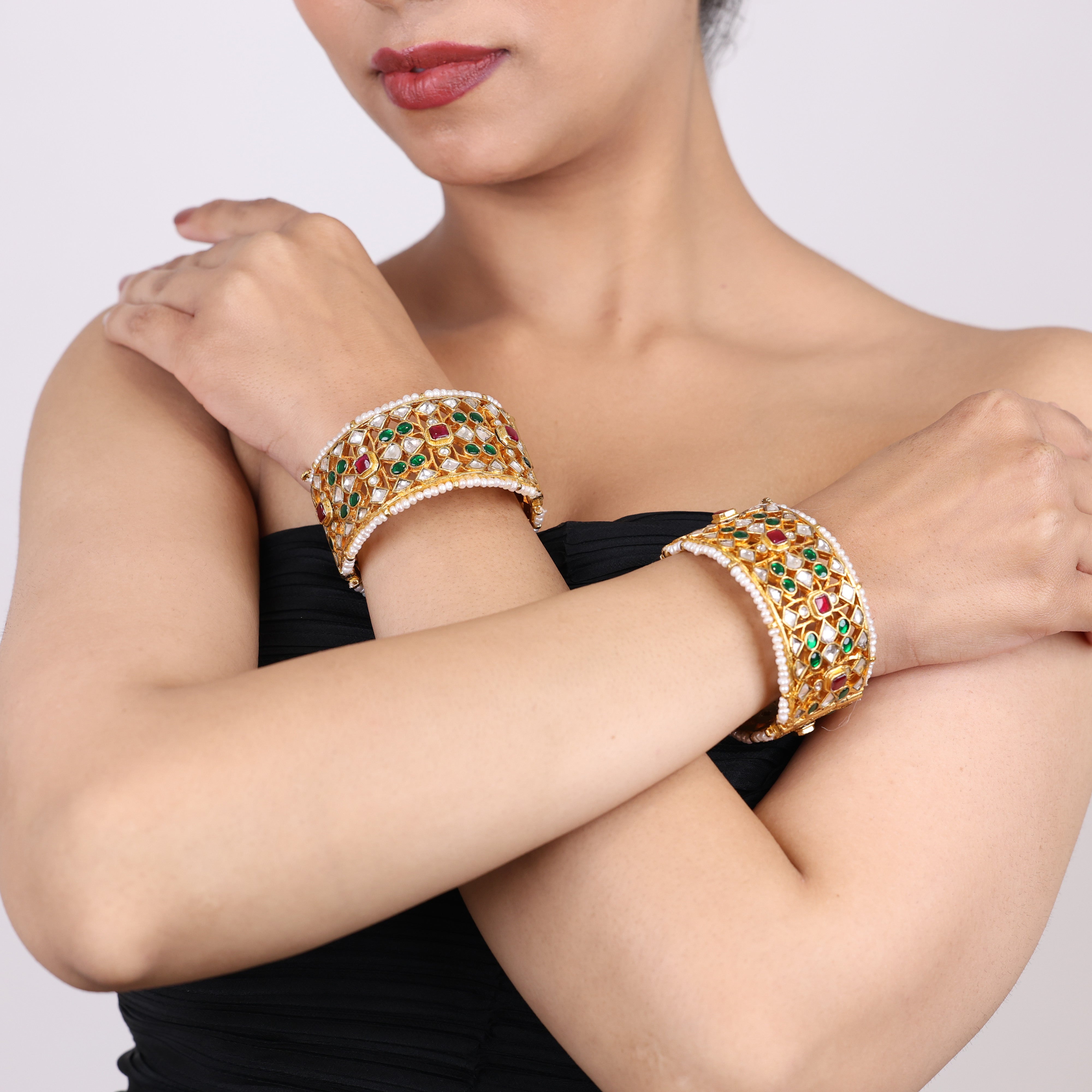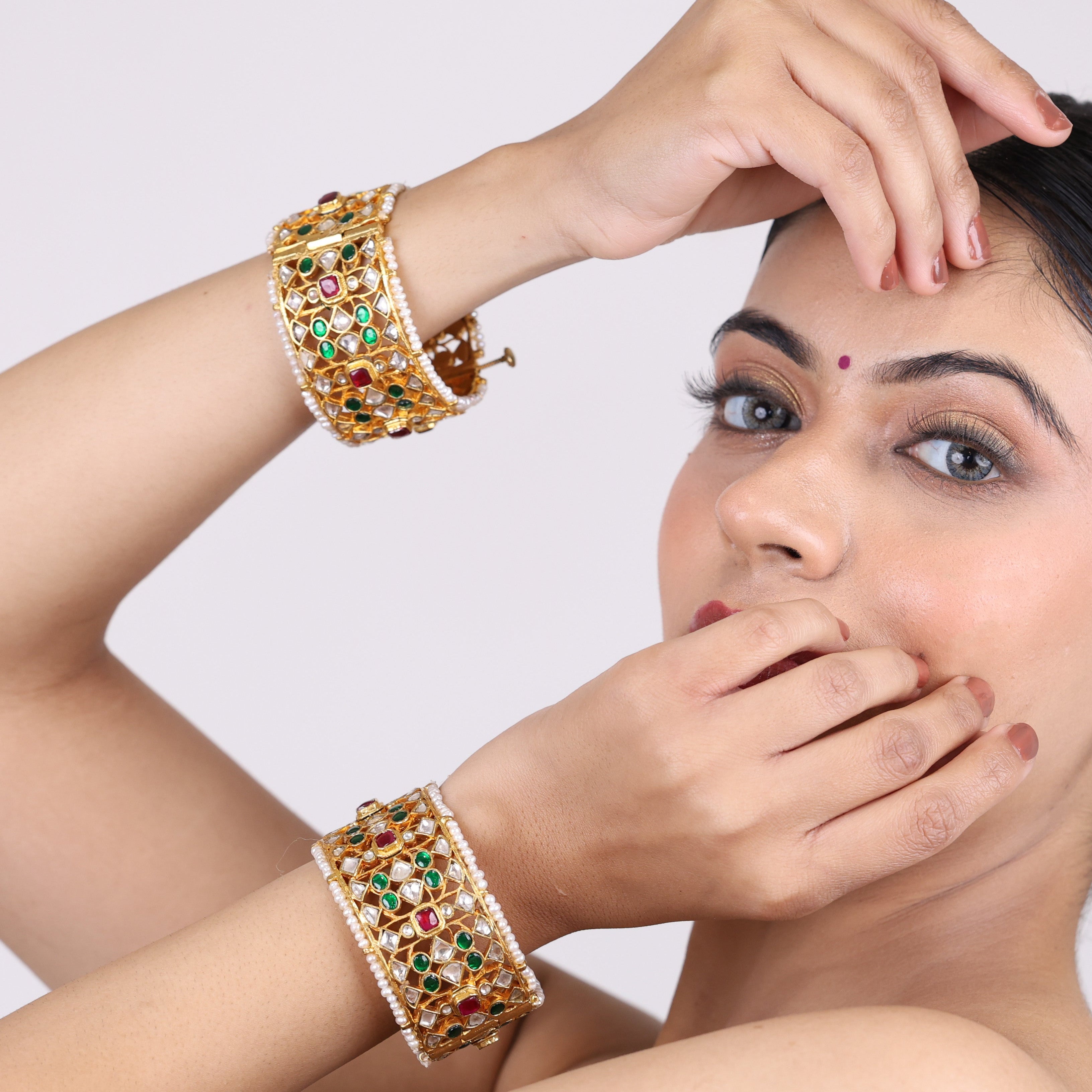 These handcrafted bangles are a luxurious indulgence grounded in nature's most stunning gemstones. Each bezel-set bangle shimmers with vibrant garnets, lustrous onyxes, radiant moissanites, and glistening khakho pearls - an earthy, prismatic blend that envelops your wrist in rich hues and soothing textures. More than mere adornments, these artisanal pieces connect you to the restorative essence of their gemstones, transporting you to tranquil beaches, verdant forests, and sun-dappled meadows with every glance. With their organic elegance and gemstone-fueled allure, these Earth's Embrace bangles let you experience the healing power of pristine nature, no matter where life takes you.