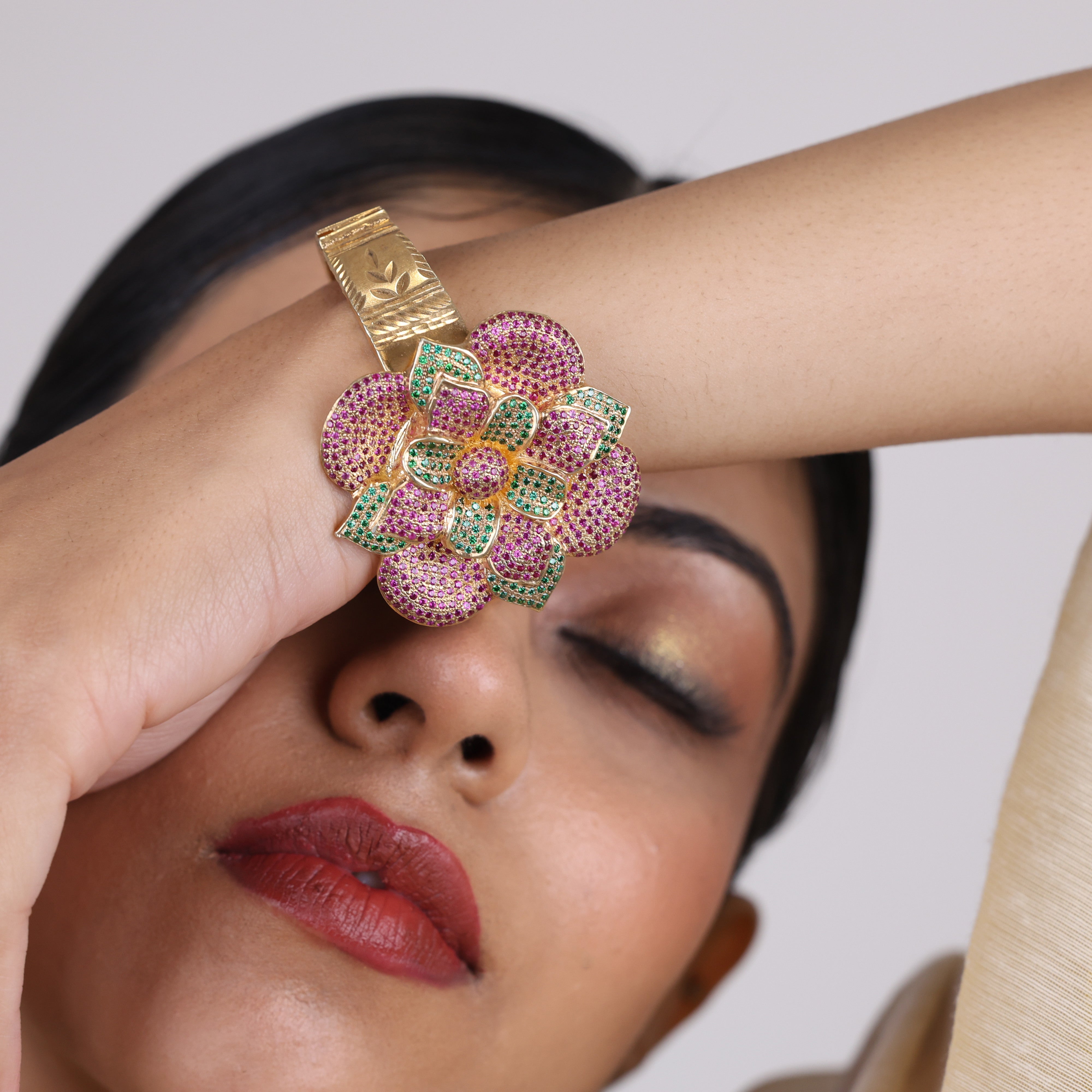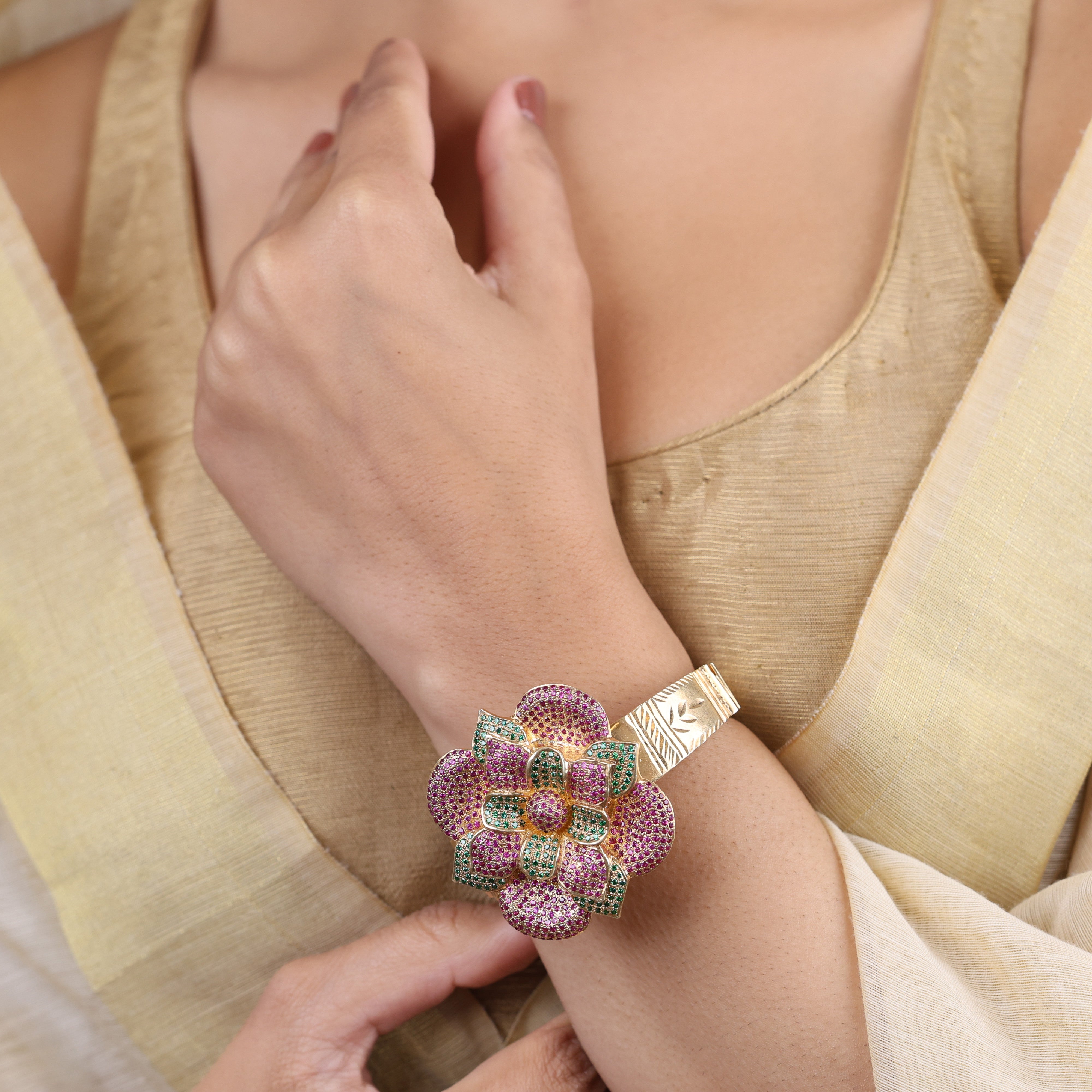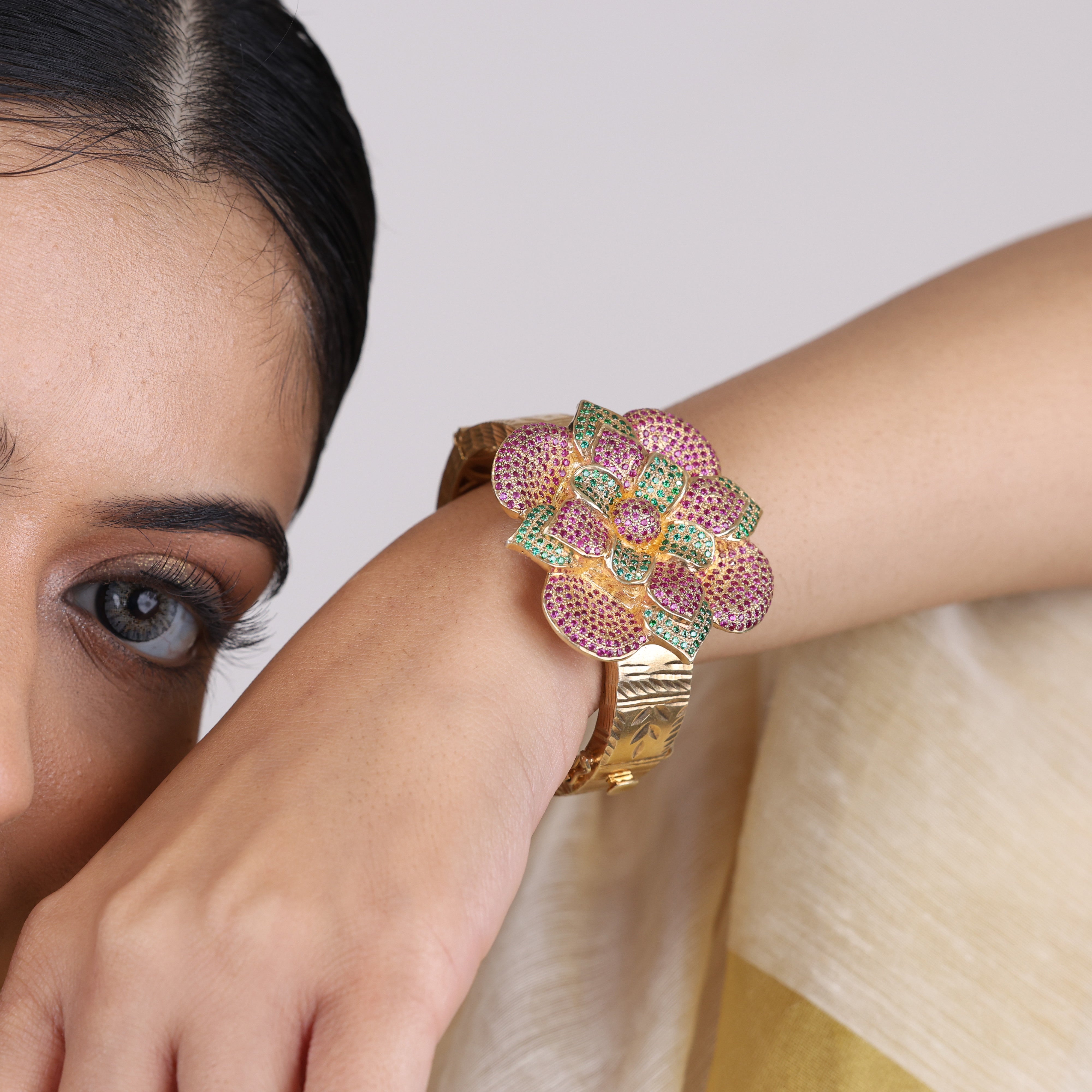 This Sensational Flora bracelet from the house of Sujhal is a captivating interplay of light and shadow. Sparkling ruby red and green emeralds combine to create a timeless design that evokes a sense of mystery and intrigue. The expertly crafted piece adds a touch of understated glamour to any outfit. Slip it on and make your day!