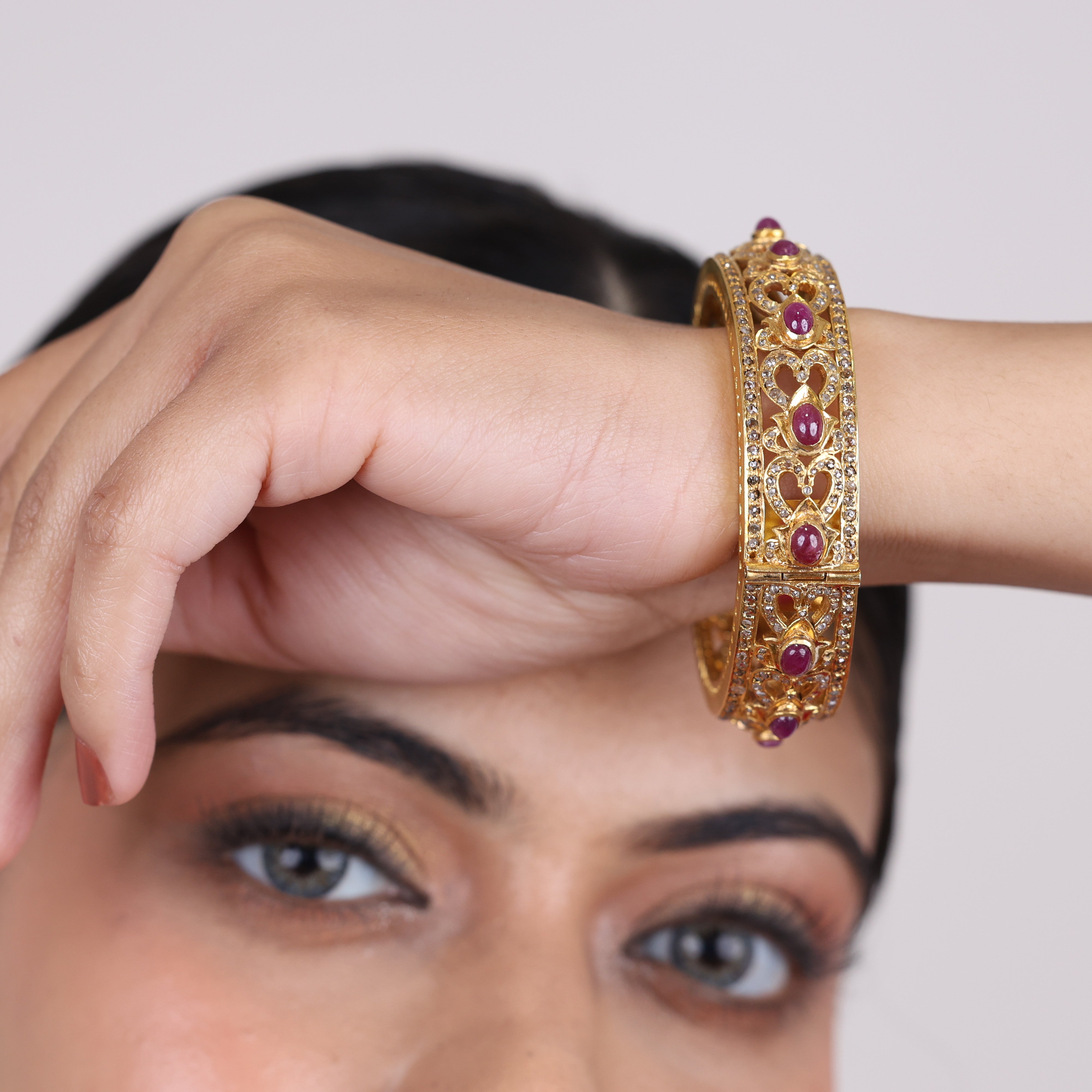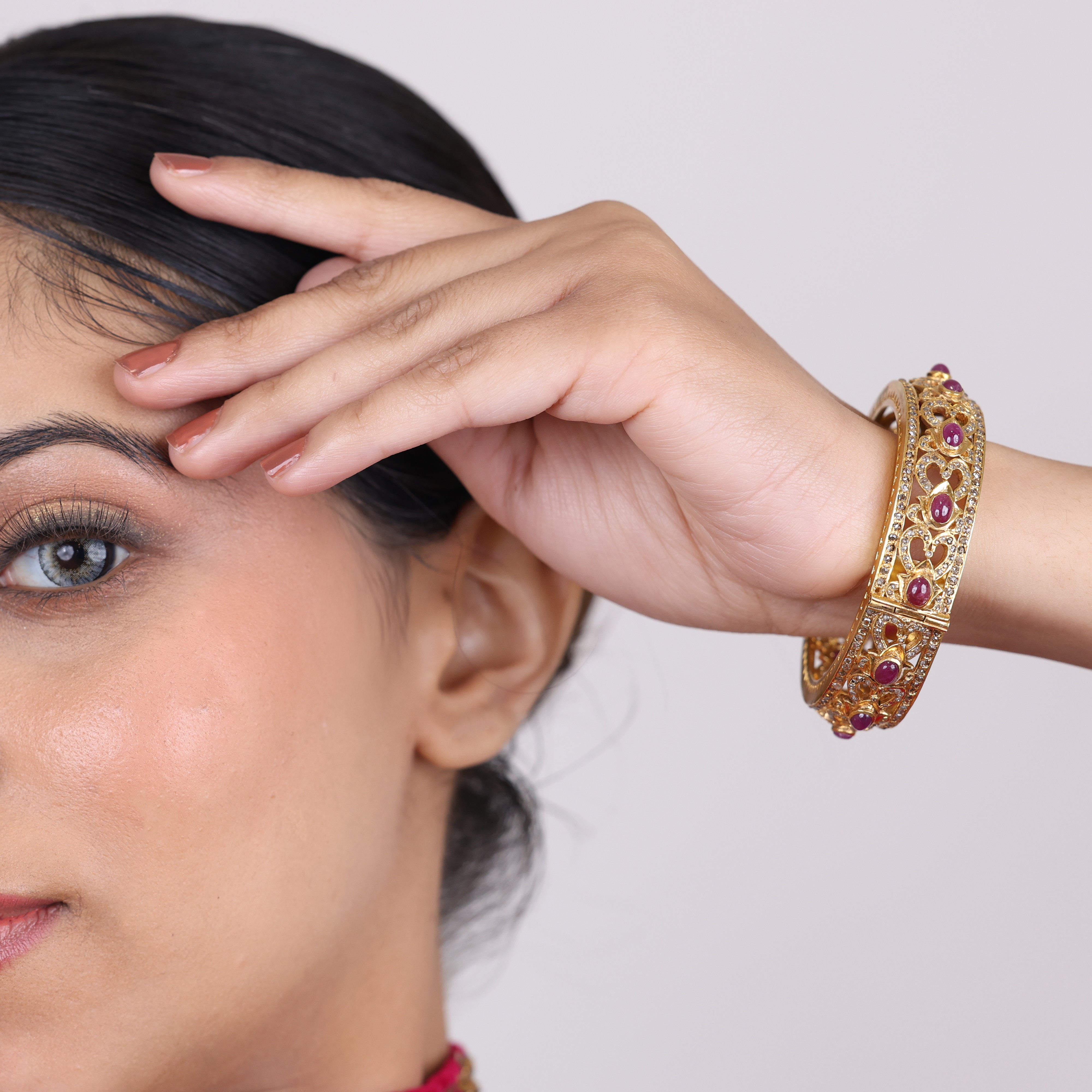 Swathed in the warm, glowing hues of a pink sunset, this luxurious bracelet is a dazzling confection of precious ruby and moissanite gemstones. Fiery rubies evoke passion and romance, while the brilliant moissanite stones sparkle with a diamond-like radiance. This eye-catching accessory is a true statement piece, elevating any look with its feminine glamor and show-stopping sparkle. Whether worn for a special evening out or to add a touch of luxury to your everyday style, this bracelet's radiant gemstone blend will have you basking in compliments and admiring glances. Indulge your inner romantic with a piece that captures the magic of a breathtaking sunset in jewelry form.