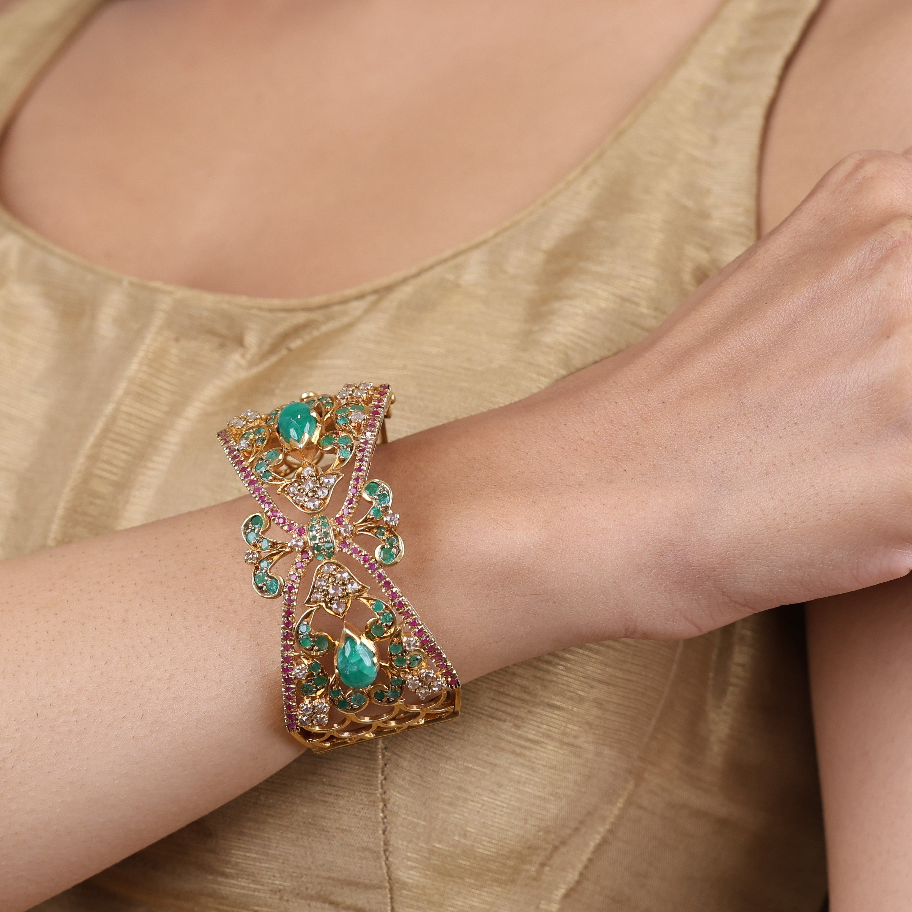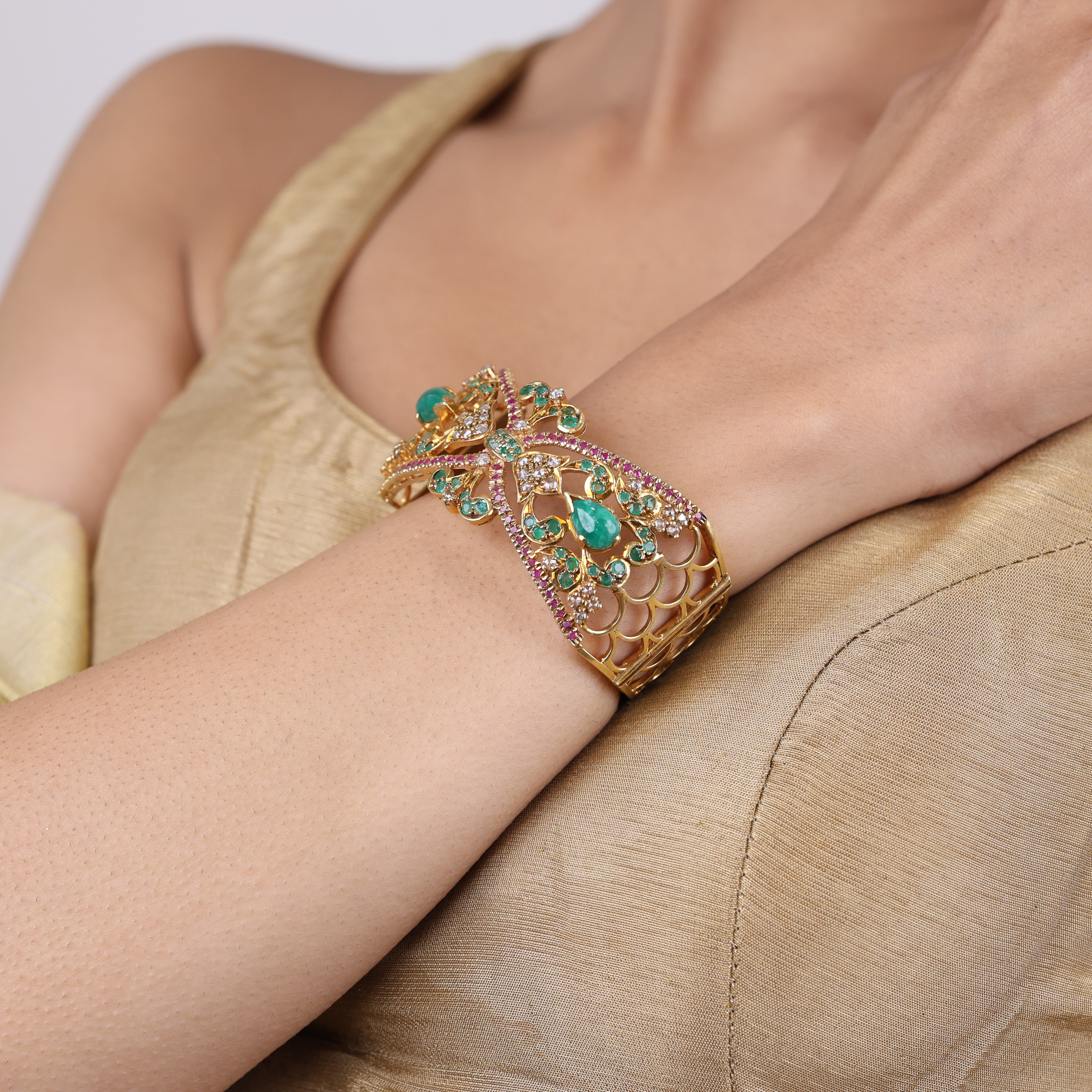 She's a sunset on your wrist, a fiery blend of rubies and moissanite ablaze with passion. Scarlet Blush emeralds ignite this luxury bracelet in a kaleidoscope of vivid hues, each one richer than the last. Striking yet refined, the perfect centerpiece for the woman who demands quality, craves exclusivity and scorns the status quo. Indulge in decadence crystalized by mesmerizing gemstones that gleam with all the confidence and boldness of an evening thunderstorm. Why blend in when you can blaze your own trail? Unlock your most vibrant self in this audacious statement piece that transforms any ensemble into an undeniable tour de force.