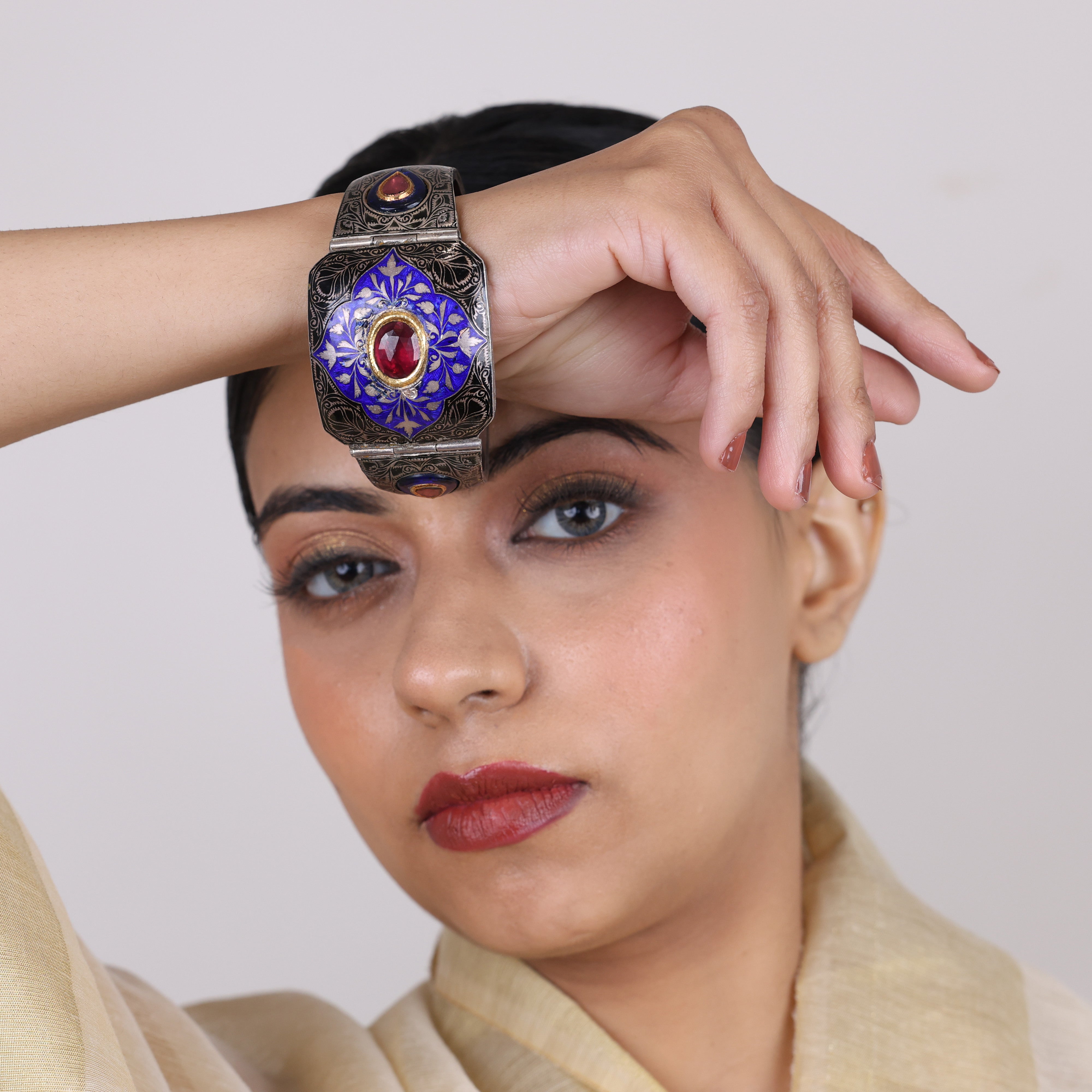 Slip into a world of opulence with these Crimson Hearts ruby meenakari bracelets. Each exquisite bangle is a true labor of love, handcrafted by skilled artisans using the revered meenakari enamel technique. Fiery rubies glimmer amid the intricate metalwork, radiating passion and romance in their deep crimson hue. While steeped in timeless Indian heritage, these bracelets bring an undeniably modern sophistication that elevates any ensemble. Whether stacked for a bold statement or worn solo for understated elegance, these ruby meenakari bracelets fuse centuries-old tradition with contemporary luxury. Indulge in a touch of wearable art that transforms every day into an occasion.