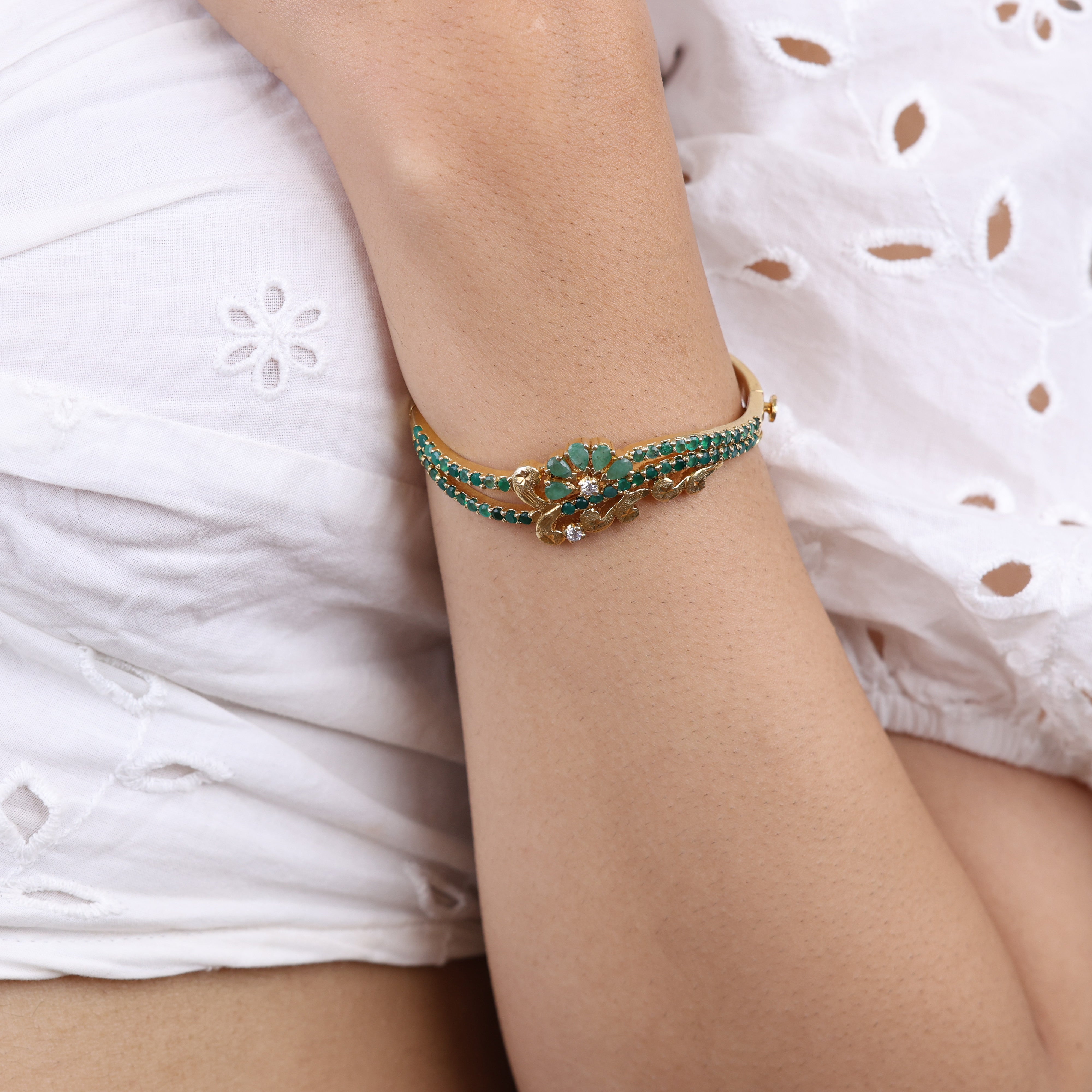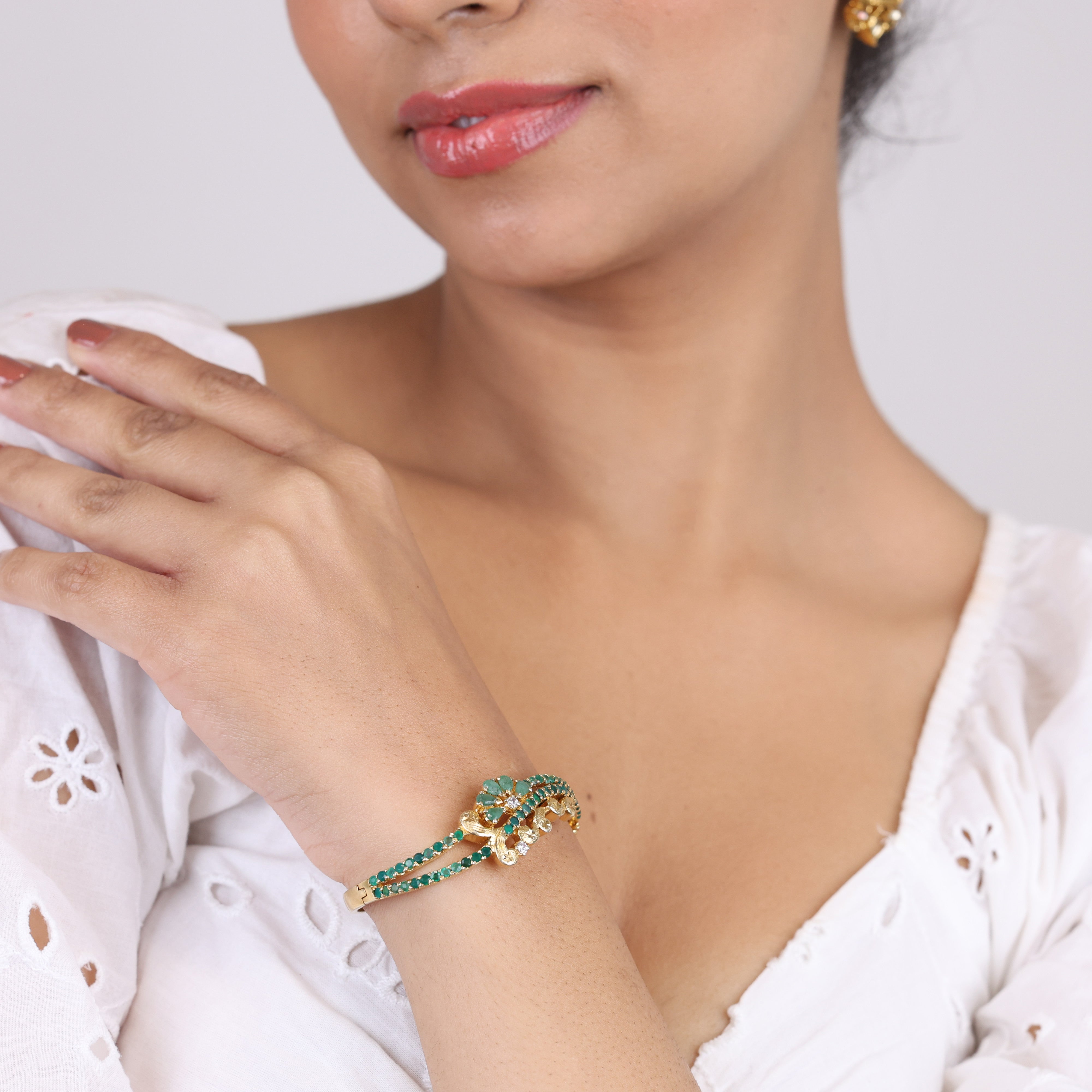 Emerald is the gem of rebirth and growth—fitting for this stunning bracelet that heralds the arrival of your boldest self. The Trellis Touch bracelet by Sujhal captivates with a lustrous emerald gemstone blend that radiates regal allure and catches the light with every twist of the wrist. Glittering cubic zirconia accents amplify the drama, their sparks of brilliance elevating the jewel-tone palette to dazzling new heights. This isn't just an accessory; it's a wearable talisman that empowers you to own any room you enter. Envelop your wrist in nature's most coveted green treasure and embrace the confidence that comes from wearing a true luxury piece. Lush, vibrant and undeniably chic, this bracelet turns mere adornment into a statement of self-assurance and sartorial flair.