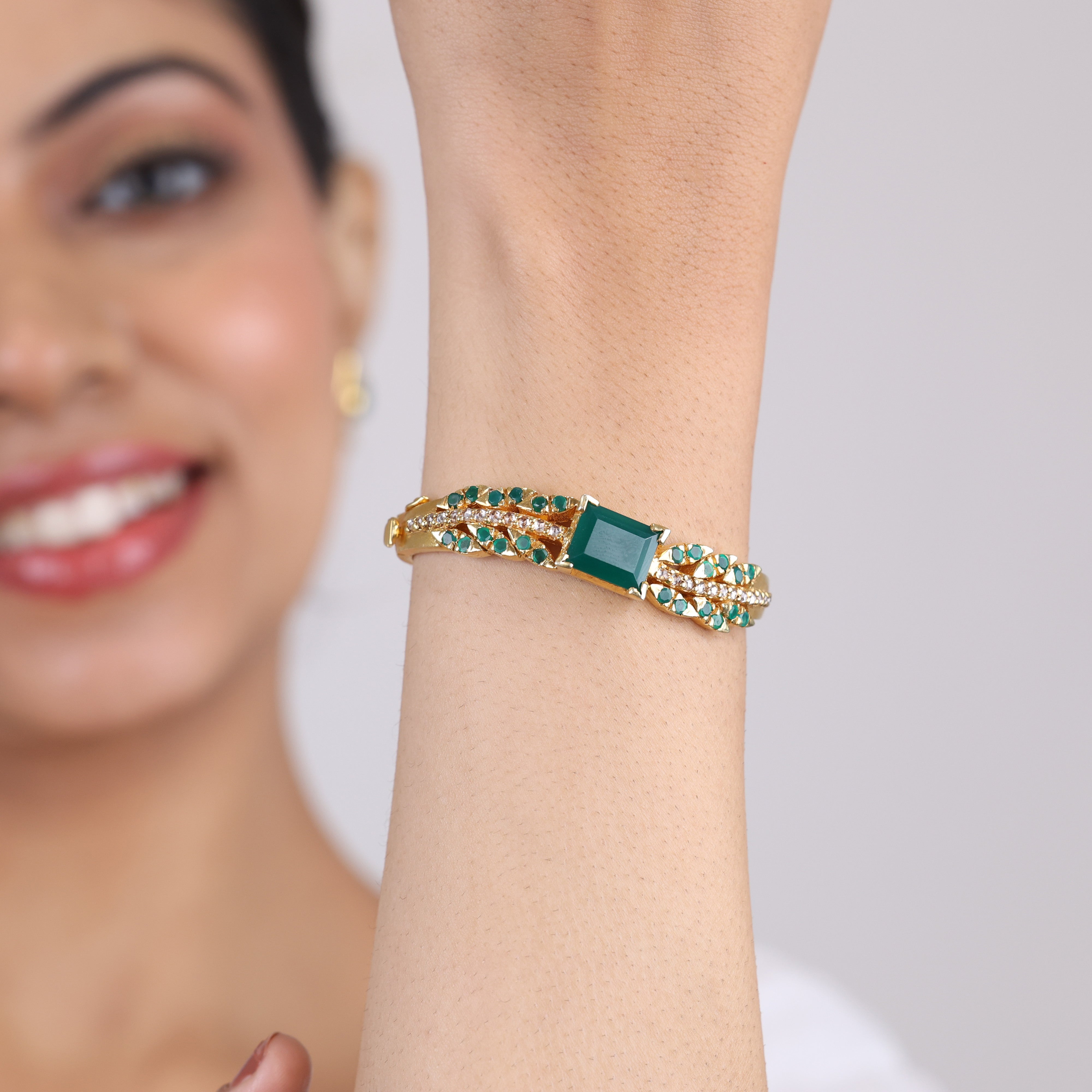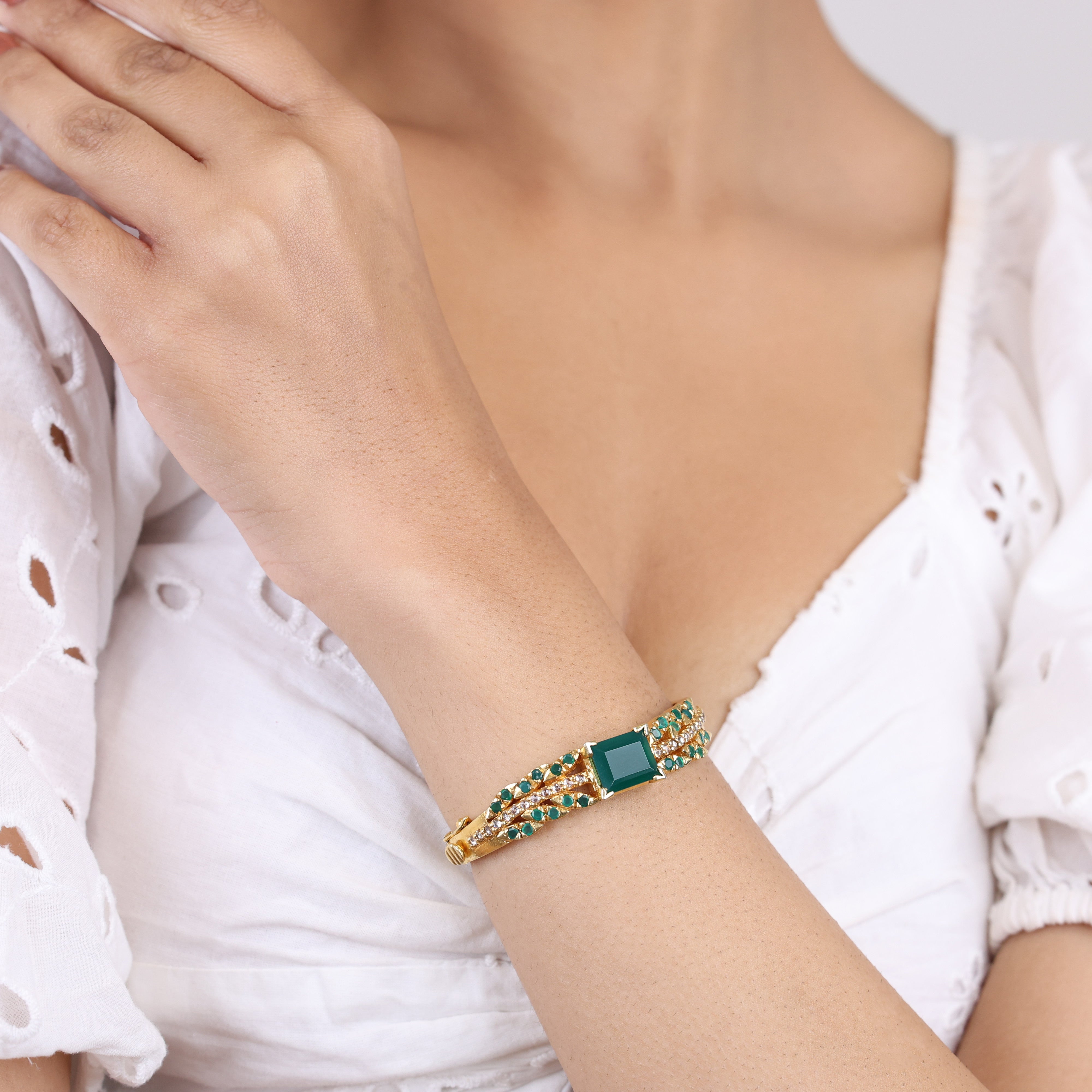Summon visions of enchanted emerald forests with Sujhal's stunning 'Emerald Dreams' bracelet. Boasting deep green emeralds that glisten with timeless romance, this luxurious jewelry piece is further elevated by the fiery sparkle of moissanite gemstones and the sleek sophistication of black onyx accents. With its rich color palette and thoughtful gemstone combination, this emerald bracelet serves as an eye-catching statement accessory for life's most special occasions—from galas to weddings and everything in between. Indulge in a touch of elegant, earthly beauty courtesy of this exquisite emerald moissanite onyx bracelet from the house of Sujhal.