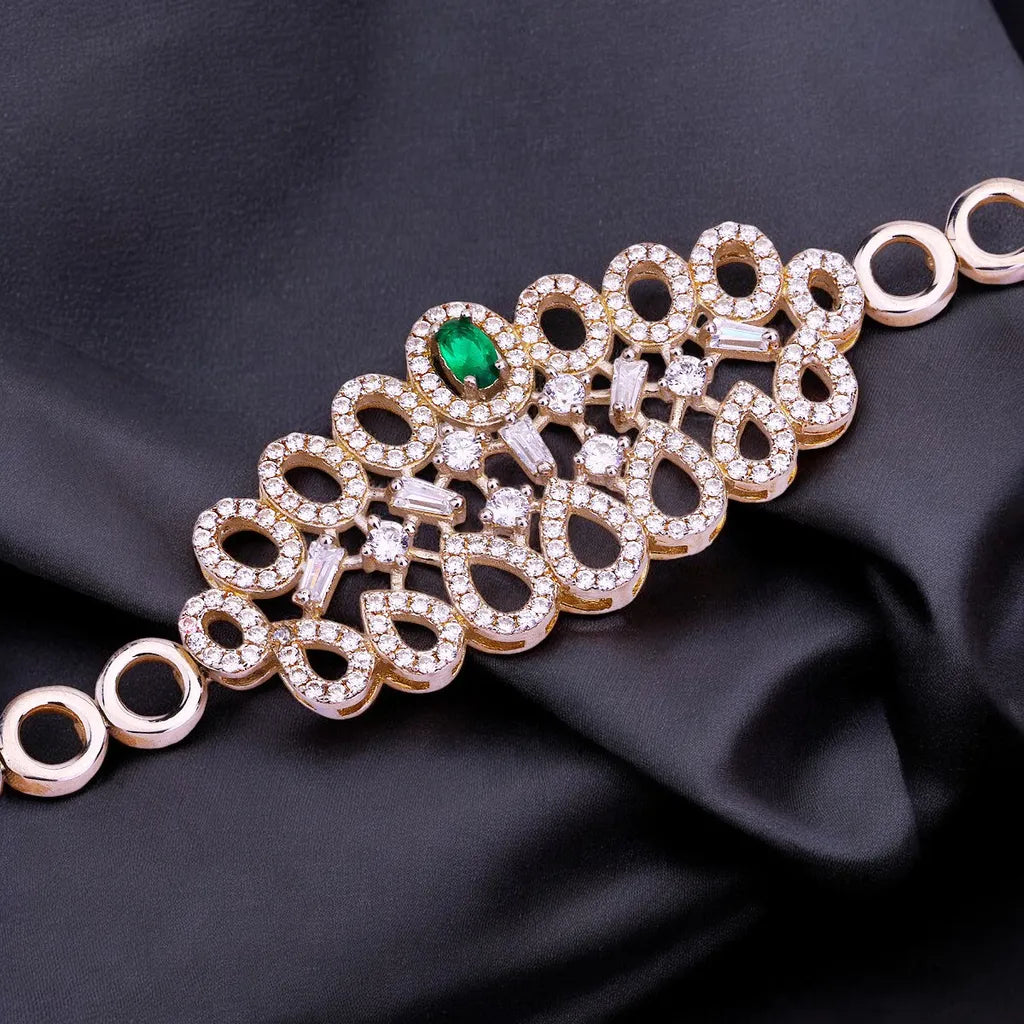 Radiate opulence with Sujhal's Twilight Kiss luxury bracelet. This exquisite gemstone blend effortlessly fuses timeless allure with modern glamor. Rows of shimmering cubic zirconia stones alternate with a hypnotic hydro emerald in the centre, creating a regal aesthetic that commands attention. Whether worn for date night or a formal gala, this bracelet instantly elevates any ensemble with its show-stopping sparkle and unparalleled craftsmanship. With the Twilight Kiss adorning your wrist, you'll turn heads and exude an air of sophistication wherever you go. Indulge in this dazzling accessory that perfectly captures the essence of refined luxury. After all, you deserve to feel like royalty.