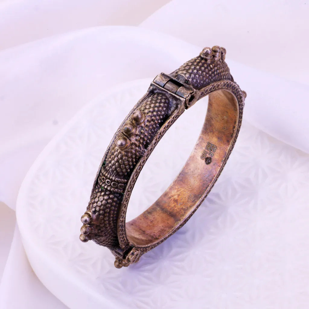 Blending vintage flair with modern luxury, this classic oxidized oure silver kada bracelet exudes timeless sophistication. Its rich, mottled patina evokes the romance of a bygone era, each subtly unique piece bearing the hallmarks of handcrafted artistry. Yet the minimalist styling remains utterly contemporary, seamlessly transitioning from morning coffee runs to after-work cocktails. Lightweight and comfortable enough for everyday wear, this bracelet is a testament to expert craftsmanship and heritage design. Slip it on to instantly elevate any look with an heirloom-inspired accent that channels an understated, ageless glamor. Vintage-inspired yet decidedly modern, this oxidized kada bracelet perfectly marries past and present. Indulge in the luxury of an iconic, centuries-spanning style that never goes out of fashion.