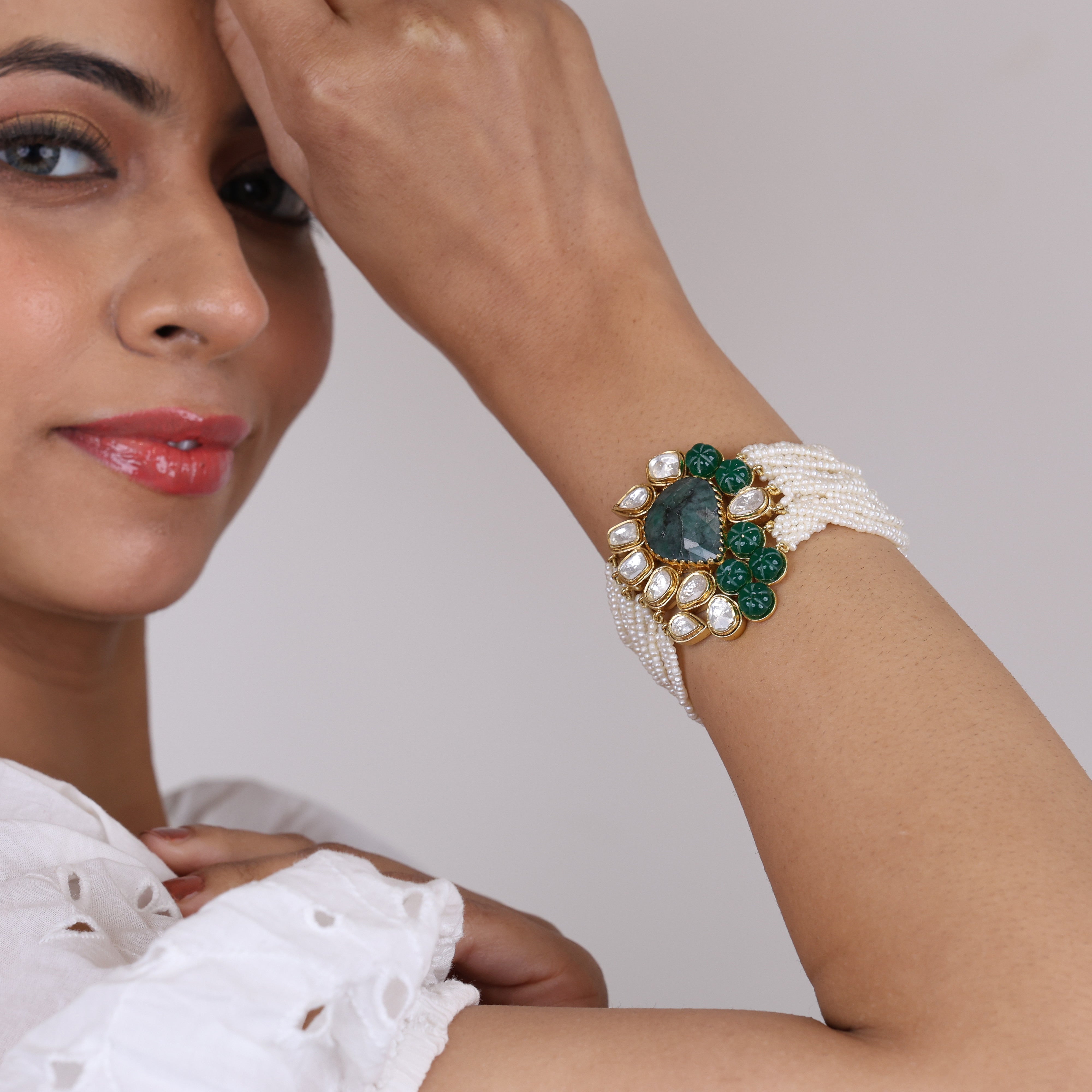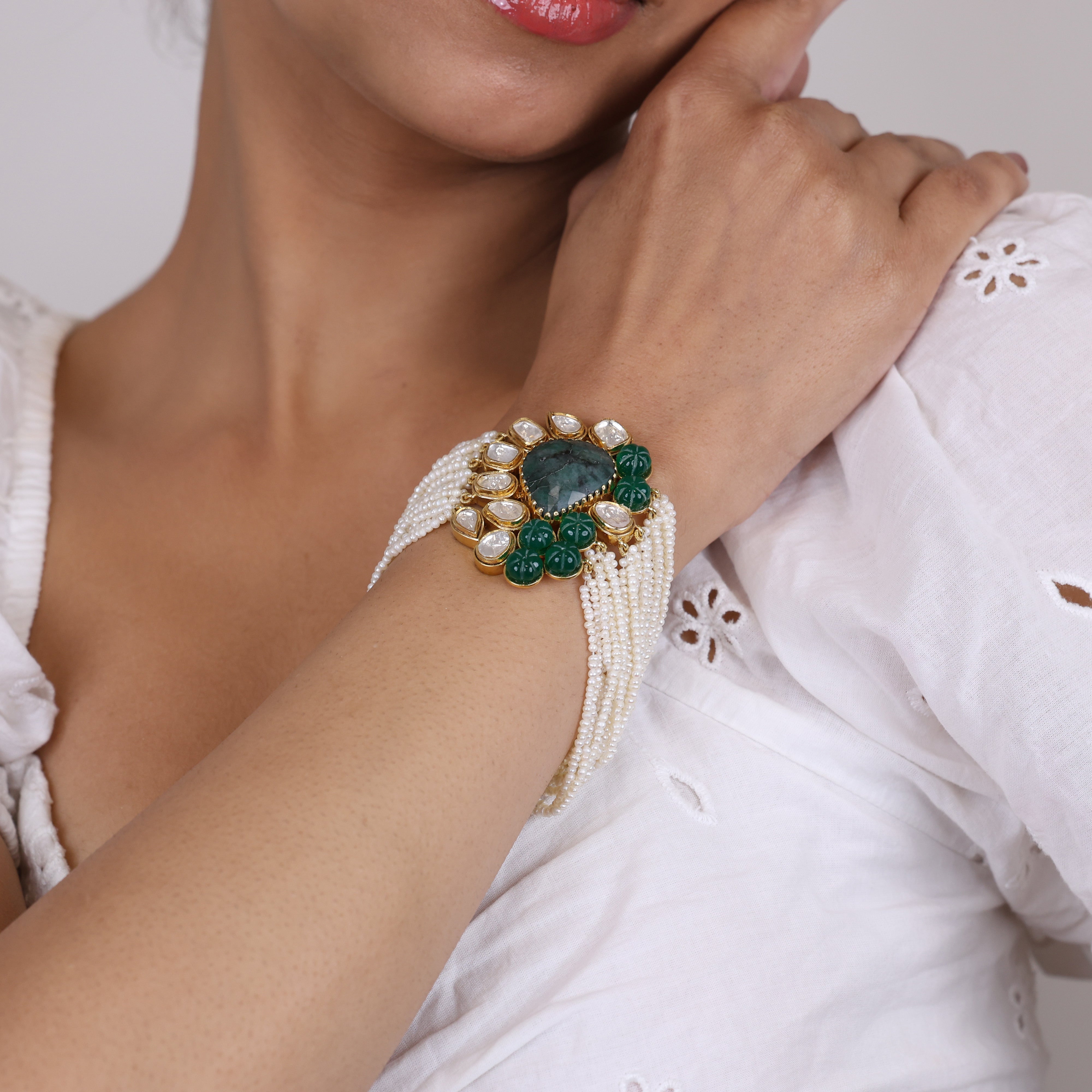 Where land meets sea, rarity meets radiance. Introducing "Pearly Seas" - the jewelry icon that transforms precious stones into a symphony of color and texture. This luxury bracelet blends the verdant allure of emeralds, the luminous whispers of khakho pearls, the fiery brilliance of moissanite, and the midnight mystique of onyx into one breathtaking accessory. Sourced from far-flung corners of the globe, each gemstone carries echoes of its exotic origins, culminating in a piece that transcends mere adornment. With hues ranging from glistening oceanic blues to earthy forest greens, this striking curation of nature's treasures evokes wanderlust, opulence and the irresistible allure of the unexplored. When draped around the wrist, "Pearly Seas" instantly elevates any ensemble into the extraordinary - a statement of impeccable taste and a canvas for self-expression. Revel in the rarity of owning a true jewelry icon.
