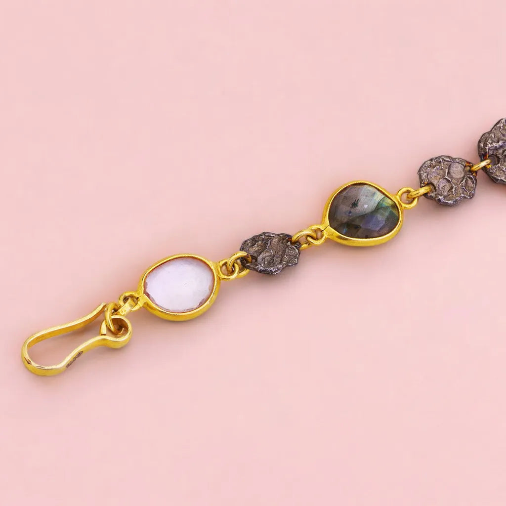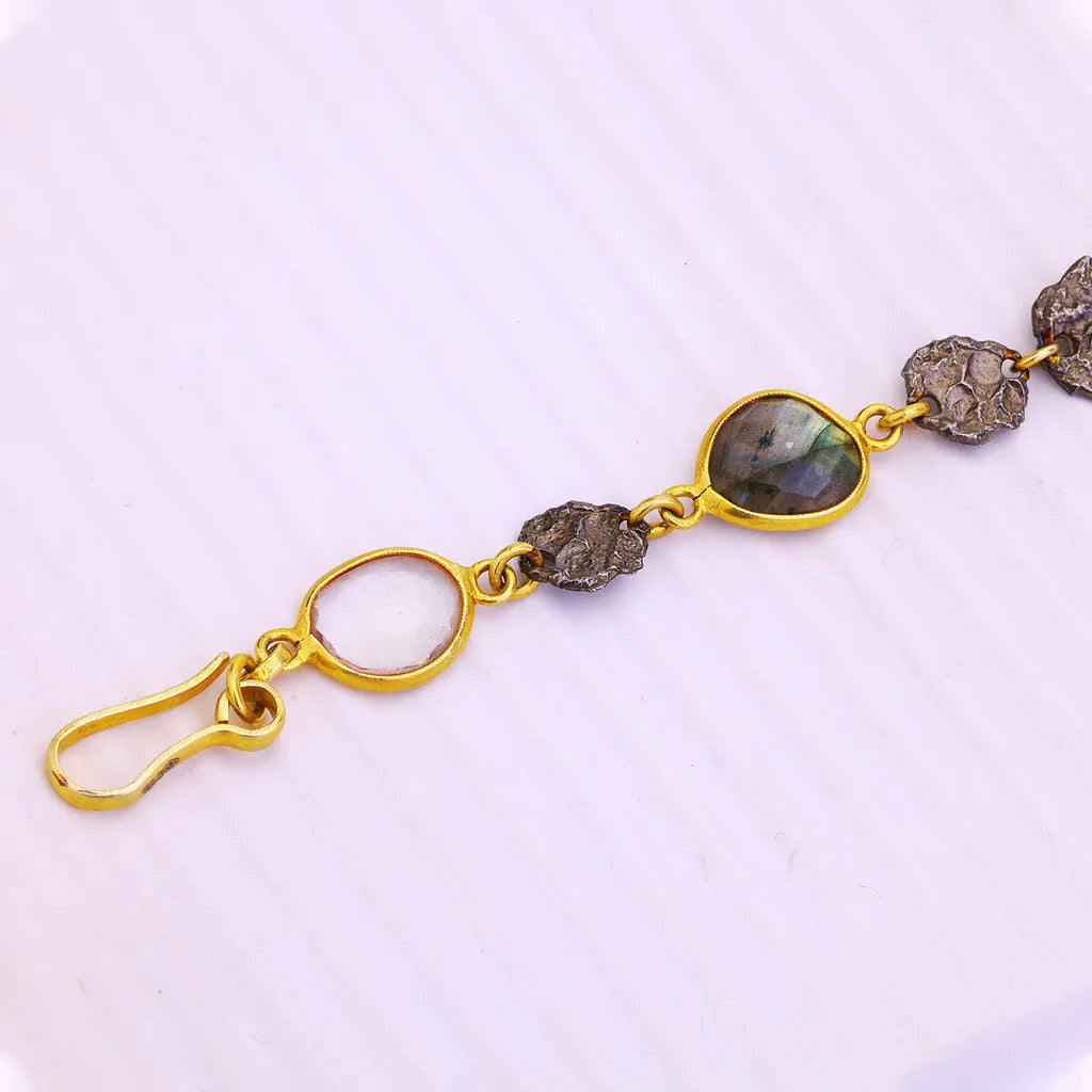Revel in nature's elegance with the Dark Sunset bracelet by Sujhal. This exquisite piece of luxury jewelry showcases the captivating beauty of aquamarine, tourmaline and sphatik gemstones. The cool teal hues of aquamarine evoke tranquil ocean depths, while fiery tourmaline radiates rich crimson and pink tones reminiscent of a blazing sunset. Sphatik gemstones add an ethereal, moonlit sparkle to this gemstone bracelet. Slip it on to elevate any ensemble with effortless sophistication, whether dressing up for a formal gala or keeping it casual for weekend brunch. With its timeless style and vibrant gemstone blend, the Dark Sunset bracelet is a statement accessory that transforms your wrist into a captured moment of natural artistry.