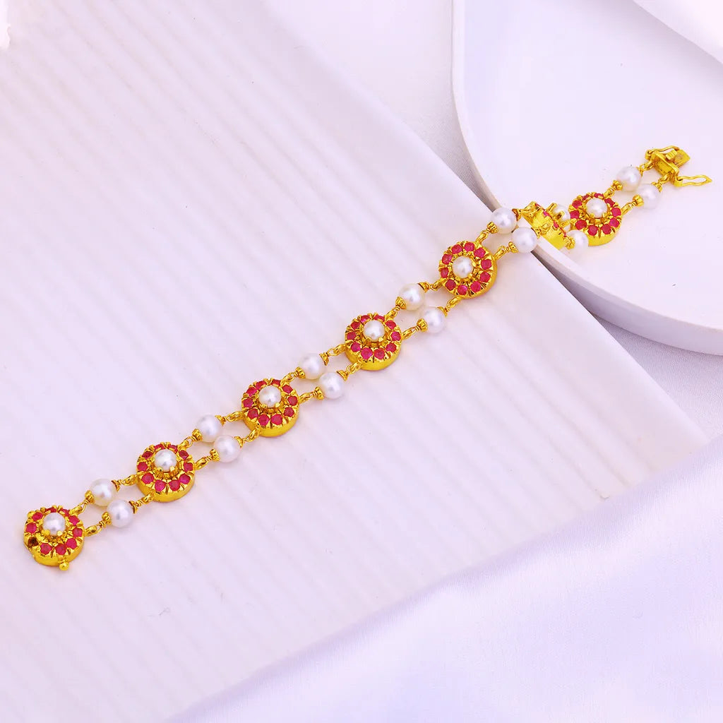 Romance radiates from the rubies and pearls adorning Sujhal's luxurious bracelet. Lavish yourself with this indulgence or gift it as a token of enduring love. Lustrous ruby gems are perfectly complemented by luminous pearls in this timeless, yet modern design. An investment piece that transcends trends, the Pearly Azalea bracelet elevates any look with effortless luxury. For the woman who savors life's finer things, this ruby and pearl bracelet is a precious memento she'll treasure.