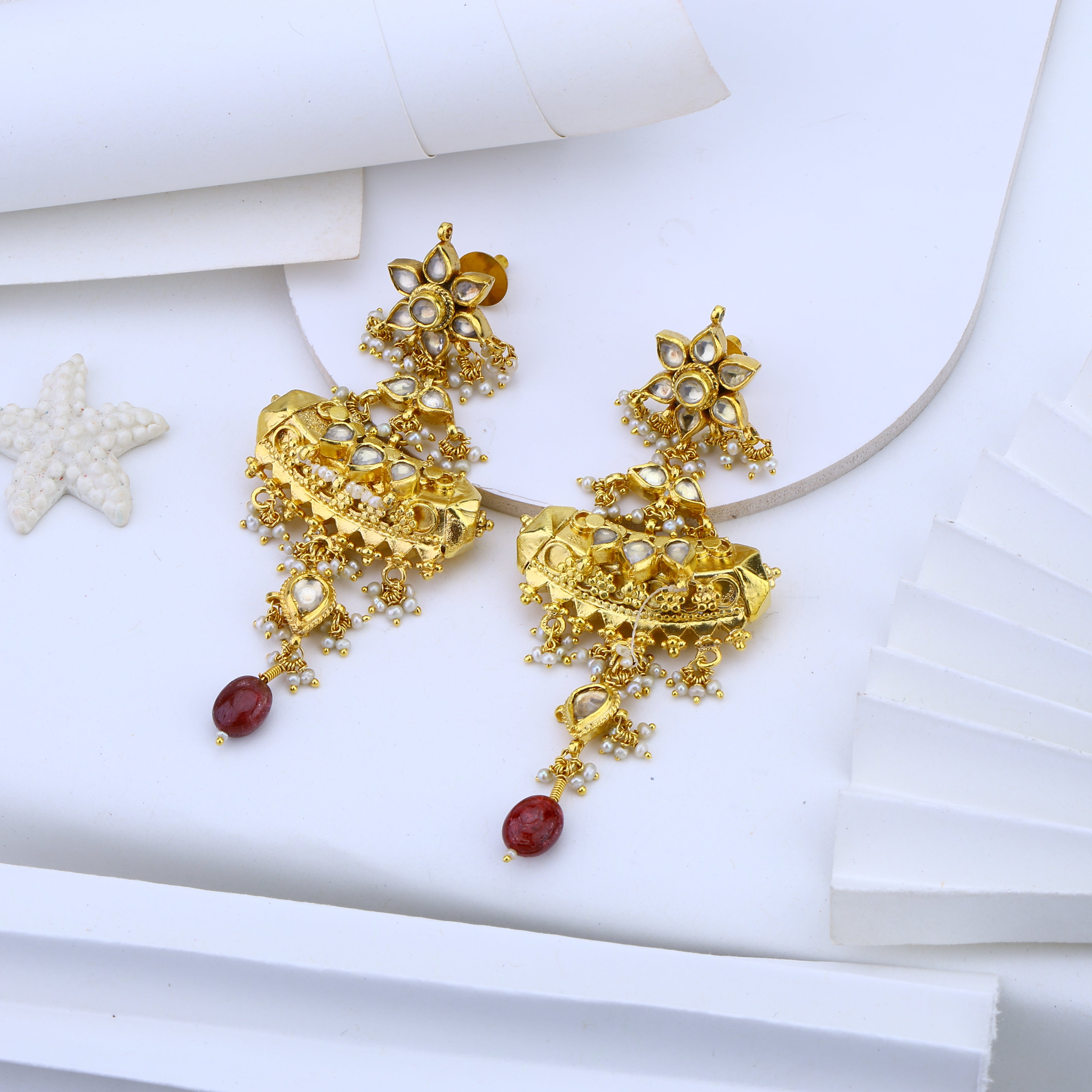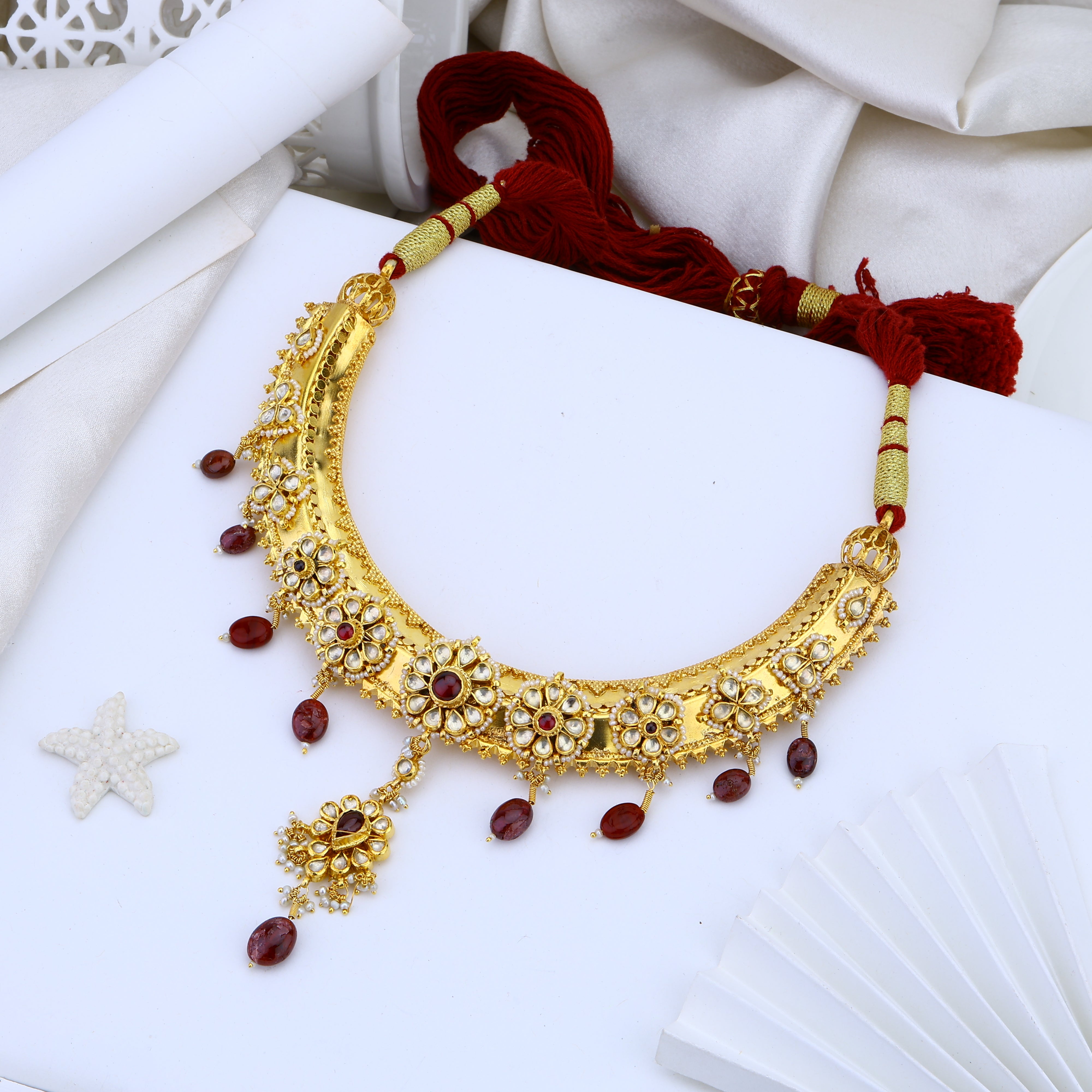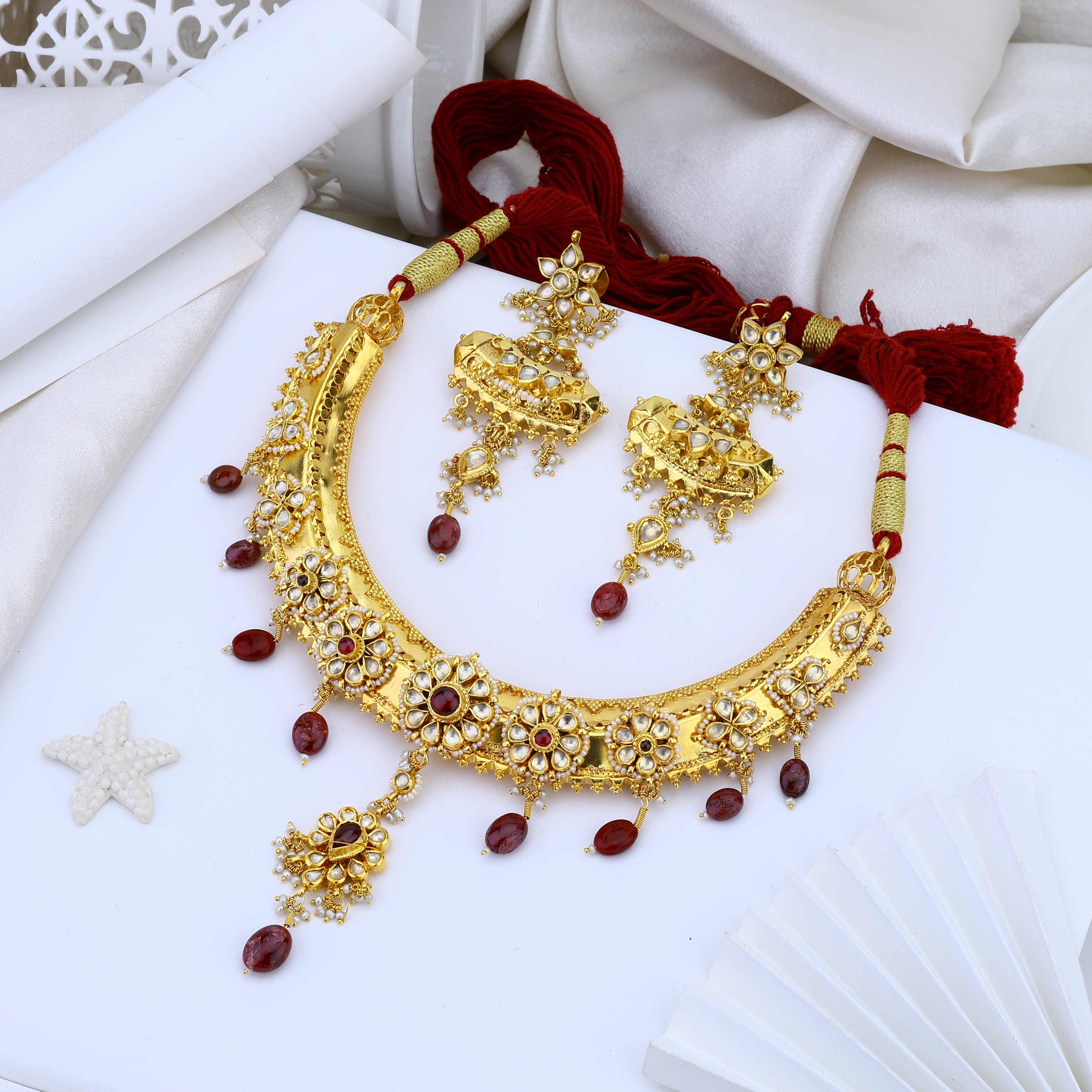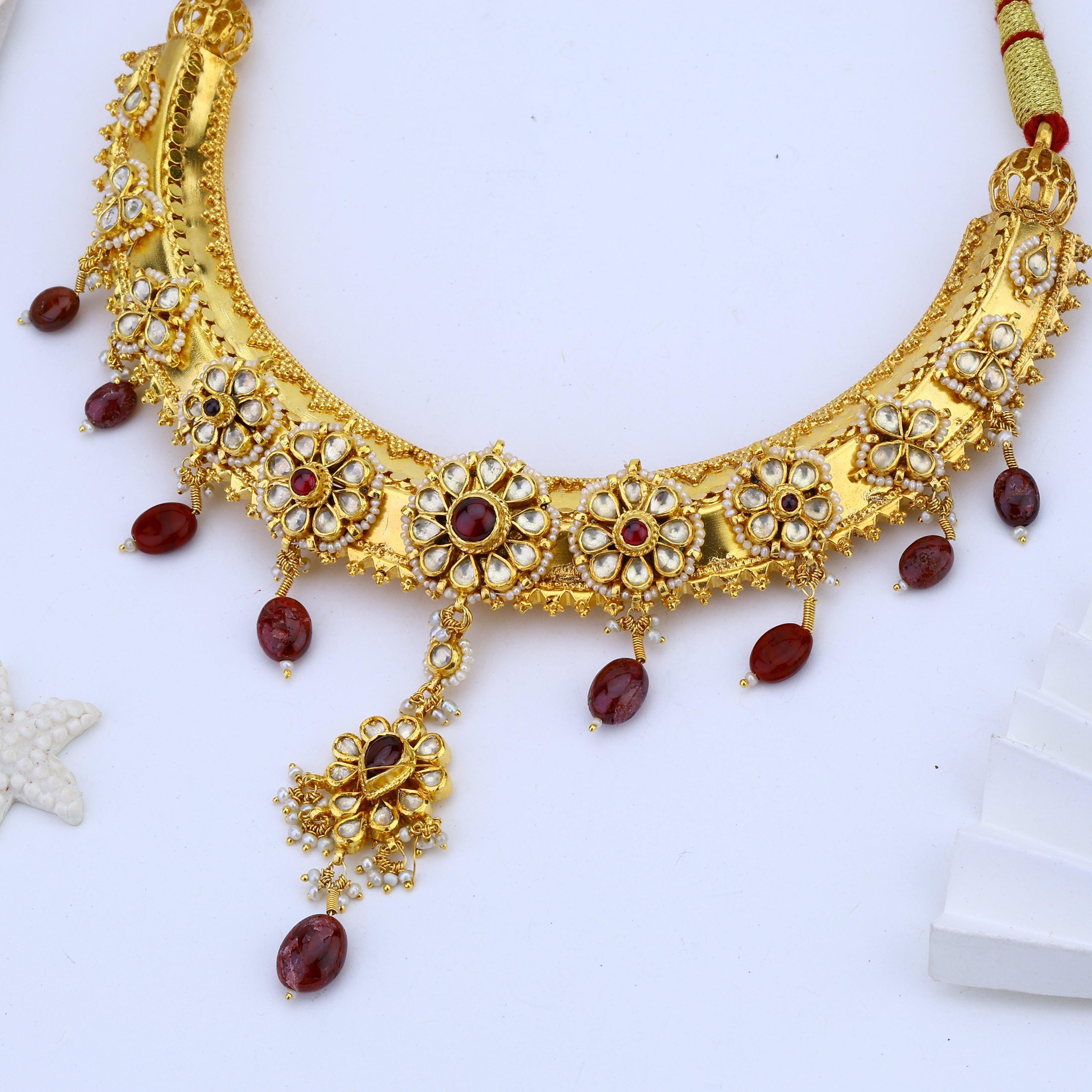 When only the finest will do, slip on this breathtaking necklace set. Sumptuous ruby gemstones catch the light with their deep crimson sparkle, while lustrous khakho pearls radiate an opalescent glow. Finely faceted moissanite accents add brilliant shimmer to this ornate heirloom. But it's the meticulous jadau craftsmanship that transforms these gems into wearable works of art. Each stone is set by hand, allowing every detail—from the intricate carvings to the luxe 18K gold plating—to shine through. This is jewelry that deserves a spotlight, whether adorning your neck for formal galas or elevating your everyday ensembles. Dripping in opulence yet infinitely wearable, this necklace set is what happens when centuries-old Indian artistry meets contemporary glamor. Let the compliments pour in.