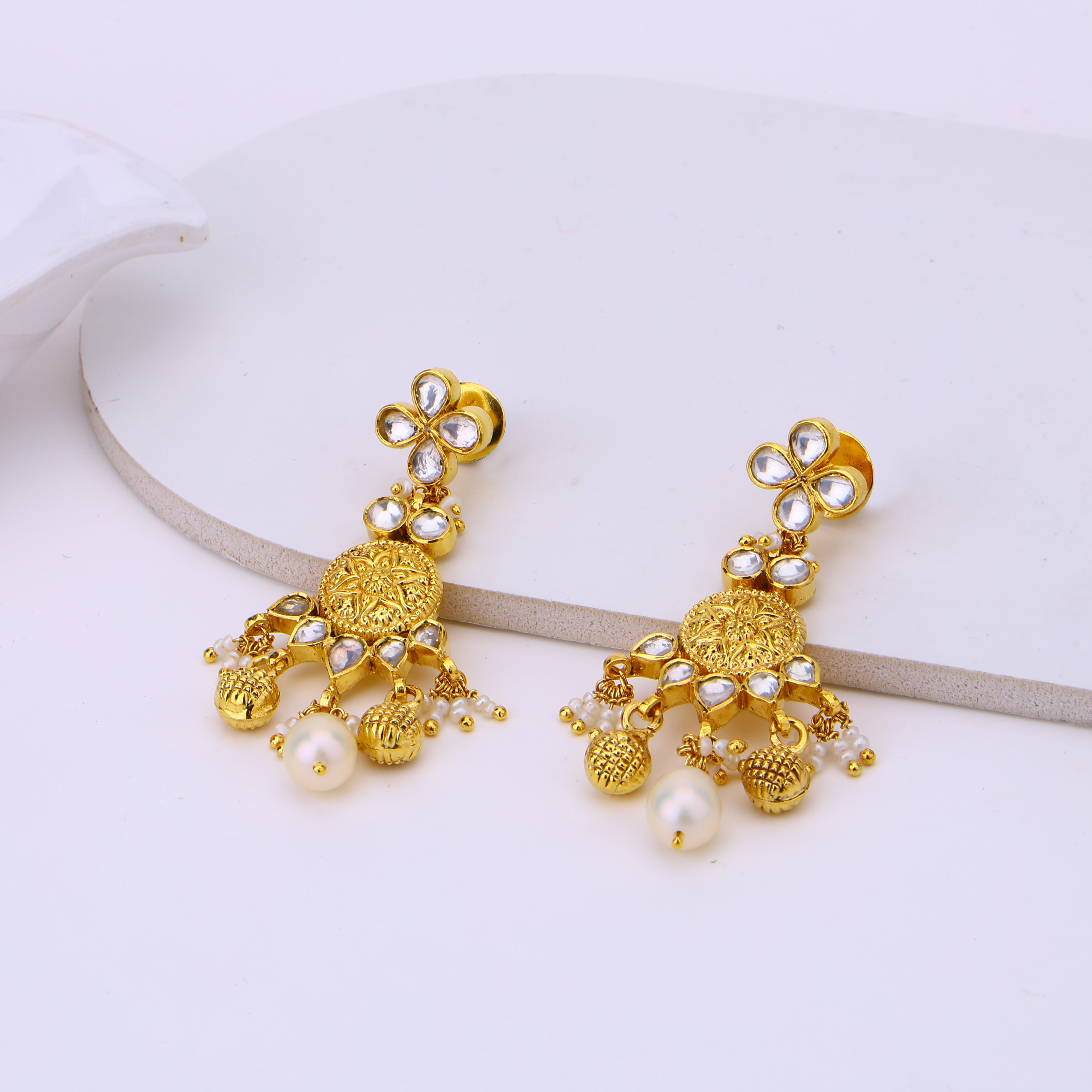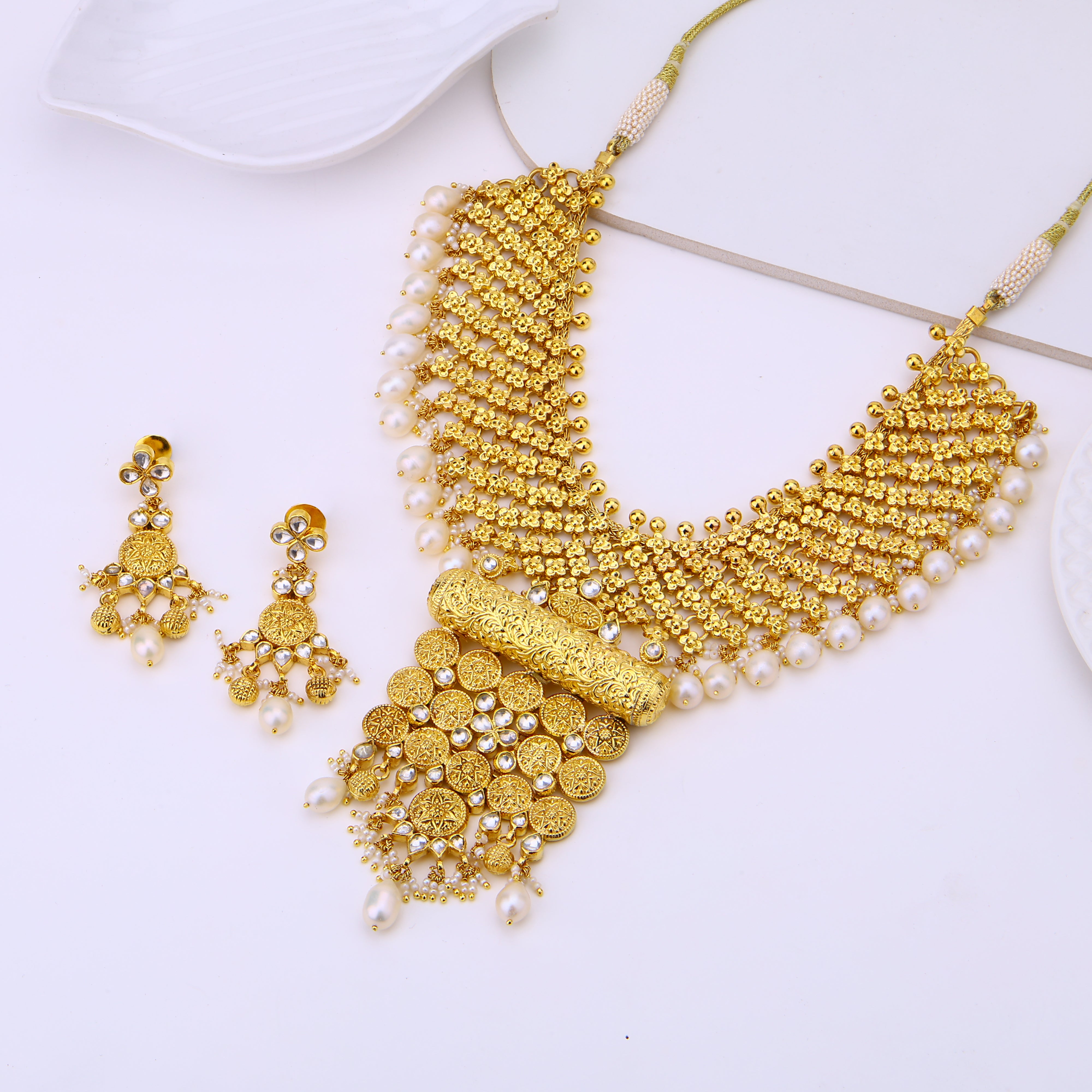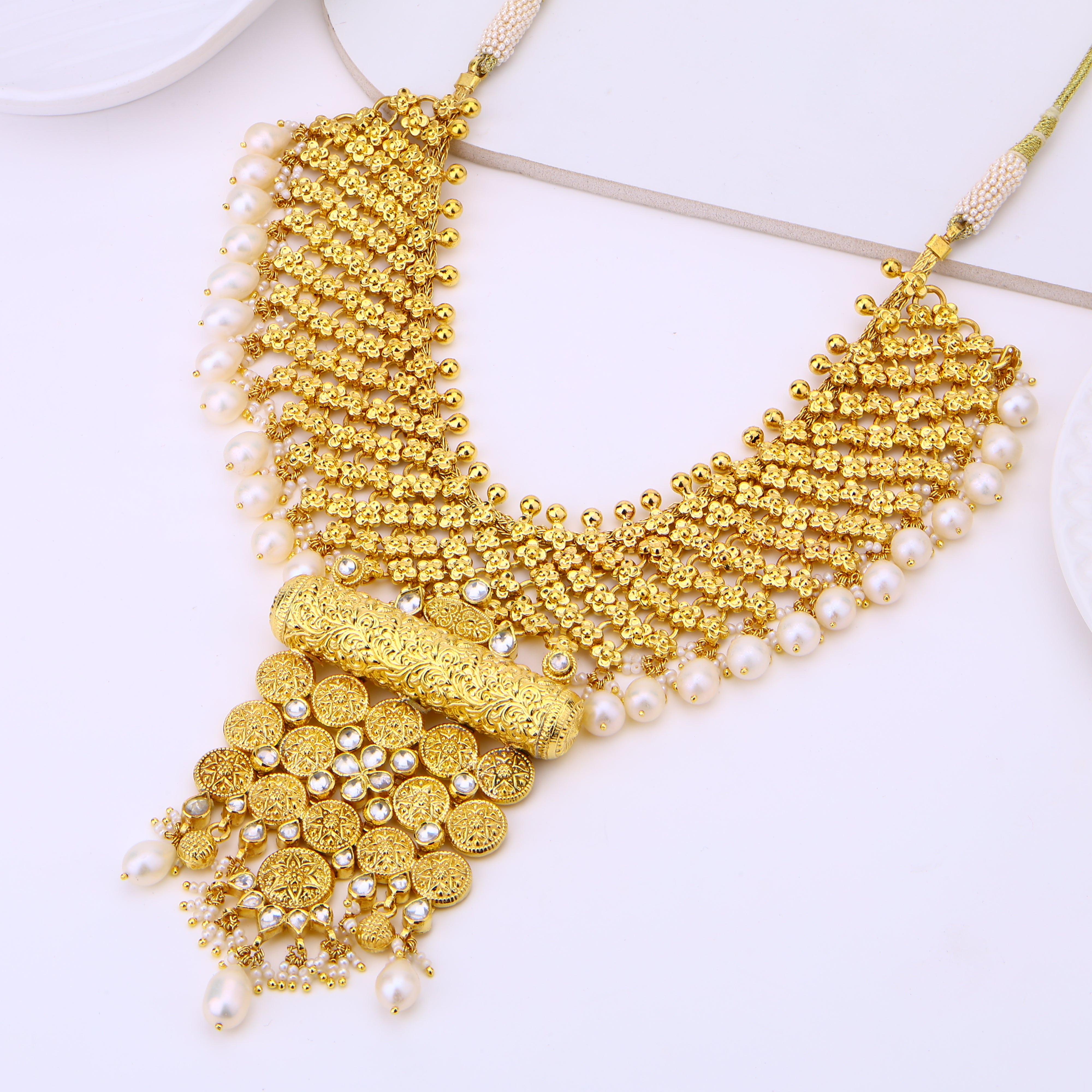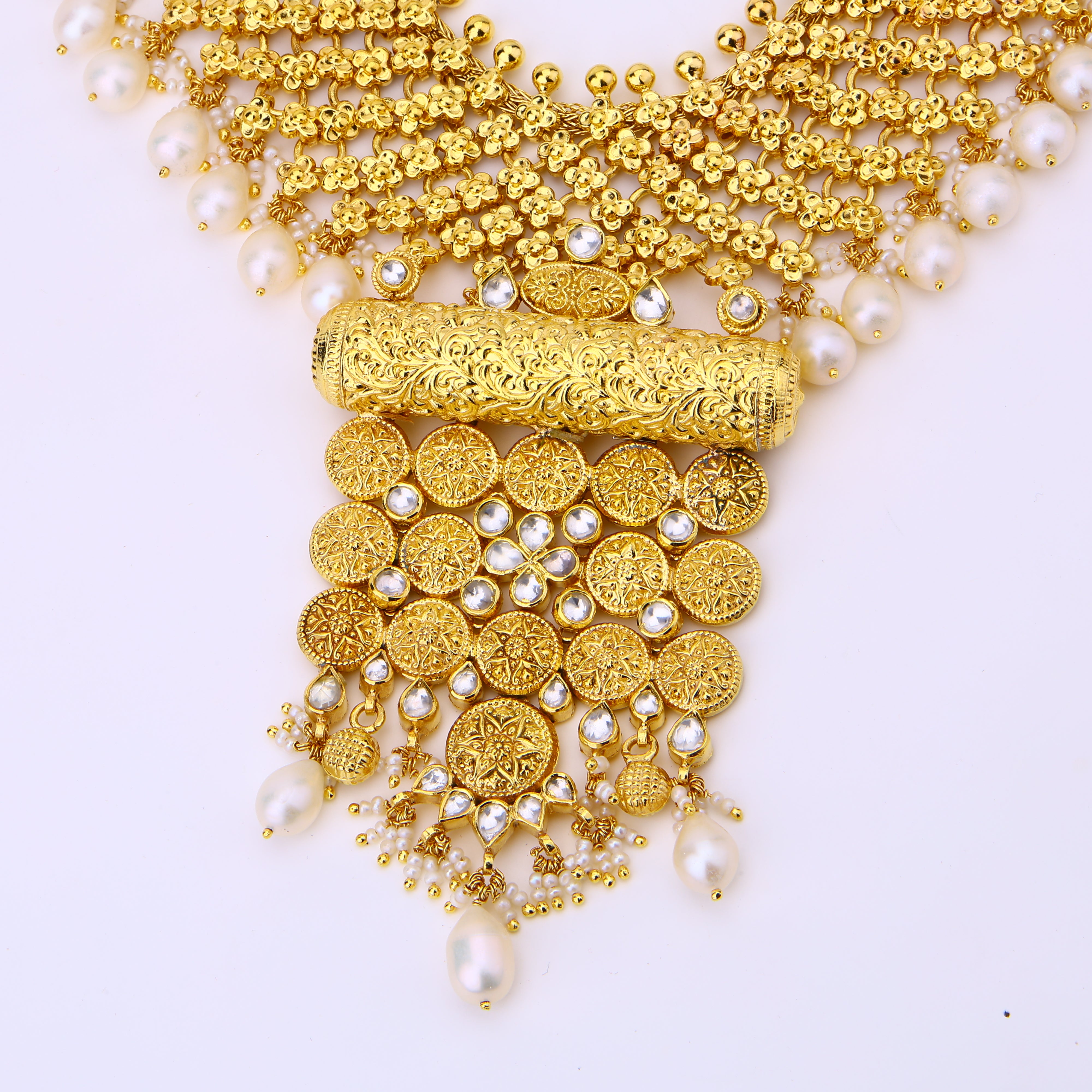 Effortless glamor meets everyday luxury. This show-stopping pearl necklace set by Sujhal elevates any look with its lavish blend of khakho pearls and shimmering moissanite gemstones. Set in an opulent 18K gold plated design, the necklaces exude timeless elegance through impeccable jadau craftsmanship. From the office to date night, these lustrous strands instantly dress up any outfit with an air of refined sophistication. Whether layered or worn solo, the moissanite gems add an eye-catching sparkle against the luminous pearls. A versatile jewelry set to treasure for years, the Ebb & Elan necklaces are proof that true luxury lies in the details. Indulge in everyday opulence with these exquisite, heirloom-worthy pieces.