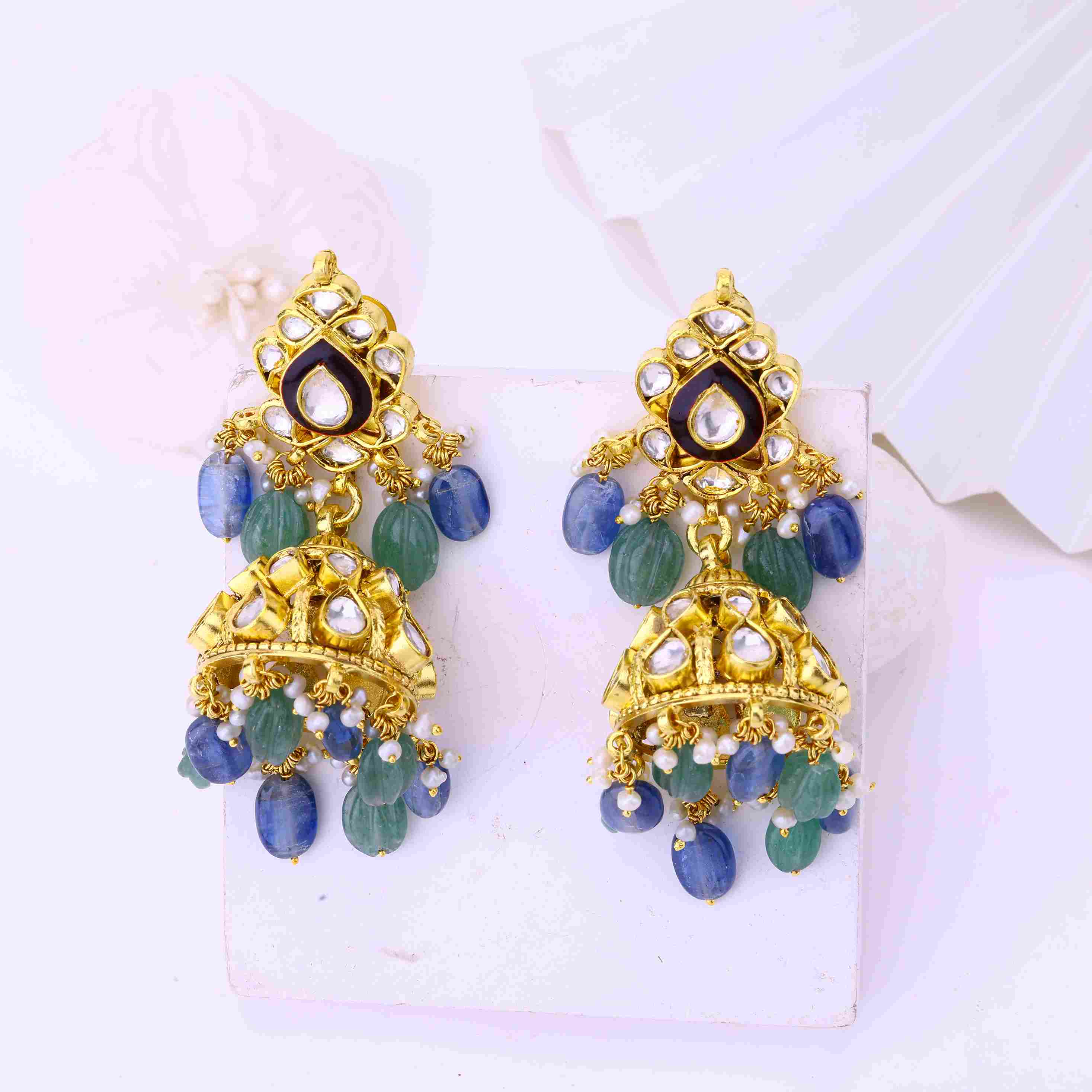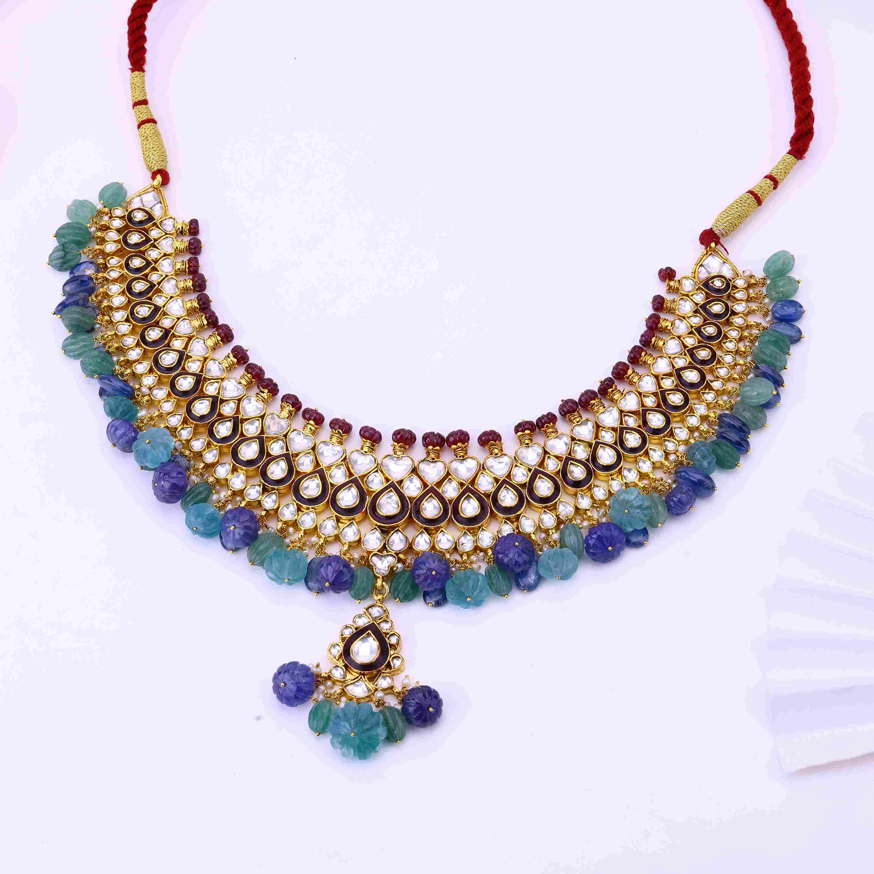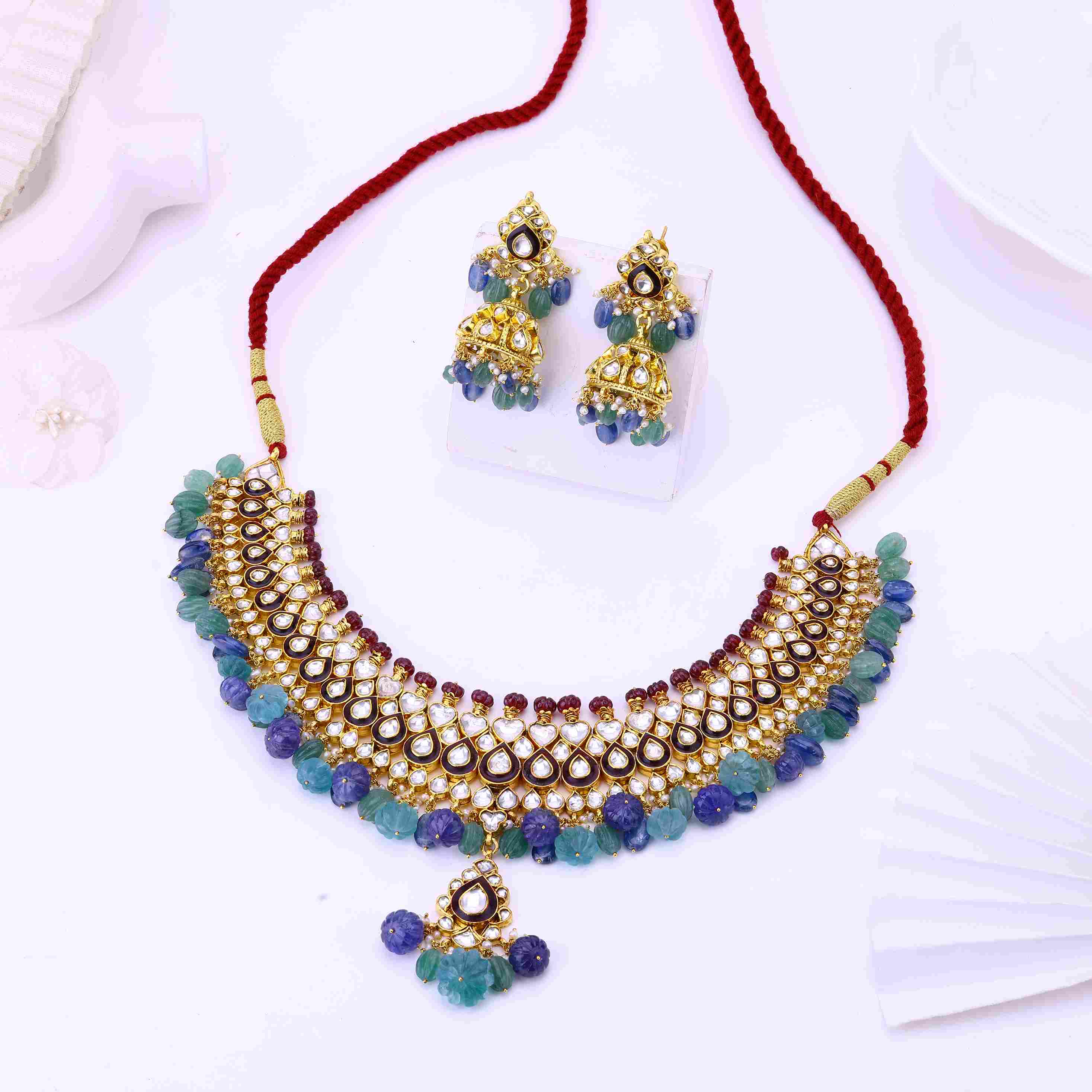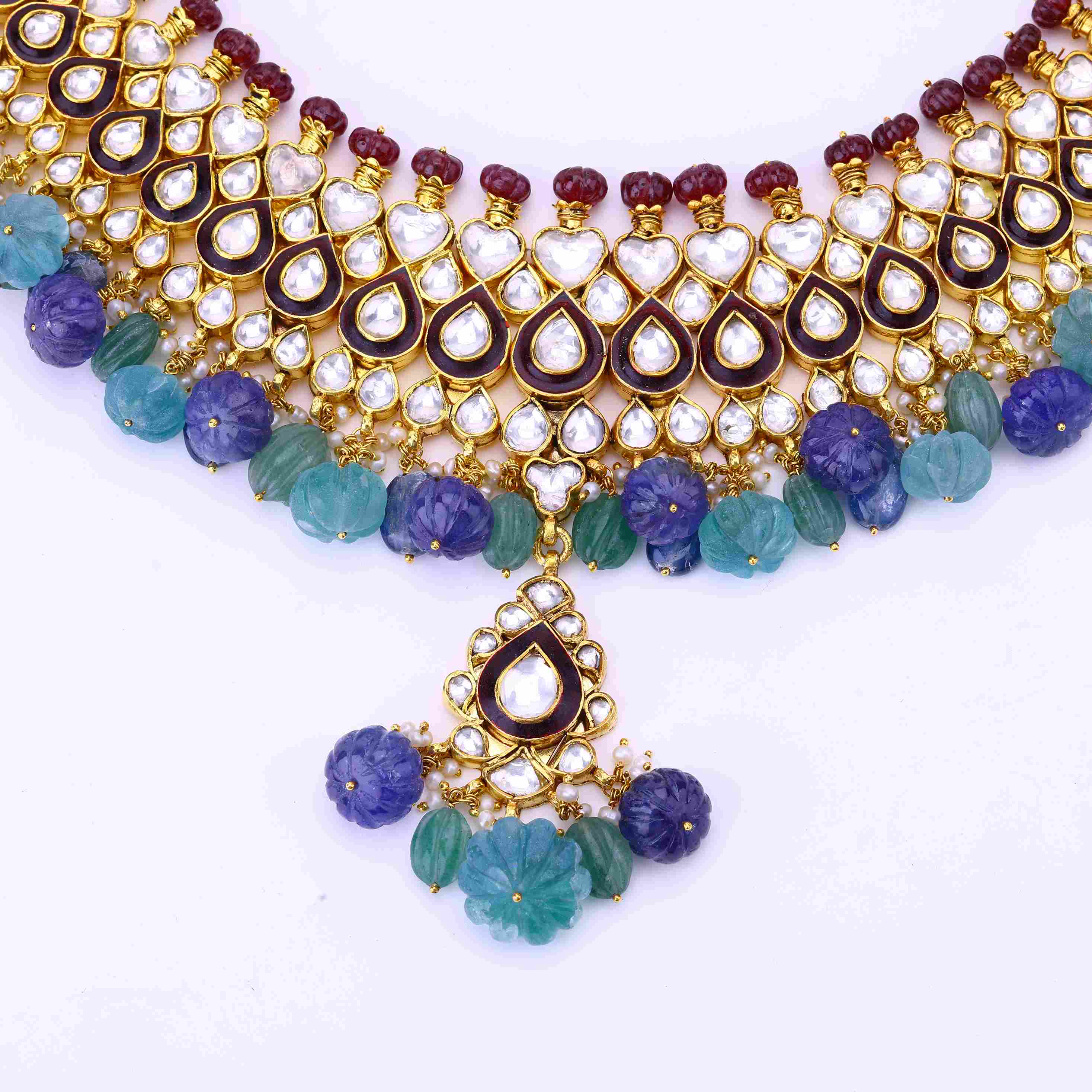 A gemstone mosaic of kaleidoscopic color, this luxury necklace set redefines what it means to shine. Emerald, tanzanite, ruby, and moissanite stones catch the light with breathtaking prismatic flair, thanks to Sujhal's signature Jadau craftsmanship that artfully embeds each gem into lustrous enamel. 18K gold plating lends a radiant finish that complements the eye-catching sparkle. Slip on the "Elaras Prism" set to elevate any outfit with lavish brilliance and sophistication. Whether gracing an elegant evening out or bringing understated opulence to casual days, this exquisite, heirloom-quality necklace is a versatile statement piece that makes you feel like modern-day royalty. Let its rich colors and luxurious materials dazzle admirers and ignite confidence within.