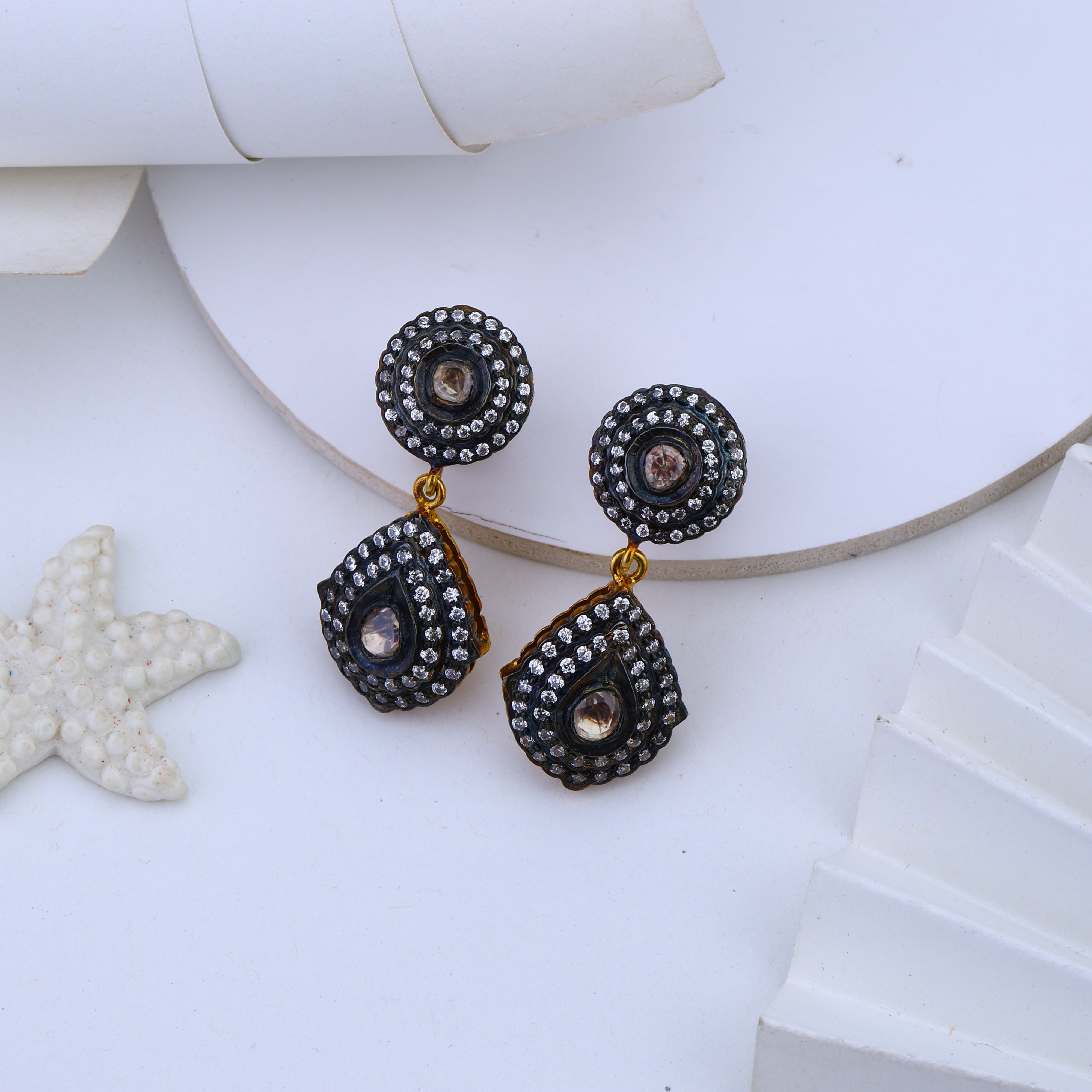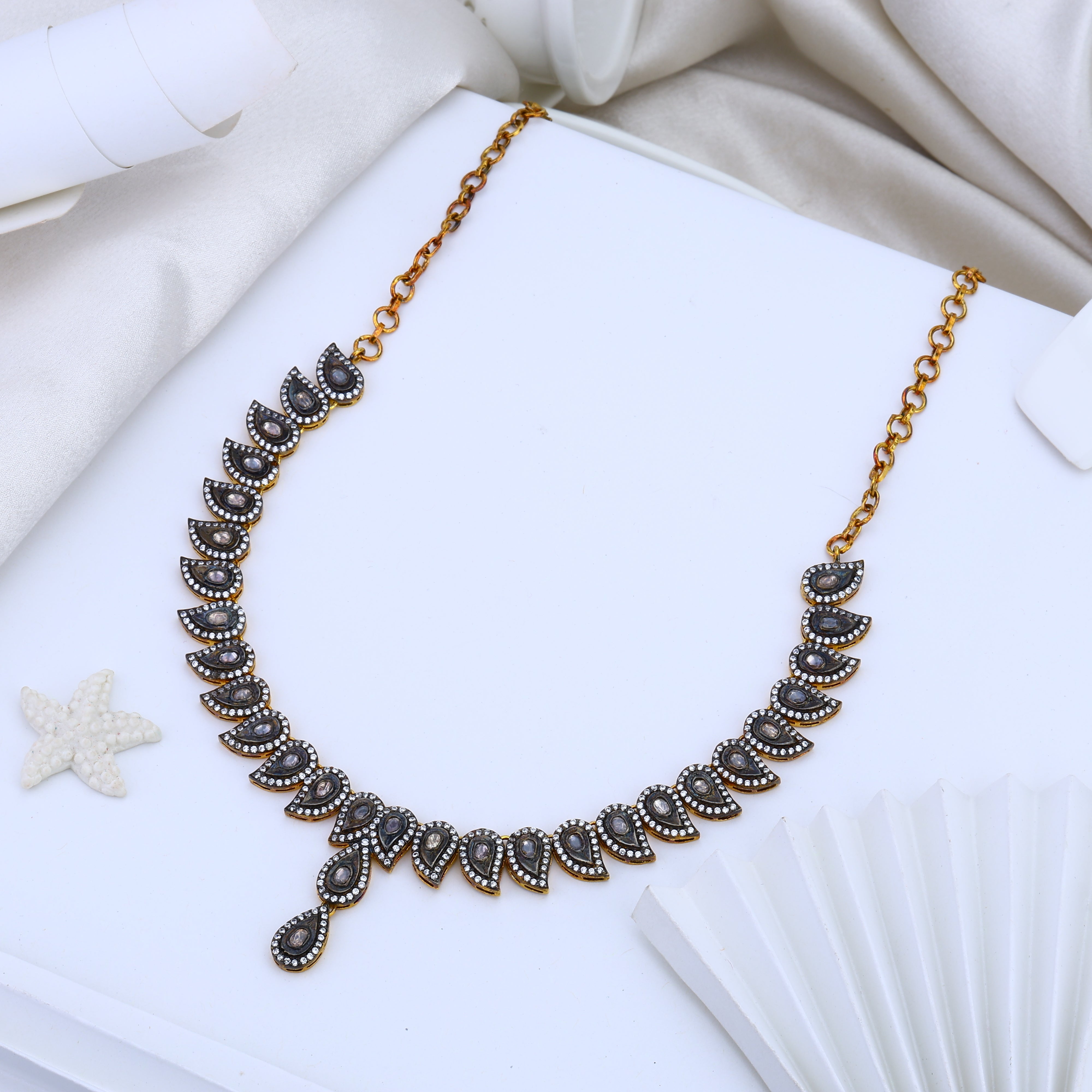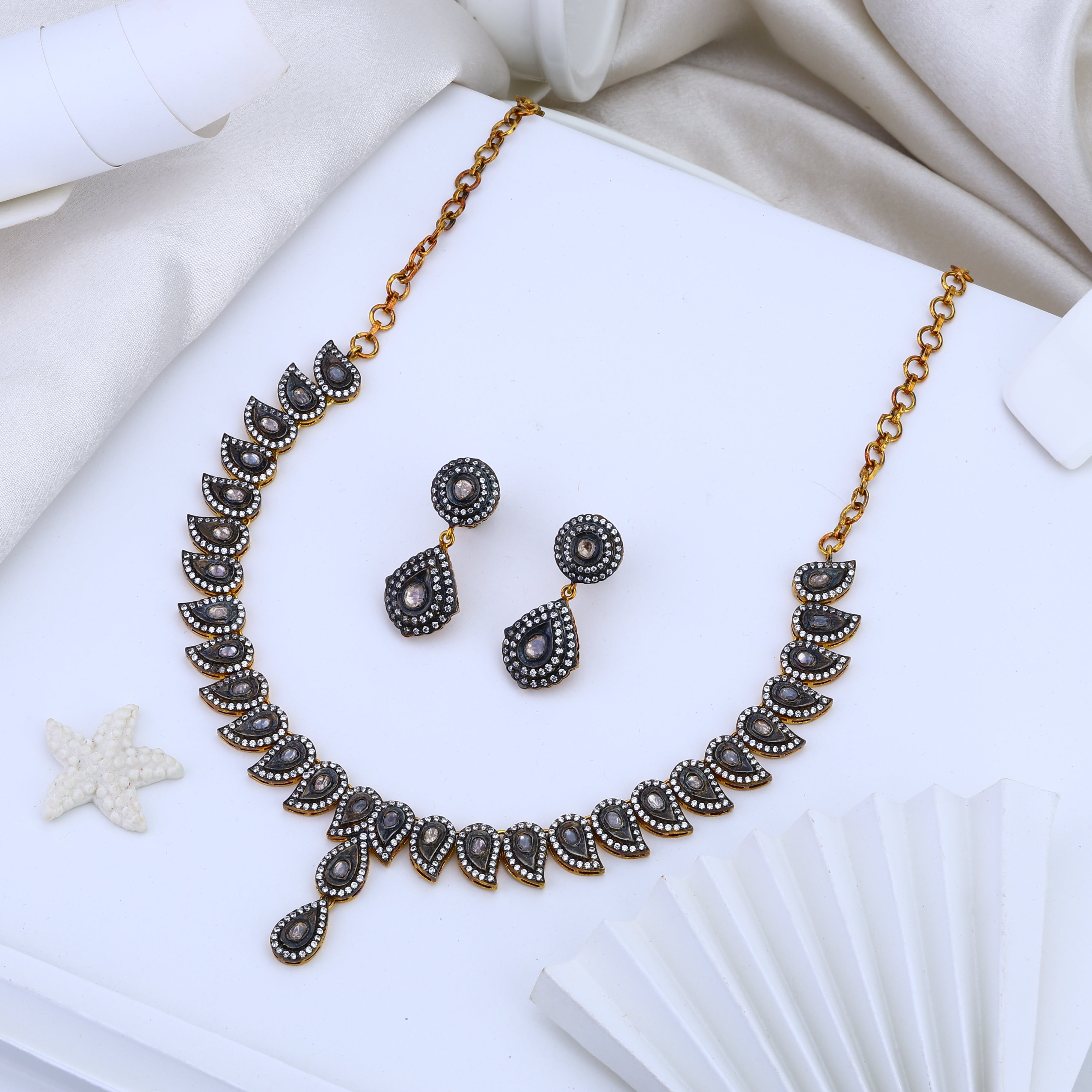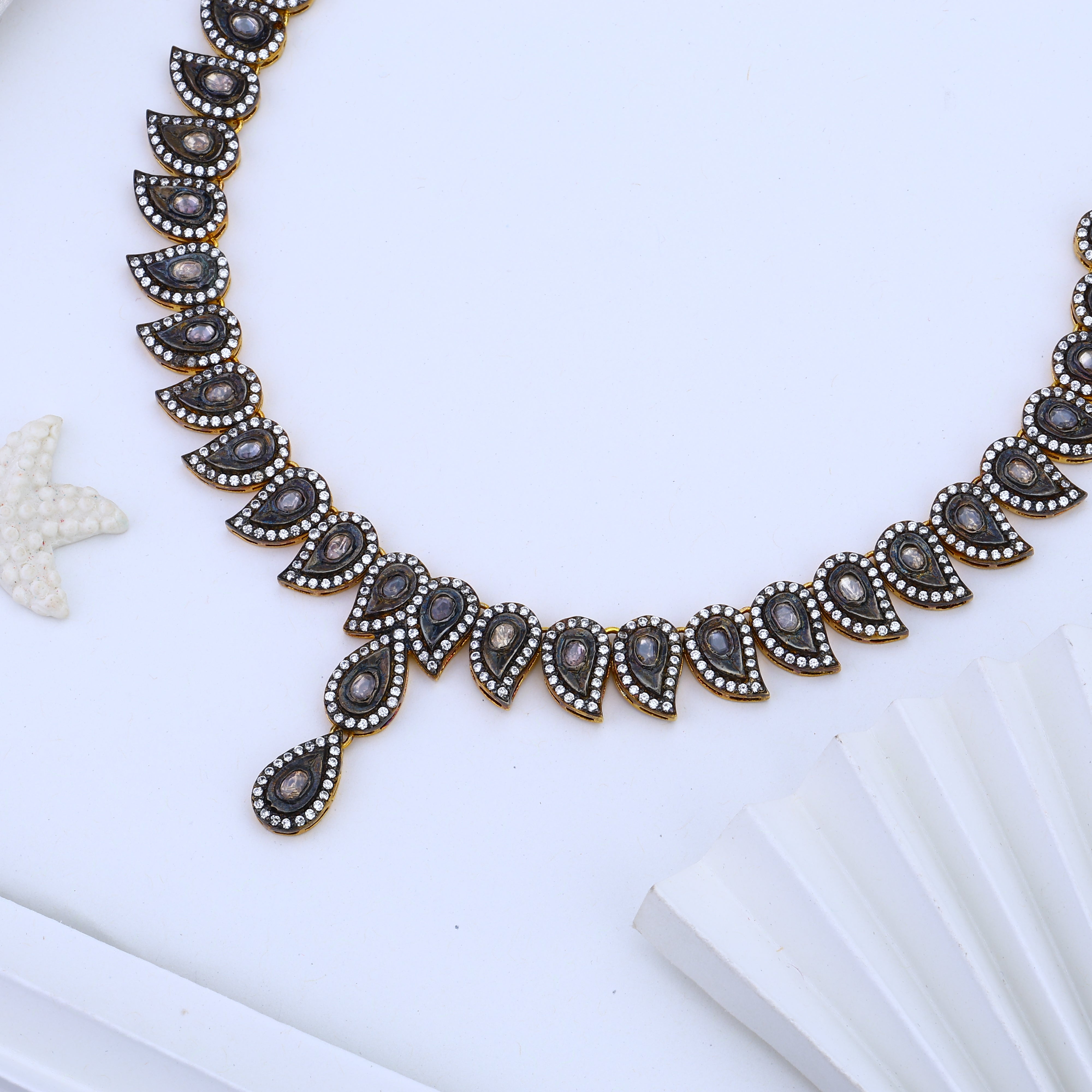 Affordable luxury and exquisite artistry unite in this stunning necklace set. Radiating diamond-like brilliance, each piece shimmers with meticulously set moissanite gemstones and premium Swarovski diamonds. But the true magic lies in the 18K oxidized gold that imparts an elegant blackened luster. Handcrafted with intricate Bengali techniques, every necklace is a wearable masterpiece that celebrates the convergence of time-honored craftsmanship and modern sophistication. With its sleek oxidized finish and sparkling gems, this jewelry seamlessly transitions from day to night, imbuing any look with an air of exclusivity. Invest in artisanal quality without the premium price tag—affordable luxury has never looked so brilliant.