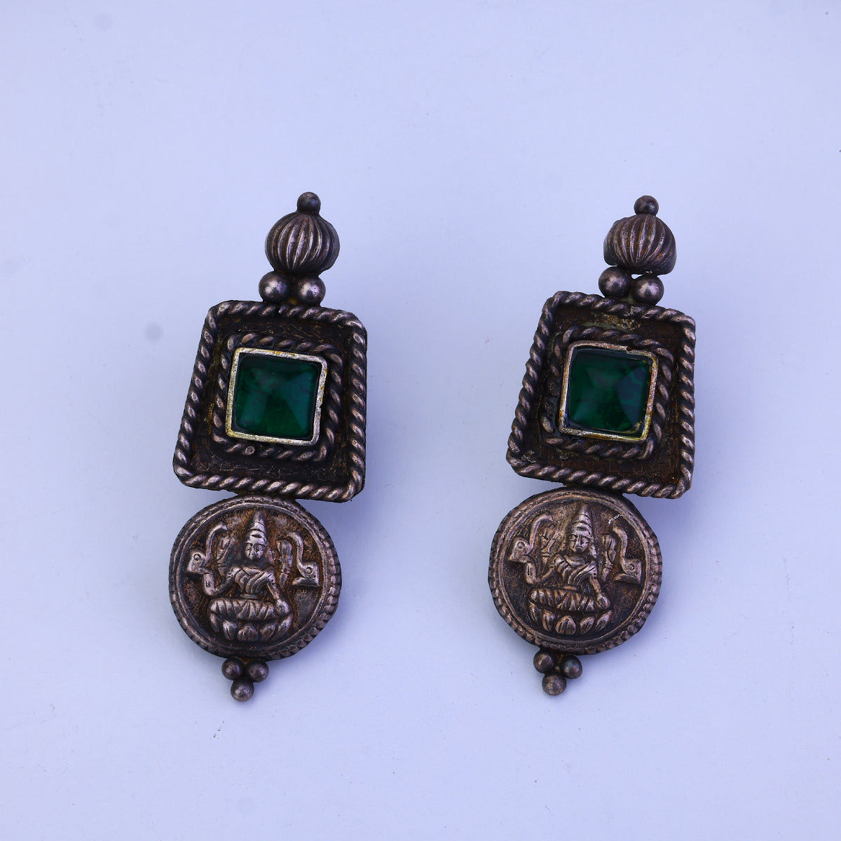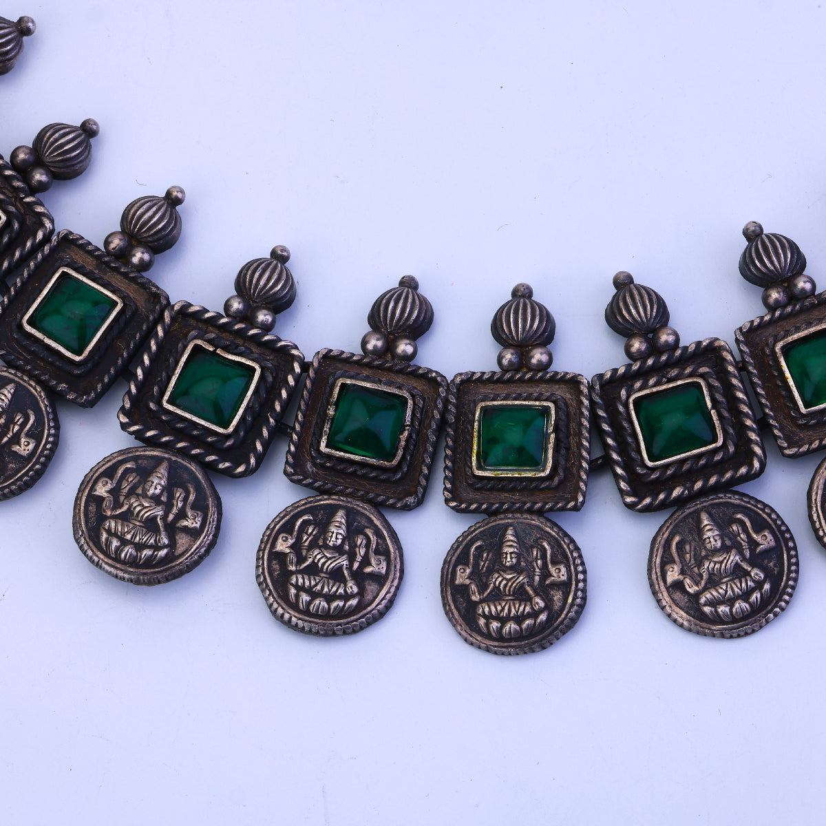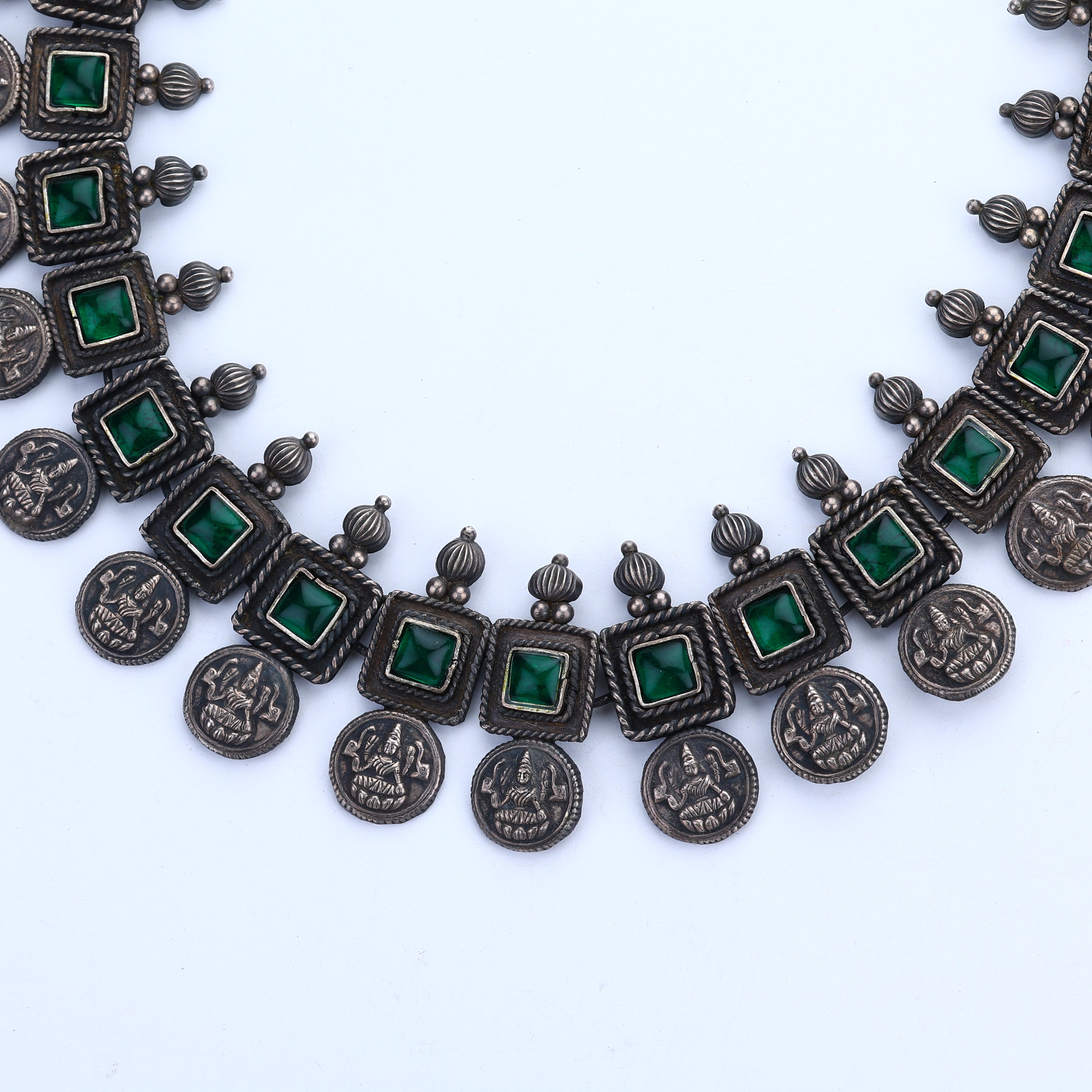 An exquisite marriage of timeless luxury and bold modernity, this emerald necklace set blazes a trail all its own. Crafted by skilled Bengali artisans, each opulent strand radiates with the vibrant fire of genuine emeralds, their facets sparkling like liquid jade. Yet it's the oxidized plating that steals the show, enveloping the gemstones in a rich, smoky patina for a look that's equal parts regal and edgy. This isn't a piece that follows trends—it sets them. With its seamless blend of precious emerald and oxidized metals, this necklace is a true sartorial rebel, a radiant rebel destined to turn heads. Drape it over an LBD for maximum impact or let it elevate your casual chic. However you wear it, one thing's for certain: this necklace is luxury, emboldened.