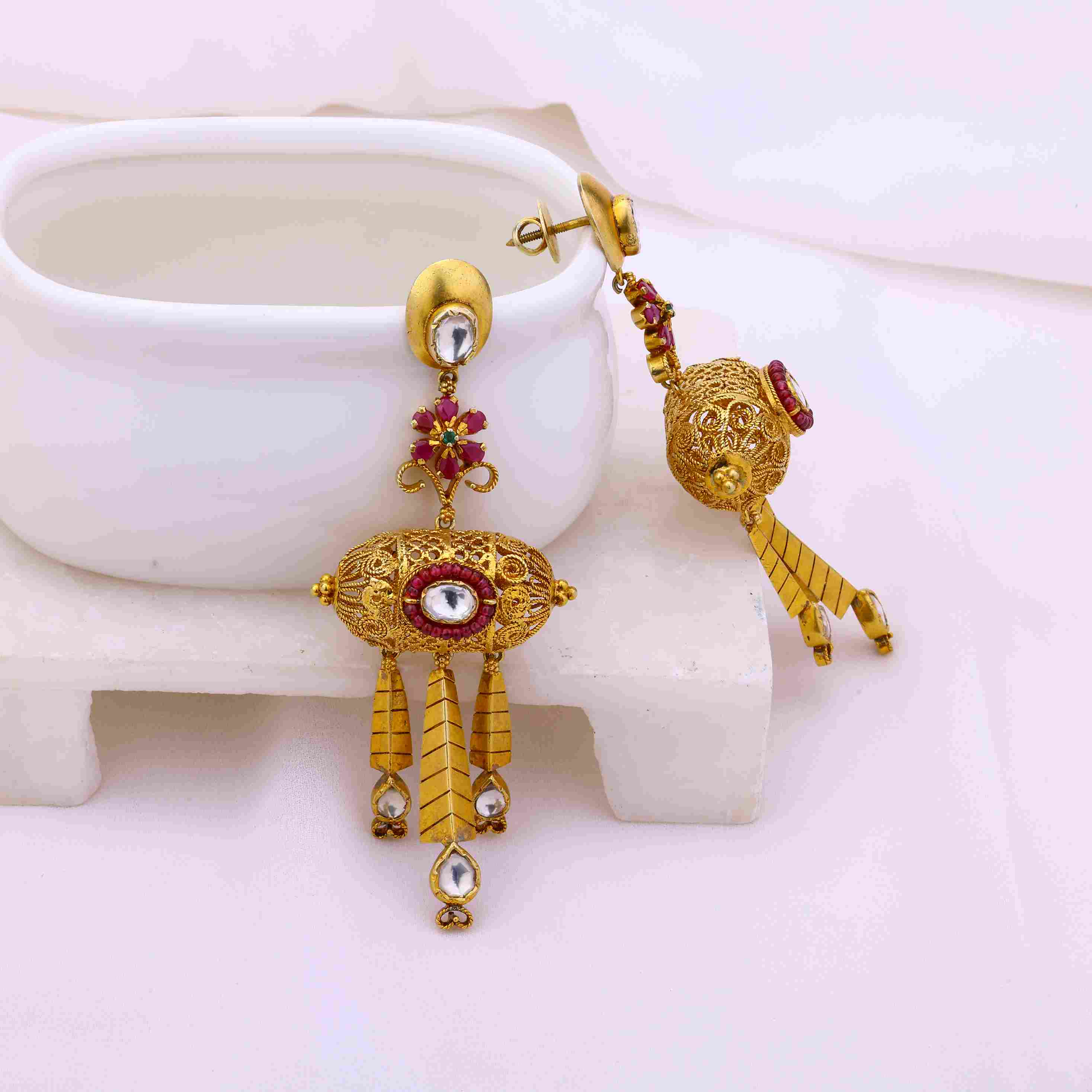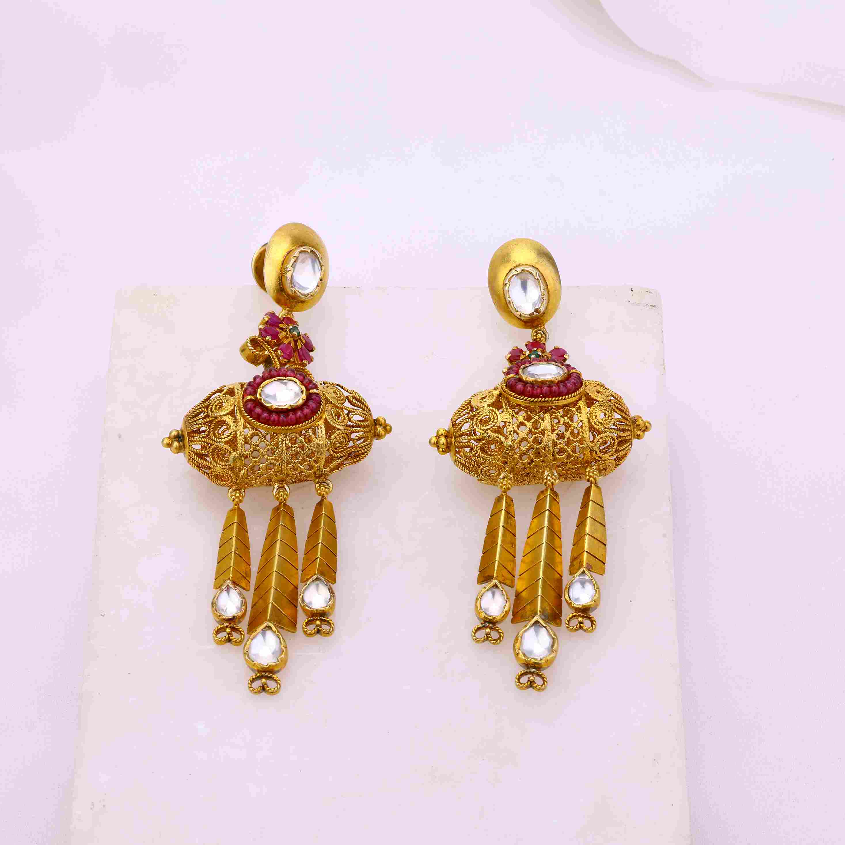 These ruby splendor earrings are fit for a queen. Lavish rubies glisten like pomegranate seeds amidst a shimmering field of moissanite gemstones, each cut to fiery perfection using the revered polki technique. Handed down through generations of Indian artisans, this ancient craft lends an heirloom aura of regal extravagance. Every facet catches the light in a kaleidoscopic whirl, igniting your lobes with vibrant, blood-red opulence. No mere bauble, these ruby stunners are a statement of grandeur, an investment in heirloom luxury. With a rich 18K gold plating that enhances the jewels' molten allure, these aren't everyday earrings—they're destined for the grandest soirees and most decadent affairs. After all, when you want to feel like royalty, only rubies will do.
