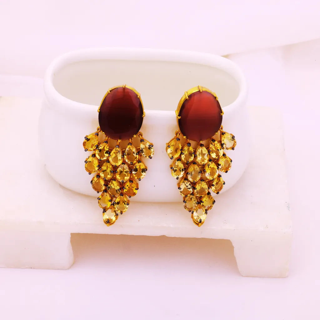 Runway-ready opulence meets artisanal flair in these stunning Moissanite Magic earrings. Fiery citrines and rich rubies make an eye-catching statement, radiating luxury and confidence. The lustrous gemstones are set in an exquisite 18K gold and black rhodium blend, showcasing intricate Bengali craftsmanship that fuses centuries-old techniques with modern style. These aren't just earrings—they're miniature works of art that elevate any look from day to night with effortless glamor. Don't settle for basic baubles. Indulge in the bold sophistication of Moissanite Magic and let these showstopping earrings be the pièce de résistance of your accessories collection. Consider them a stylish suit of armor to face each day with grace and flair.