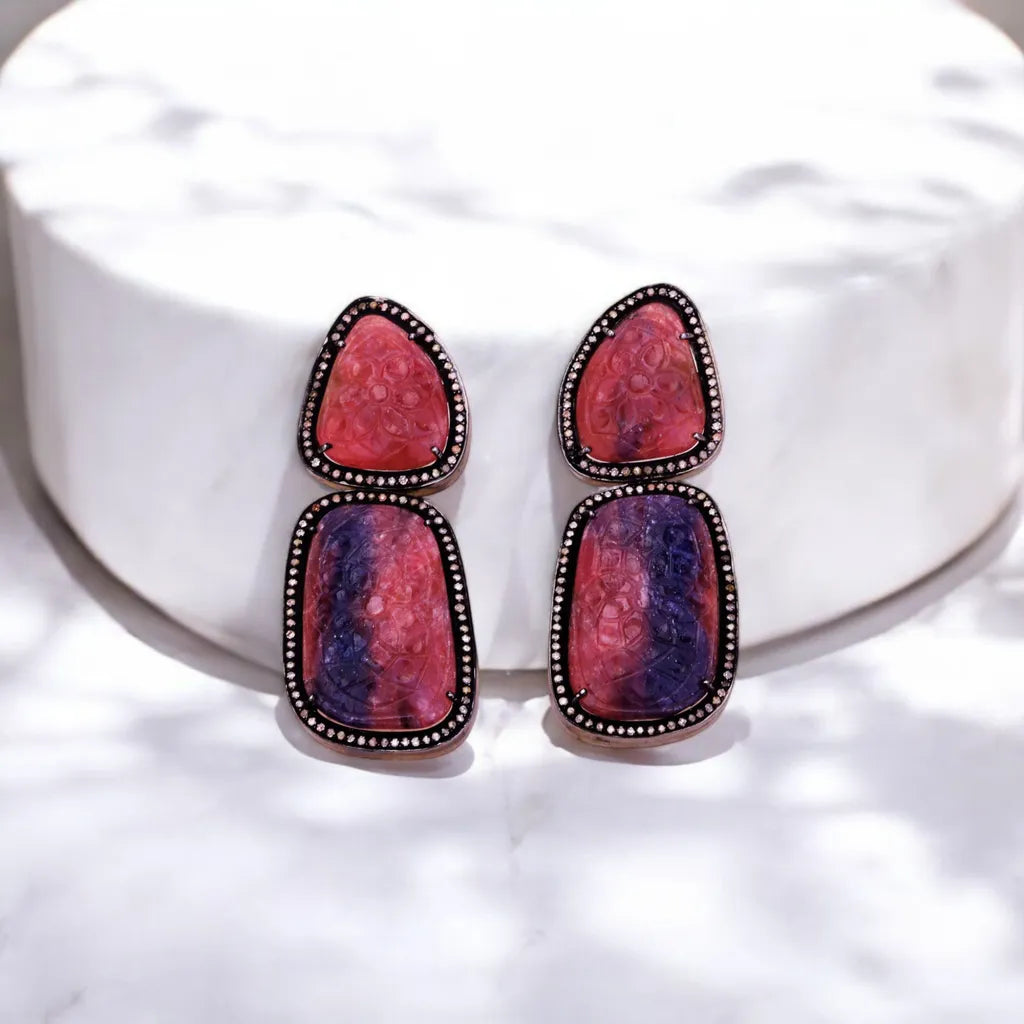 Ravishing hardly does justice to these earrings. Carved from deep, lush rubies that exude glamor and opulence, these stunners turn heads with their vibrant crimson hue. But the rubies are just the spark. The true fire comes from the blackest of black rhodium plating, its inky sheen lending an edge of dark mystique. Delicate diamond accents twinkle like starlight, elevating the earrings' regal aura. But the real gem? The Bengali craftsmanship, each pair handmade by artisans carrying on a centuries-old tradition. It's more than luxury—it's legacy. So go ahead, paint the town red (and black). After all, shouldn't jewelry be as intoxicating as a fine ruby wine? Ravishing, indeed.