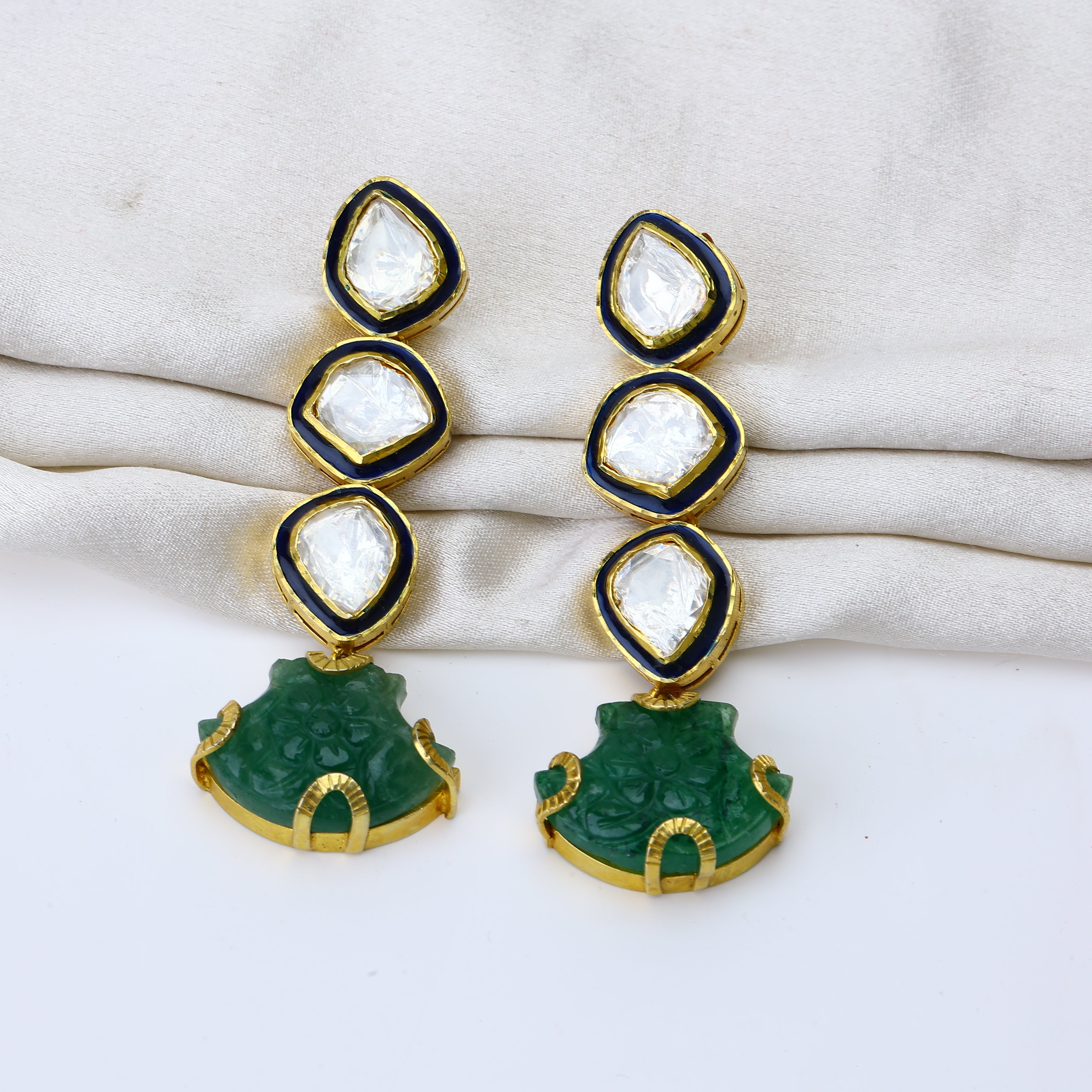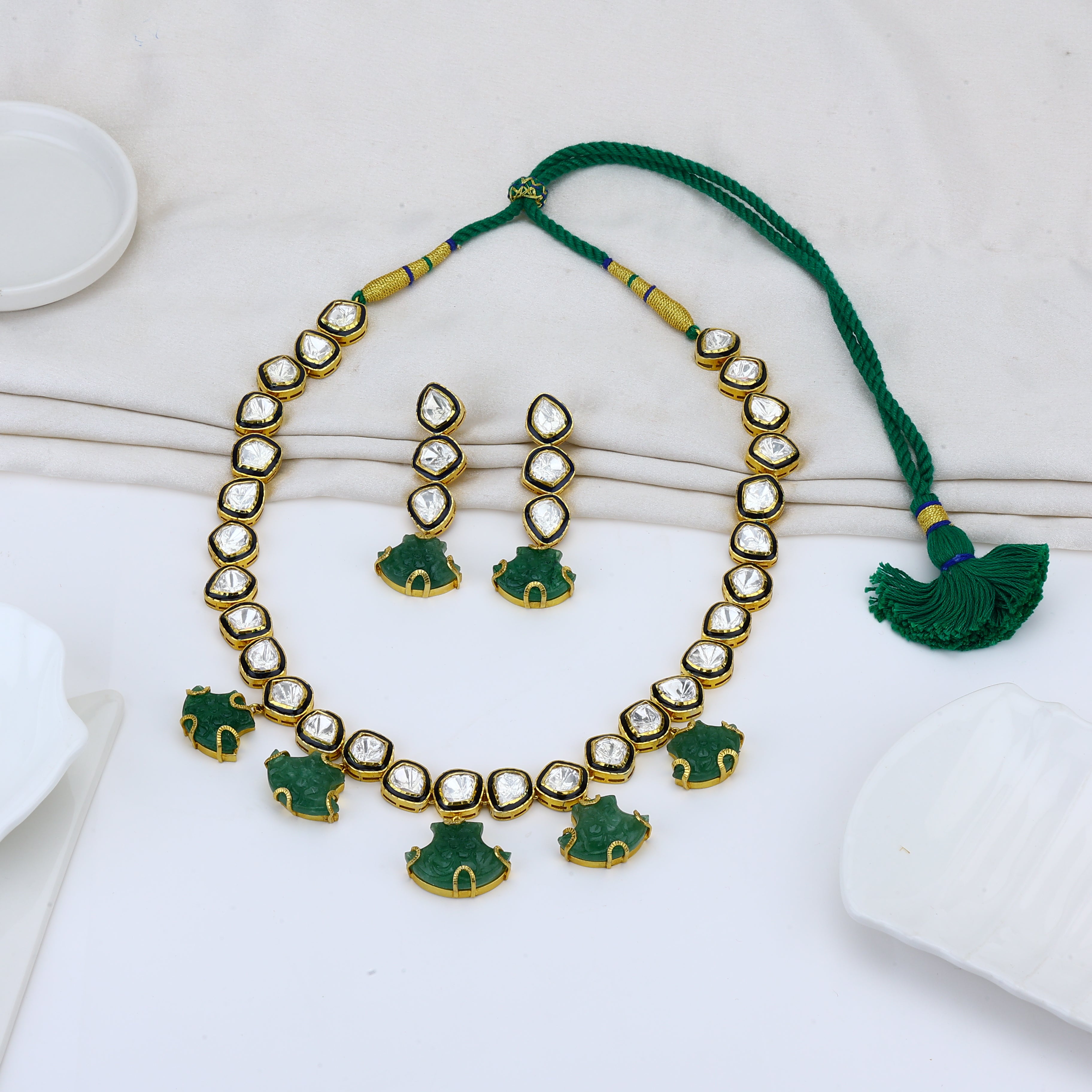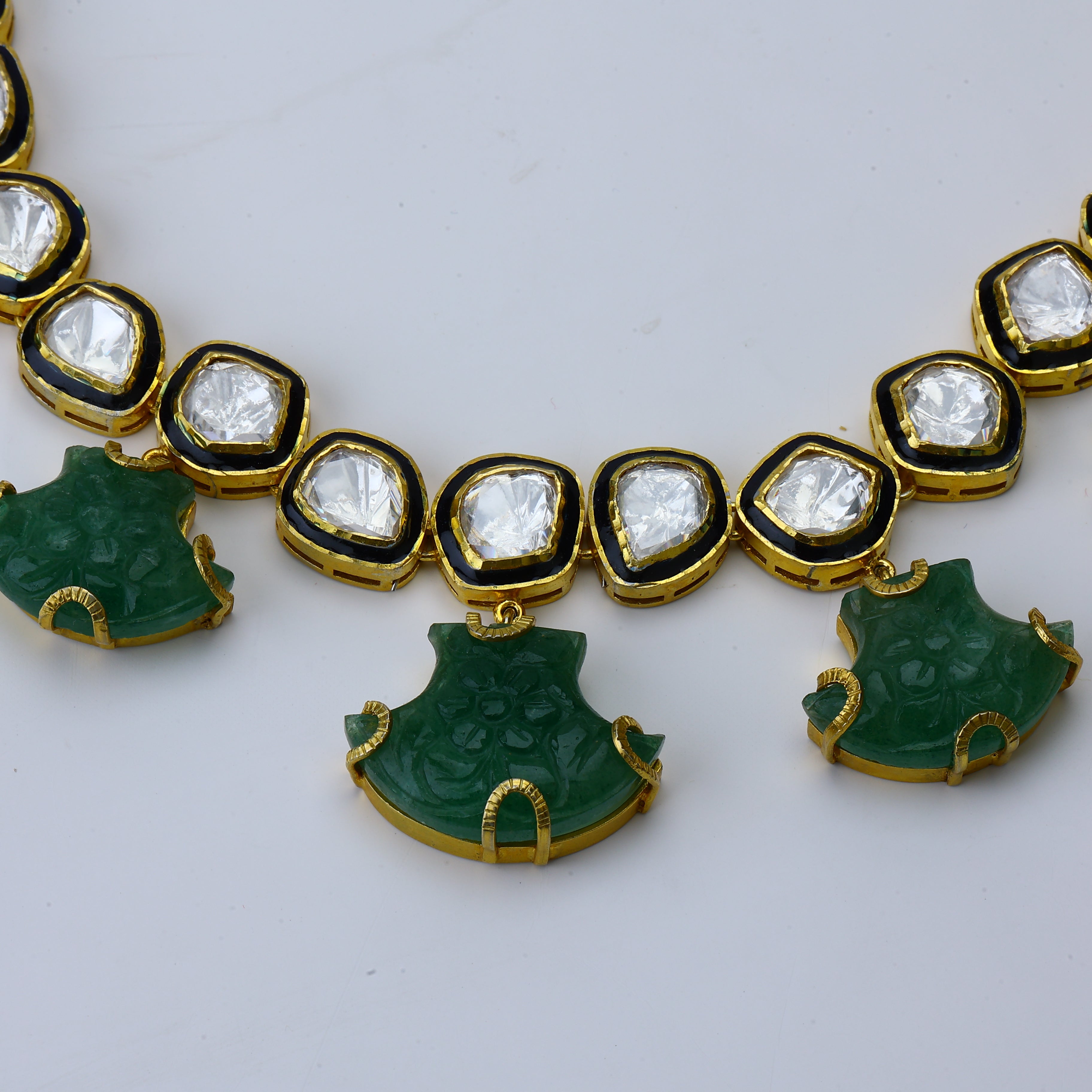 The Goddess of the Grove necklace set answers the call of nature with a lavish voice. Front and center, lush carved emeralds shine like a clearing in an ancient forest—a verdant jewel begging to bask in the sun's warm rays. Surrounding this verdant marvel, moissanite gems twinkle brighter than the morning dew on new buds. Yet these natural accents achieve peak glamor when draped in an 18K gold plating—as extravagant as a sunrise glimpsed through a canopy of trees. But the true magic lies in the Bengali craftsmanship, which marries earthy luxury with wearable opulence. With roots in artisanal tradition yet a thoroughly modern sparkle, this necklace set is a living embodiment of timeless beauty. Adorn your neck with this emerald treasure, and the world is your jewel box.