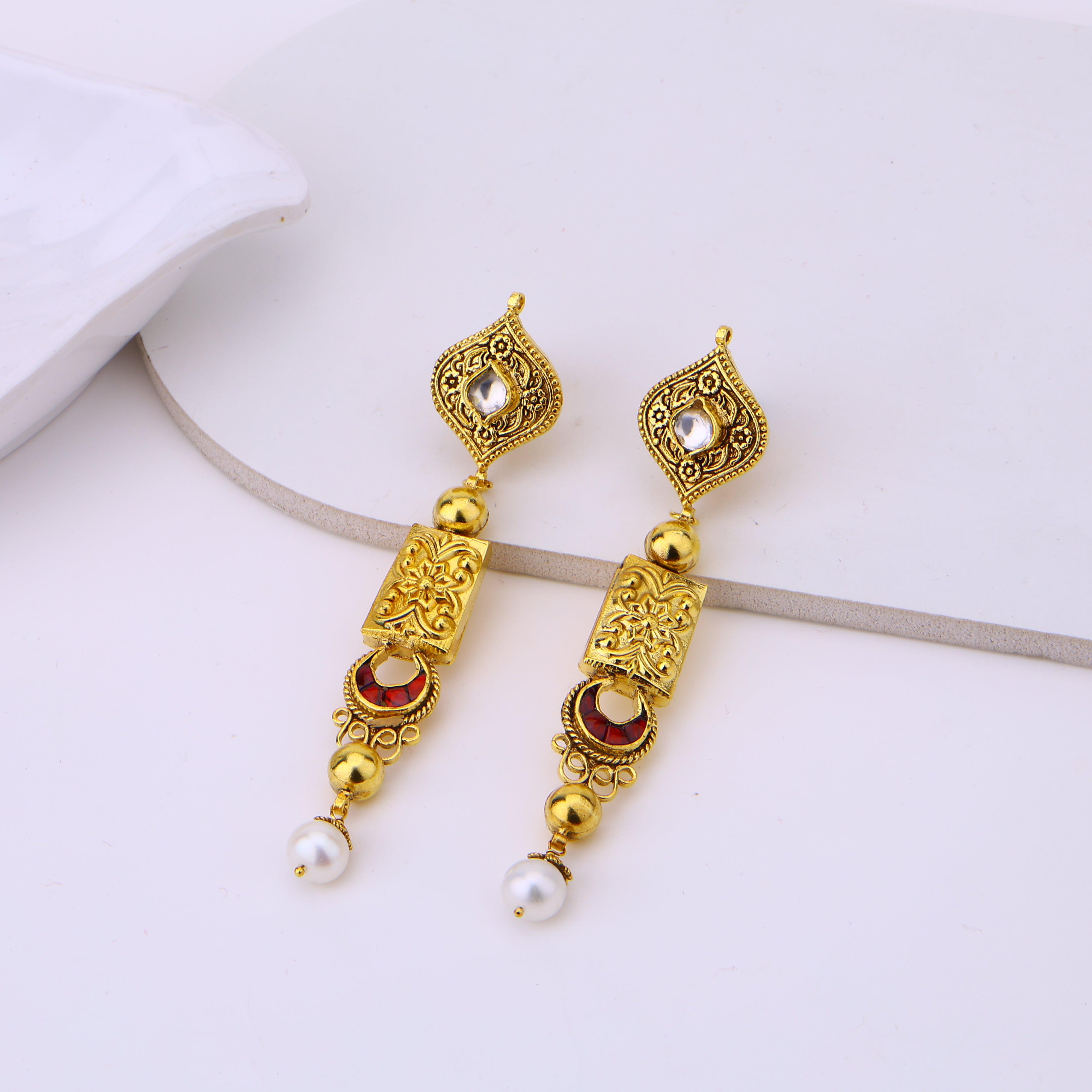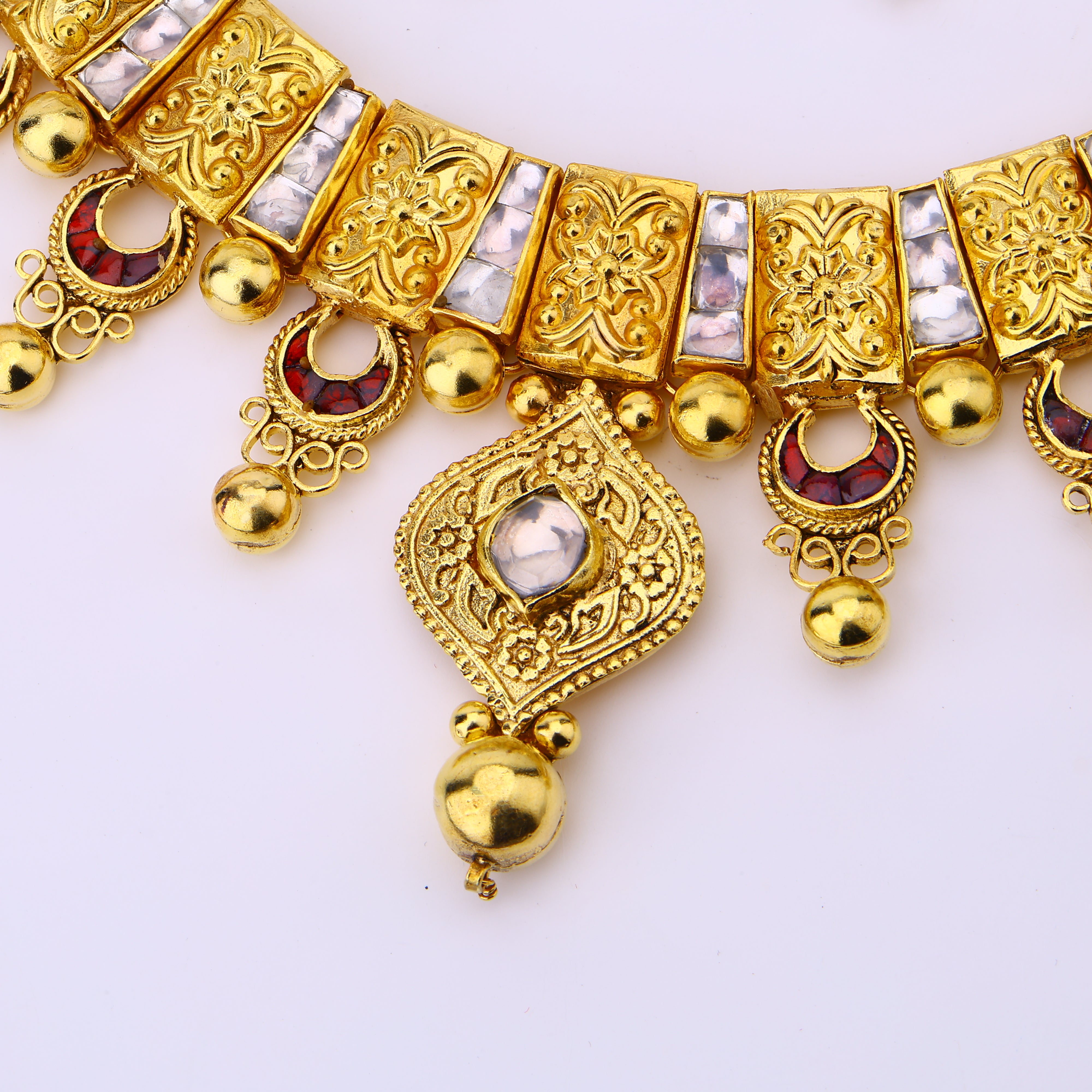 Make a lavish statement with this exquisite jadau necklace set from Sujhal. Glittering with vibrant rubies, iridescent moissanite stones and luminous cultured pearls, this handcrafted luxury jewelry radiates a regal opulence that will turn heads. Each precious gemstone is meticulously set using the jadau technique, an artisanal Indian craft dating back centuries, resulting in a piece that effortlessly blends tradition with contemporary sophistication. Plated in rich 18K gold, this resplendent necklace set instantly elevates any ensemble with a touch of timeless elegance and glamor. Whether worn for a gala or black-tie affair, this stunning treasure is a lavish indulgence to be cherished for years to come.
