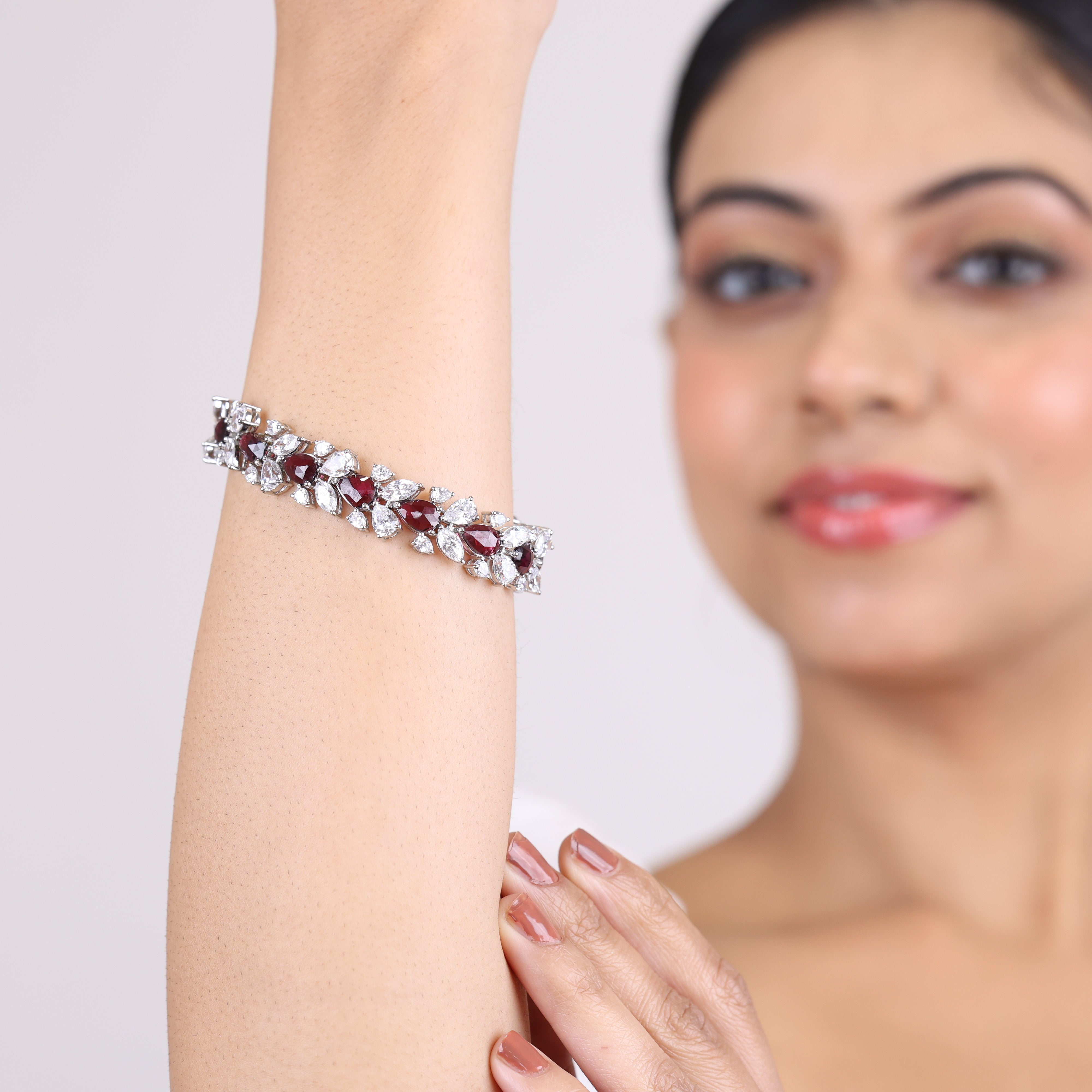 Indulge in a celestial accessory made for angels: the Heartfire Halo luxury bracelet. This opulent jewel gleams with the rich crimson fire of faceted garnets and the sparkling effervescence of Swarovski diamonds. A white rhodium plating coats the bracelet in lustrous, timeless sheen, while the design's exquisite Bengali craftsmanship showcases an artistry seldom seen in the modern world. Whether worn as a signature statement piece or a pop of extravagance for a special occasion, the Heartfire Halo's heavenly beauty is guaranteed to turn heads and ignite envy wherever it's adorned. This isn't just a bracelet—it's a regal reminder that true luxury lies in the exceptional details. Elevate your wrist's radiance with this exquisitely crafted halo.