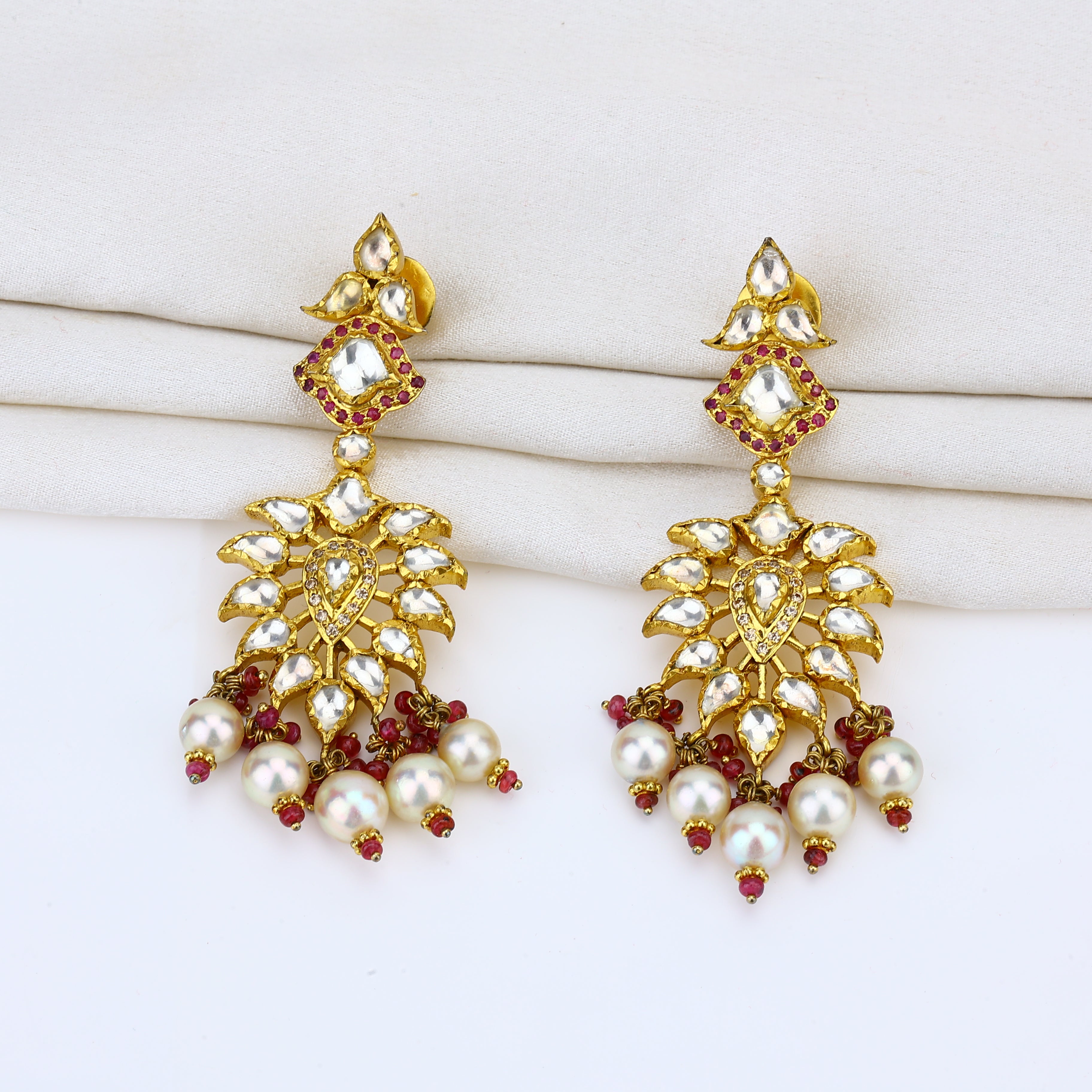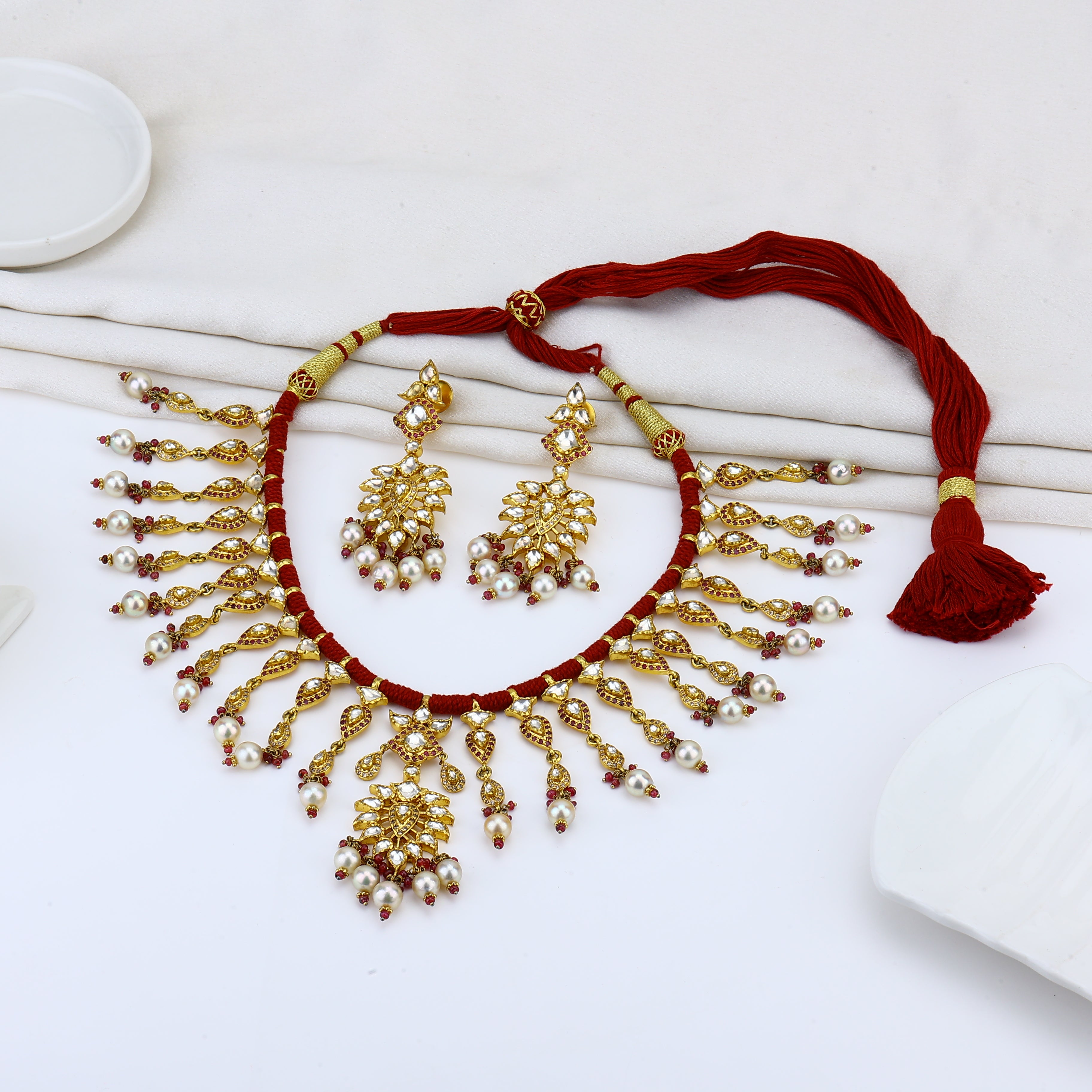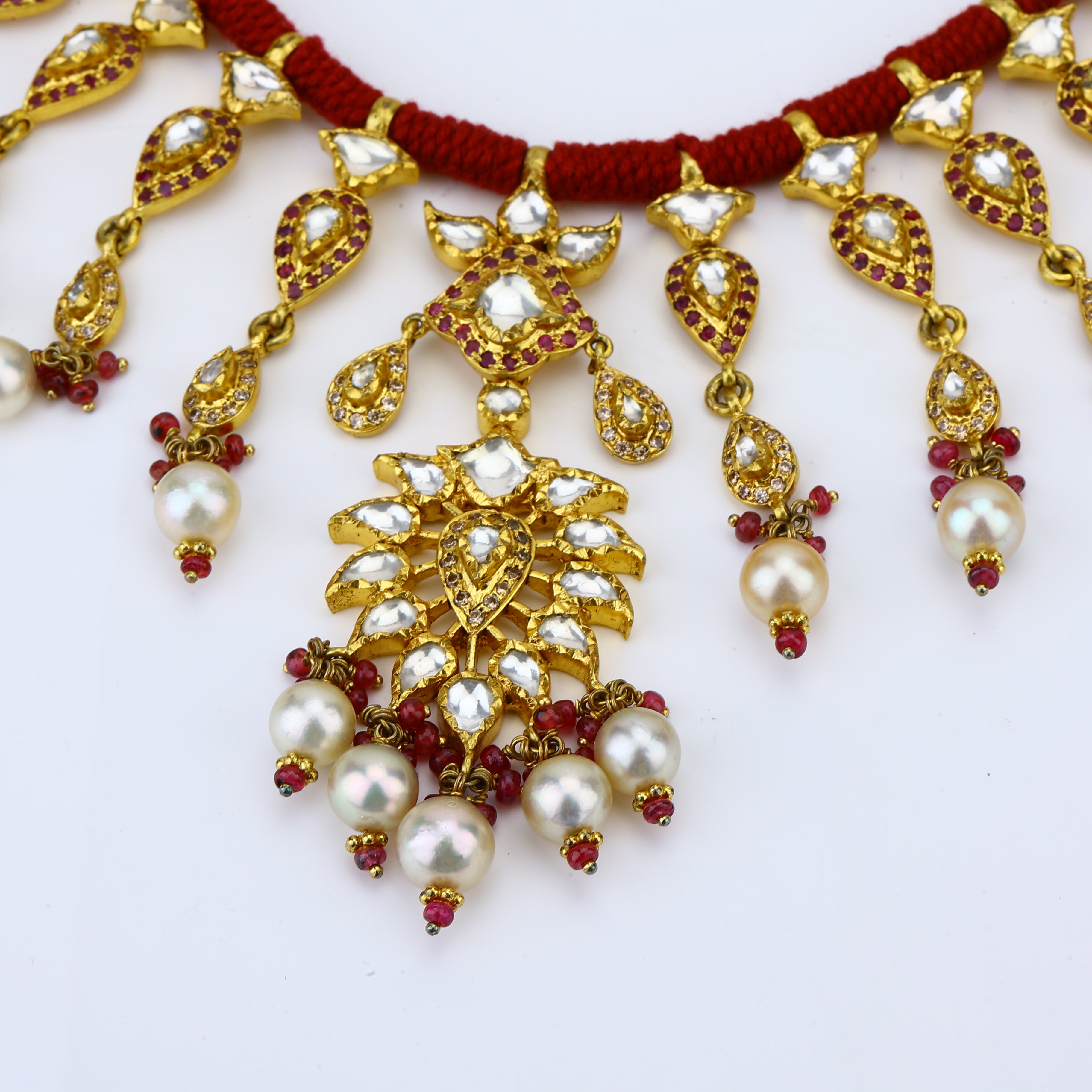 Dripping with radiant gemstones and timeless artistry, this Helios Glow necklace set is luxury incarnate. Each exquisite piece showcases the exacting craftsmanship of Bengali jewelers, who meticulously set fiery rubies, shimmering moissanite, and luminous cultured pearls into lavish 18K gold-plated designs. Gaze into the mesmerizing gemstone fire and you'll be transported to exotic South Asian realms, where master artisans spin precious jewels into wearable treasures. This isn't just jewelry — it's a breathtaking heirloom to cherish for a lifetime. Indulge in Sujhal's global-inspired opulence with the Helios Glow necklace set.