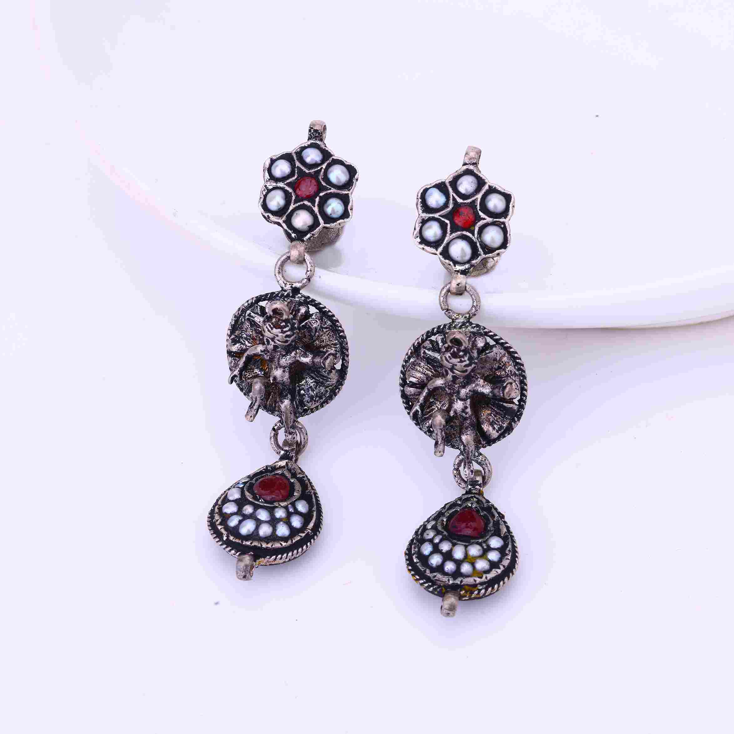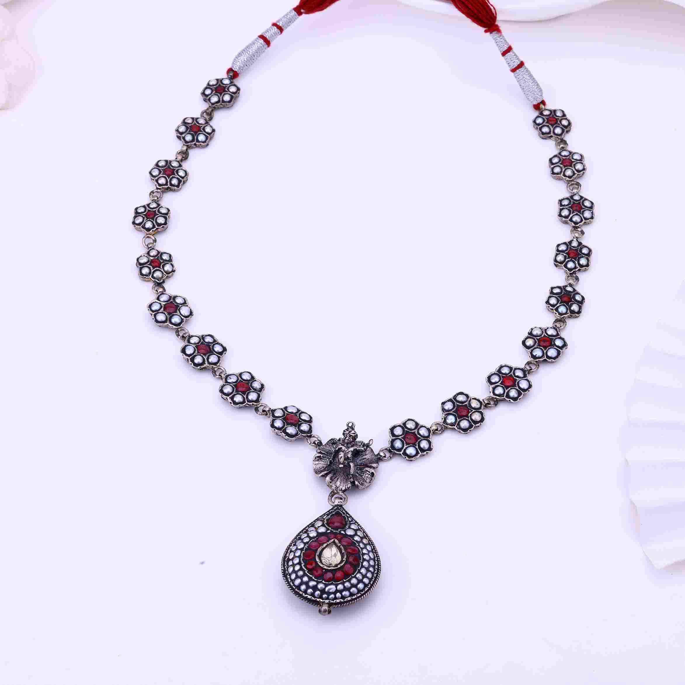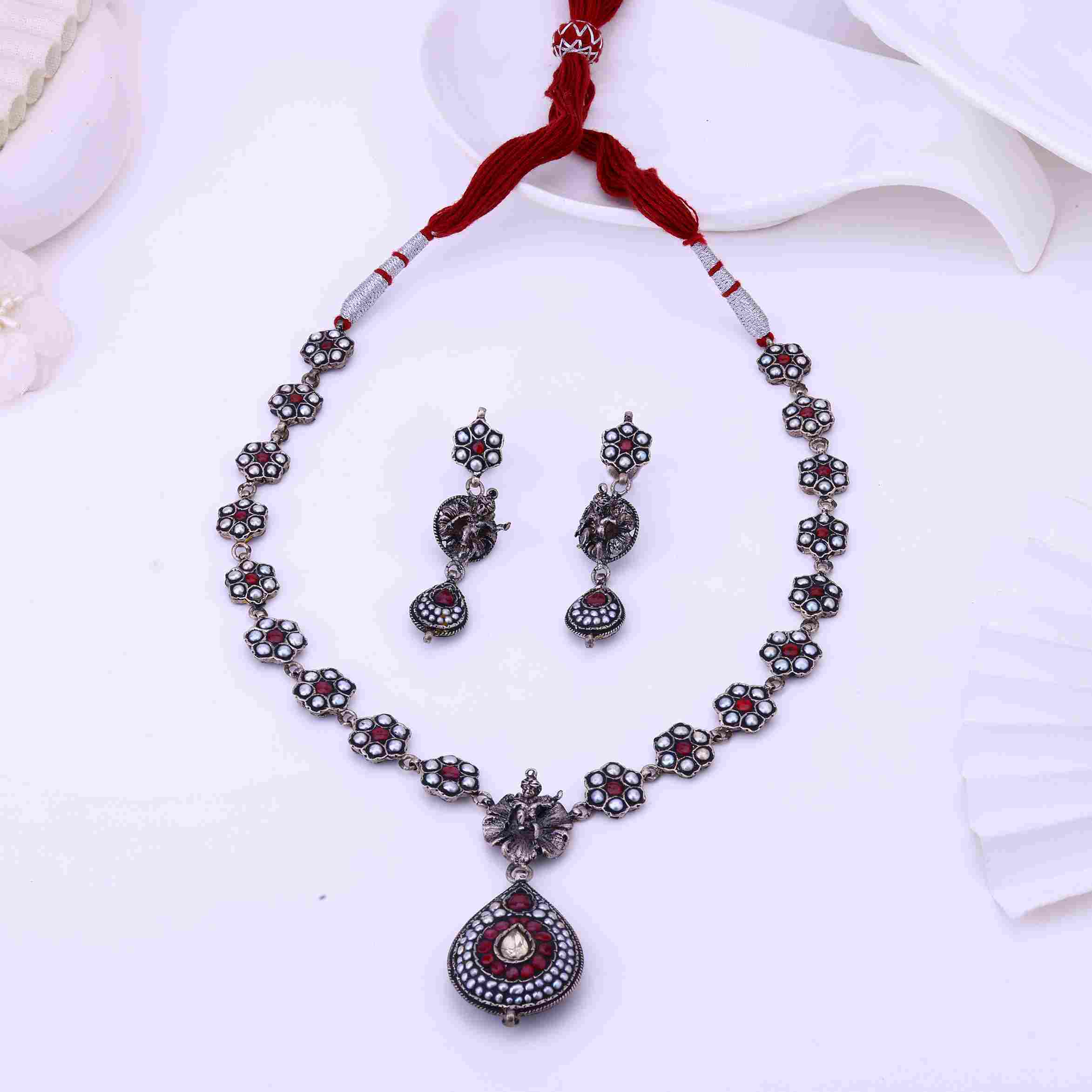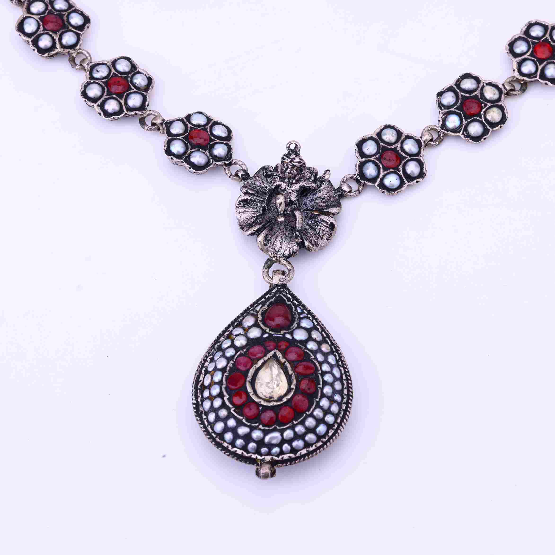 Opulence meets originality in this luxurious necklace set. Behold the fiery radiance of ruby gemstones glowing alongside iridescent Khakho pearls and dazzling moissanite stones. Each piece is meticulously crafted by skilled Bengali artisans, blending timeless tradition with modern sophistication. The oxidized plating lends an unexpected twist, a rich patina that elevates these jewels from ordinary to extraordinary. From red carpet events to black-tie galas, this set commands attention as an elegant statement accessory. Drape the necklace at your neckline and prepare to turn heads, a vision of resplendent beauty. When standard bijoux simply won't do, indulge in the lavish glamor of this striking ruby and pearl ensemble—jewelry as exquisite as the woman wearing it.