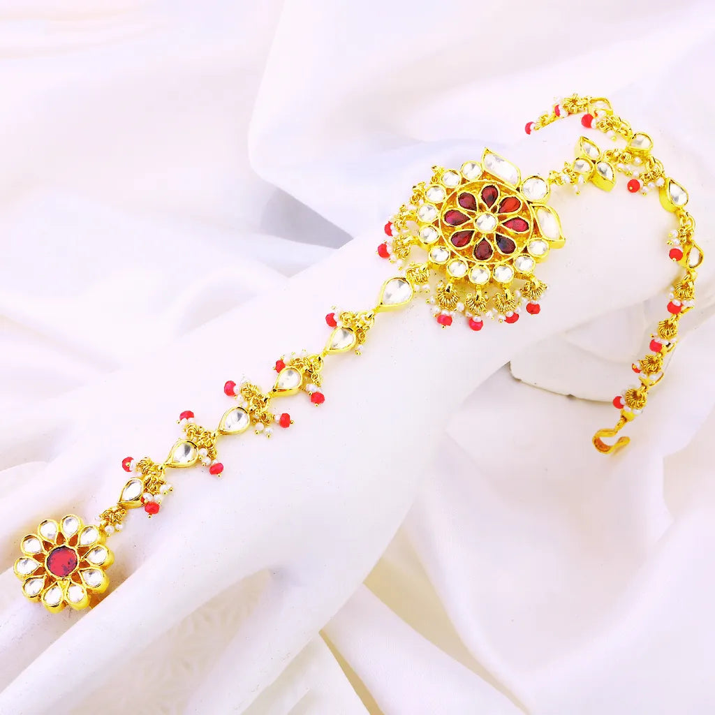 In the grand tradition of royal Indian jewelry comes the Majestic Marigold, a shimmering hand chain that drips with exotic luxury. Anchored by a fiery ruby centerpiece, this intricate piece features a brilliant moissanite blend that lends an ethereal sparkle. Meanwhile, dazzling haathphool (hand flower) accents cascade down the chain, capturing the vibrant allure of the iconic marigold bloom. More than just ornamentation, this exquisite adornment is a nod to India's revered hand jewelry heritage, where skilled artisans have been perfecting the craft for centuries. Slip it on, and prepare to feel every bit the princess—regal, radiant, and wrapped in the finest opulence. Whether worn for festive occasions or to add everyday elegance, the Majestic Marigold infuses your look with a mesmerizing touch of Eastern magic.