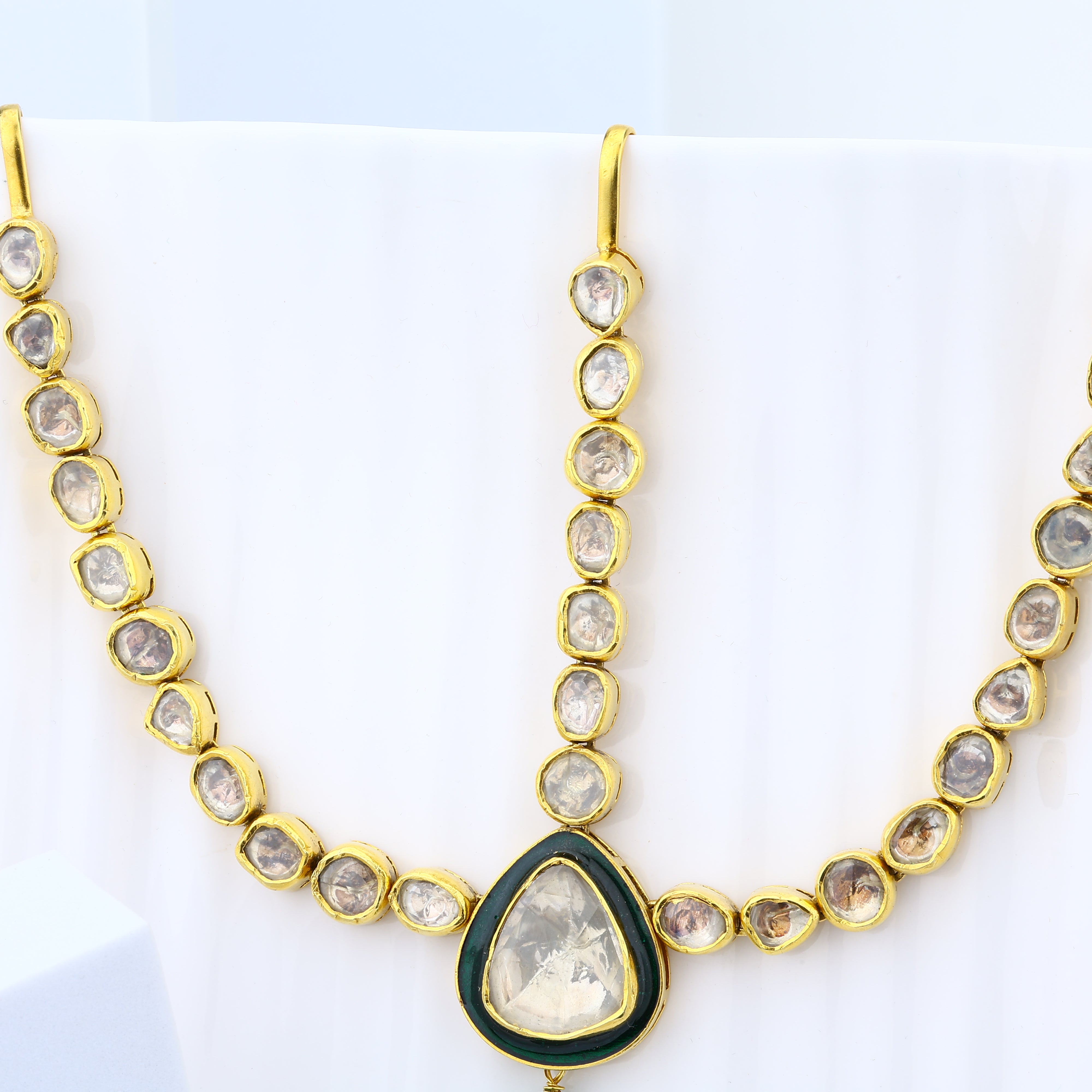 Crafted with utmost care for royalty, this Sujhal Bandi takes fine jewelry to exquisite new heights. This breathtaking piece features meticulously crafted meenakari enamel work from India's most skilled artisans, adorned with dazzling moissanite gemstones and verdant emeralds. Every detail speaks to the regal legacy of Indian craftsmanship - from the intricate engraving and opulent colors to the luxurious feel against your skin. Slip on this exquisite heirloom-worthy stunner, and let its regal splendor be your crown jewel.