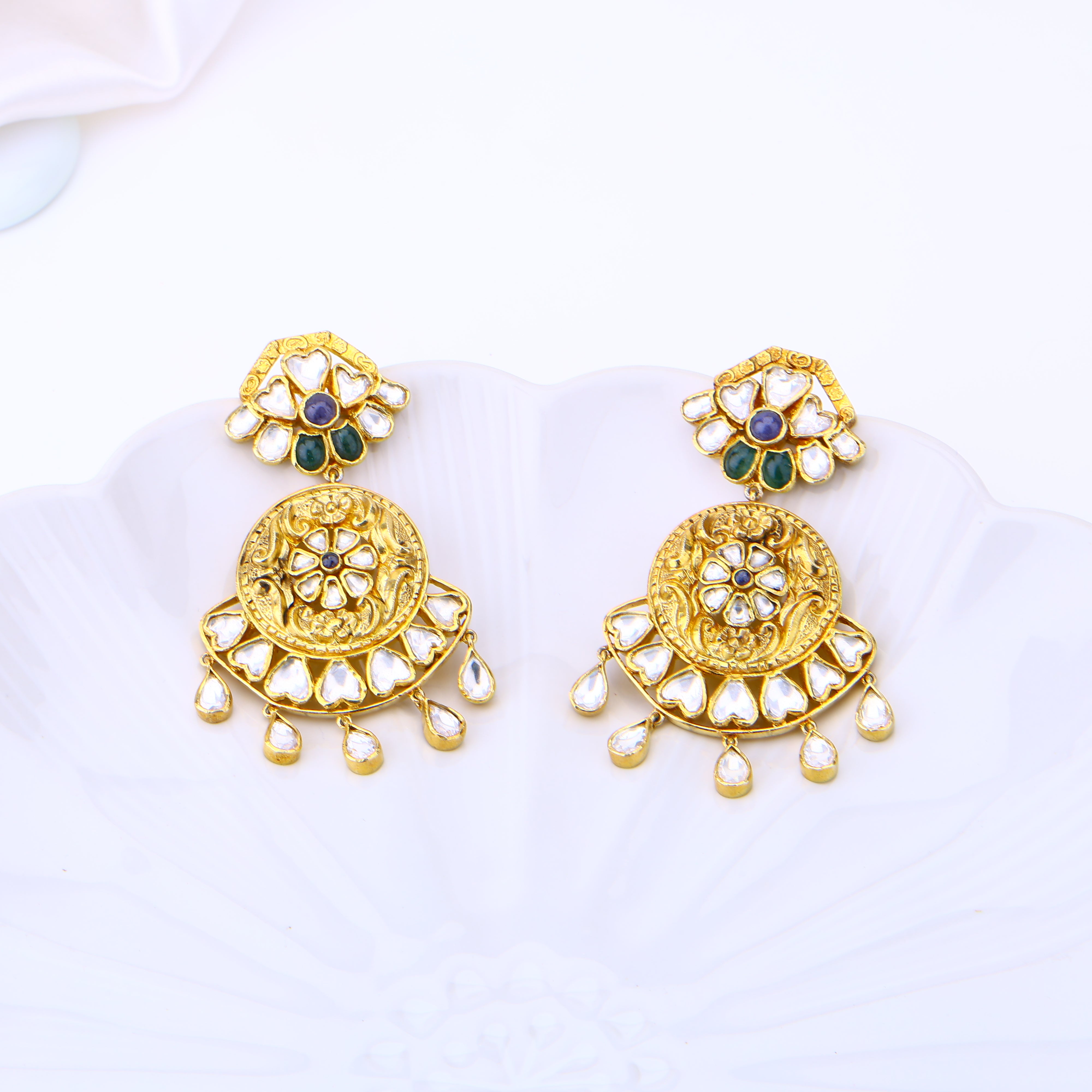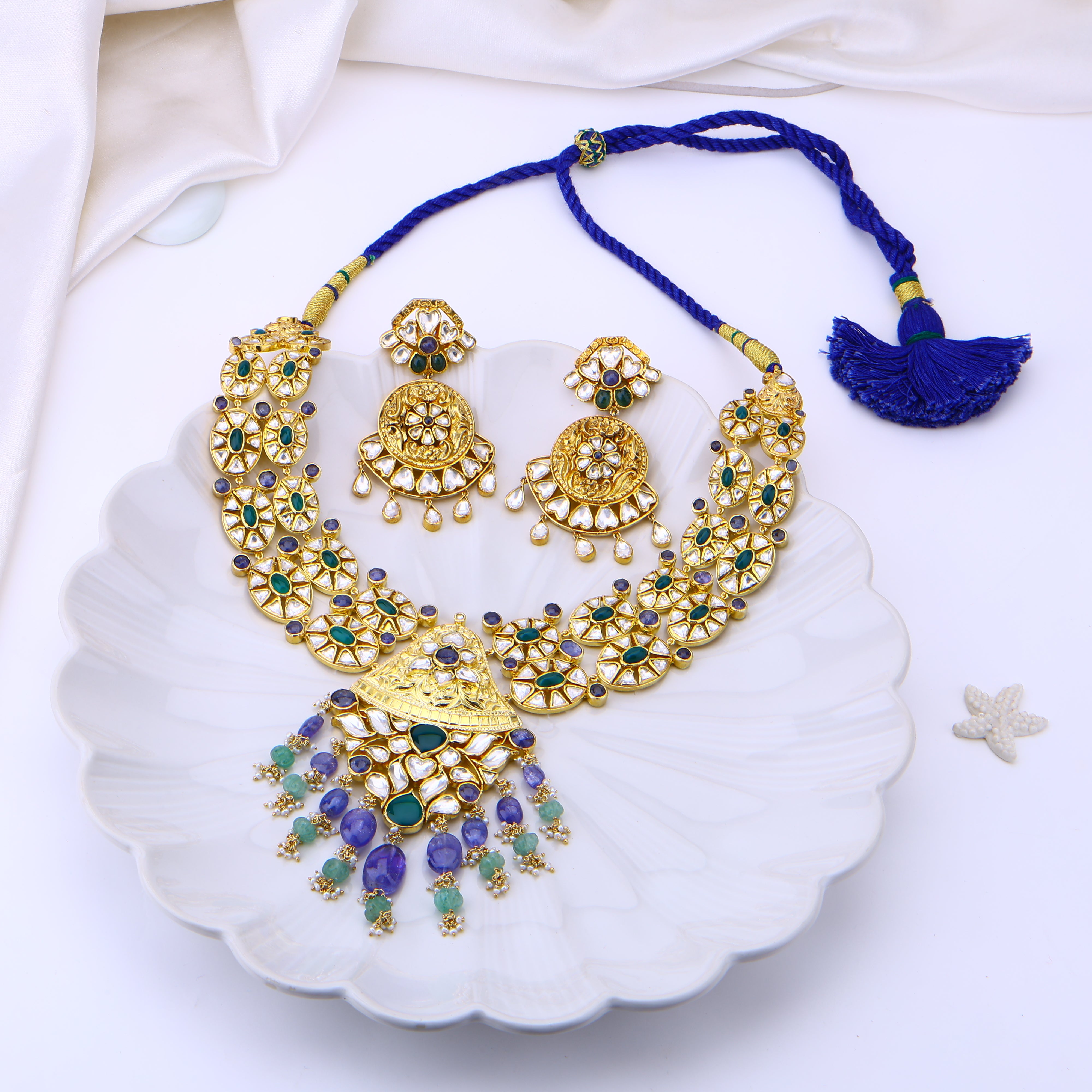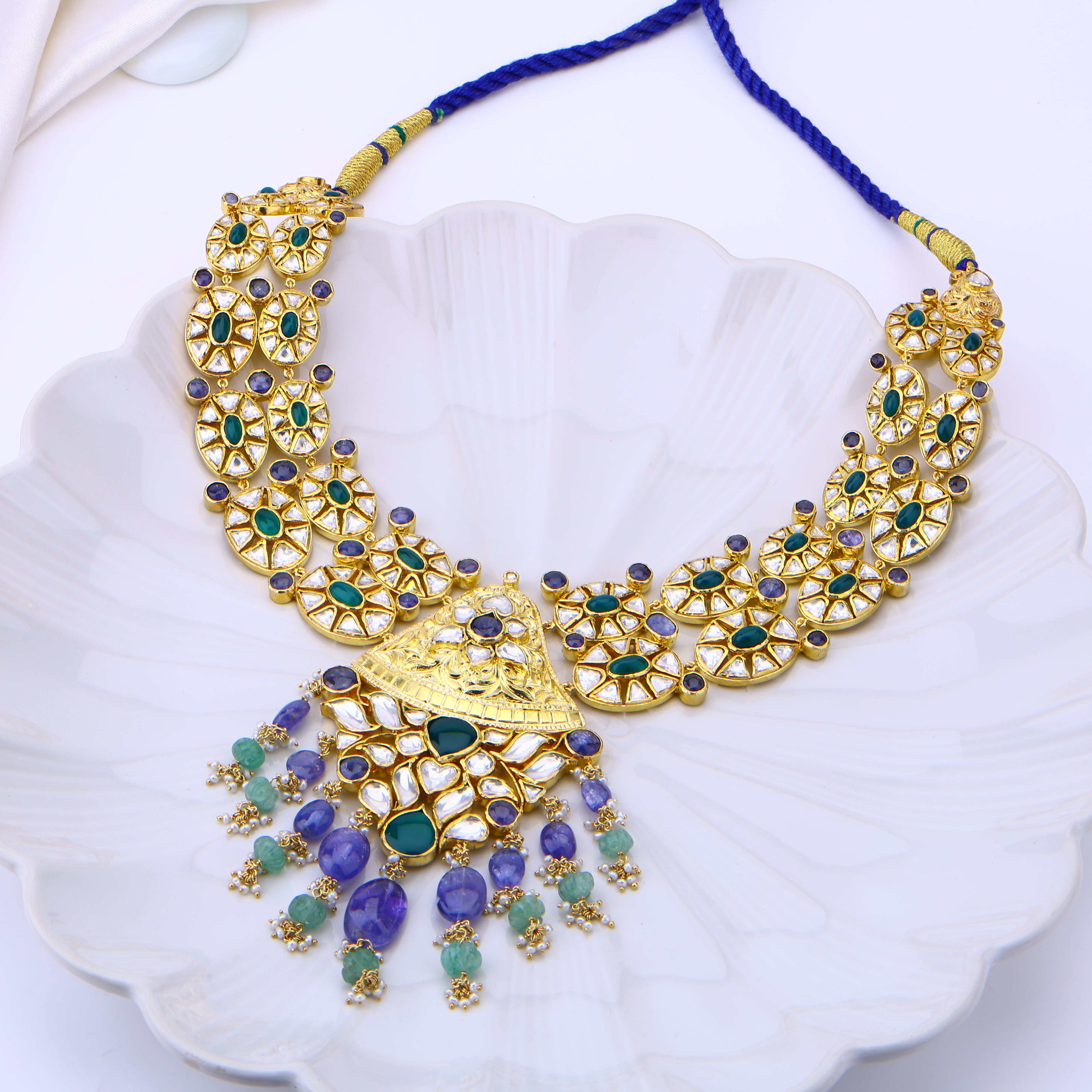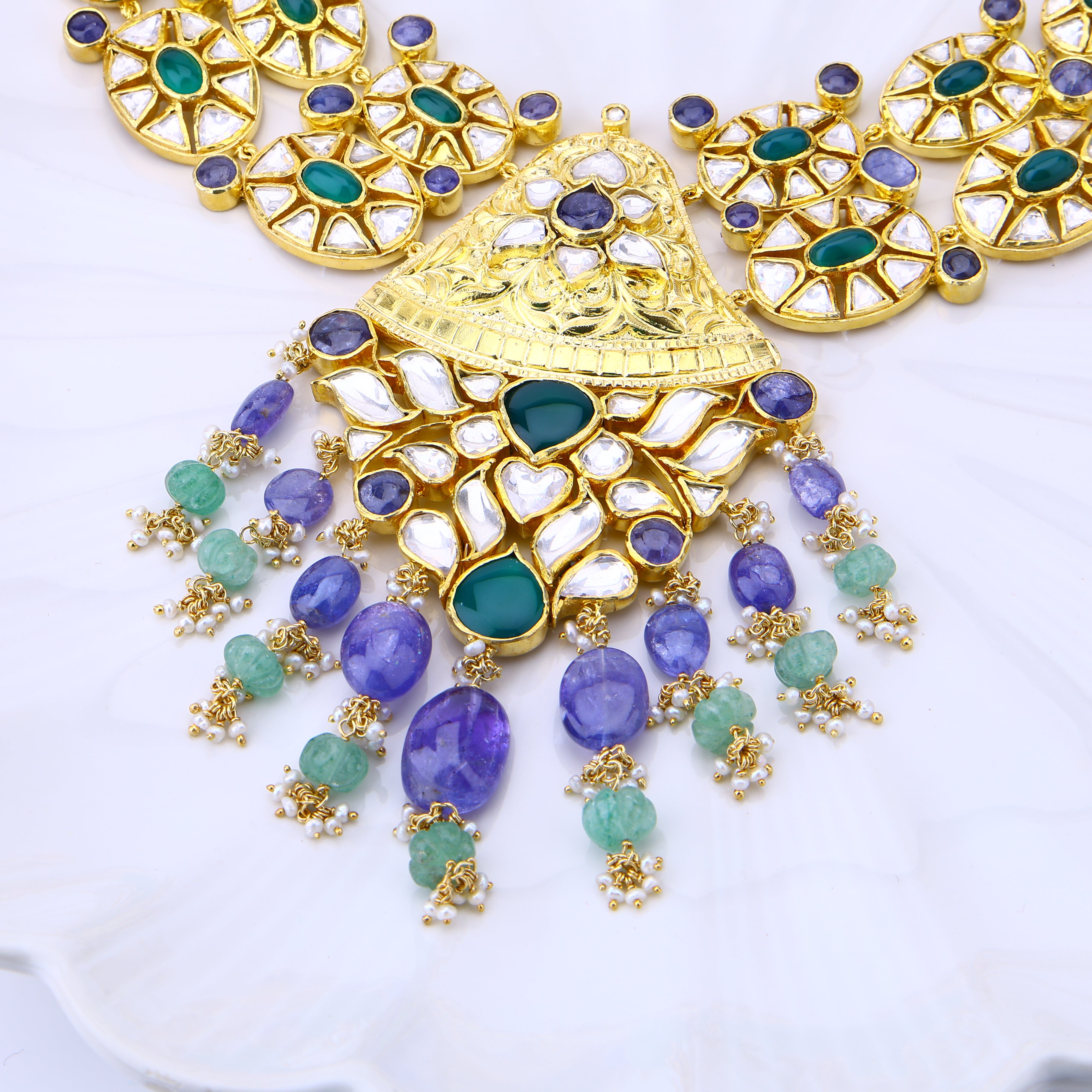 Indulge in unparalleled luxury with this regal necklace set that epitomizes timeless elegance. The artful blend of moissanite, emerald, kyanite, and khakho pearls creates an eye-catching palette that effortlessly complements any ensemble. Delicately plated in radiant 18K gold, each strand captivates with its intricate craftsmanship and quality materials. This exquisite accessory exudes glamor while showcasing the rich artistic heritage of Bengali jewelry-making. With its versatile multi-strand silhouette, it seamlessly elevates both day and evening looks. Whether worn for a special occasion or to add understated opulence to your everyday style, this necklace set makes an unforgettable statement. Invest in a touch of luxury that will leave you feeling like modern-day royalty.