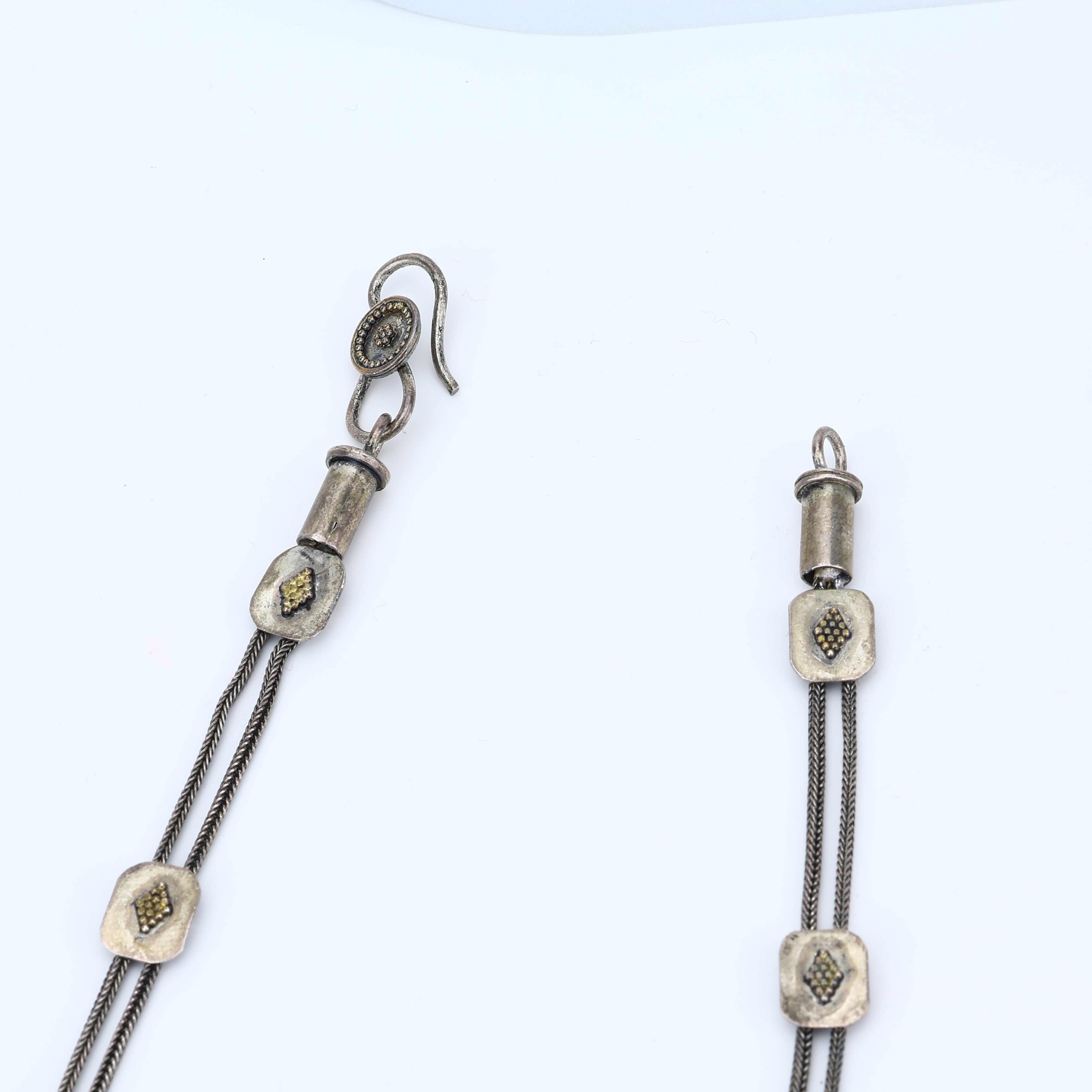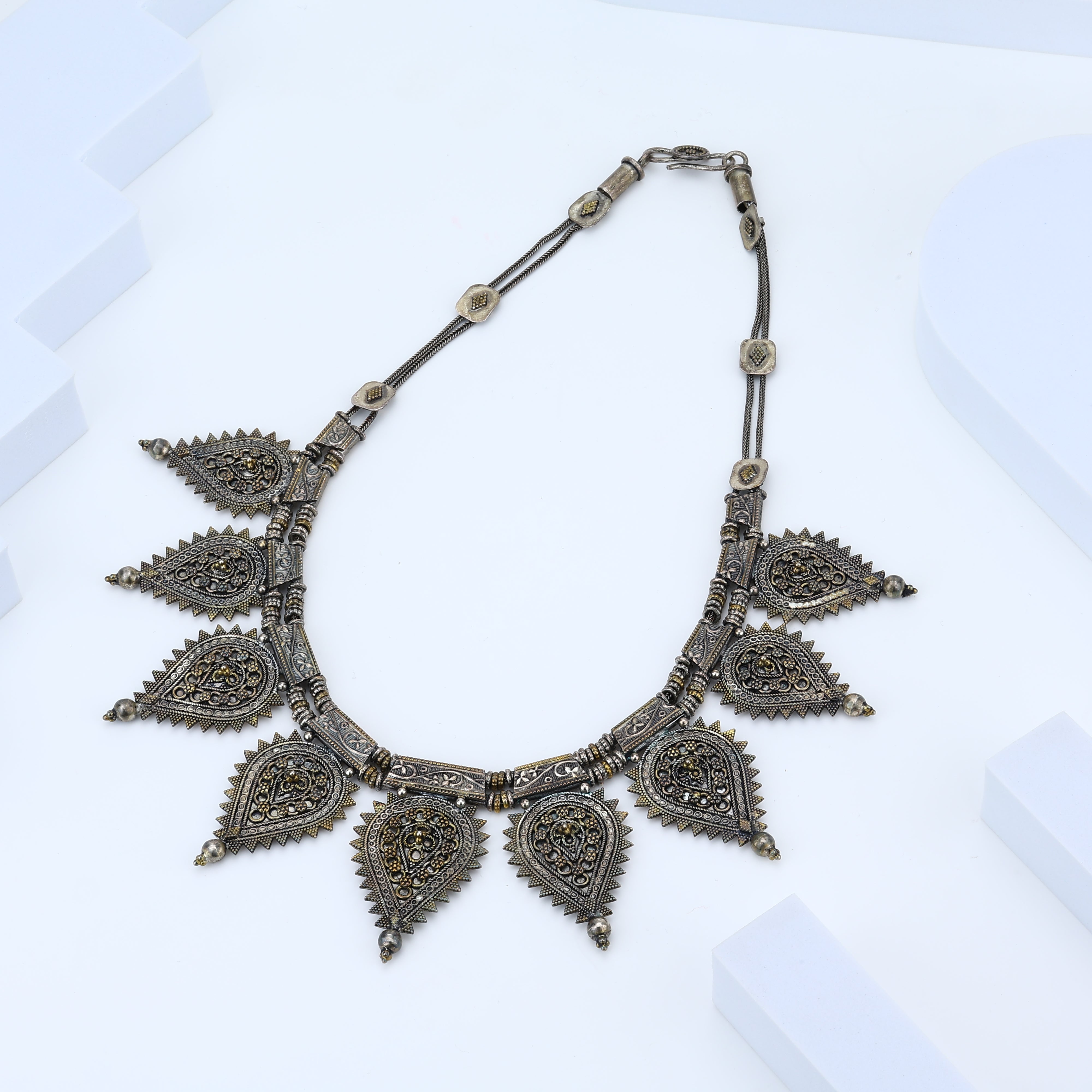 Fashion gets a regal upgrade with the Sujhal Navratna Radiance oxidized necklace. This luxury statement piece channels timeless opulence, thanks to its unique oxidized patina that evokes a vintage, antique aesthetic. But it's the ornate 'nine gems' design that truly steals the show, with an array of exquisite gemstones plucked straight from the Indian subcontinent's rich cultural traditions. Whether worn with an elegant gown or tossed over a casual tee, the Navratna Radiance adds an irresistible touch of glamor to any look. Go ahead, indulge in this investment-worthy accessory — and let every glance cast your way be one of pure envy.