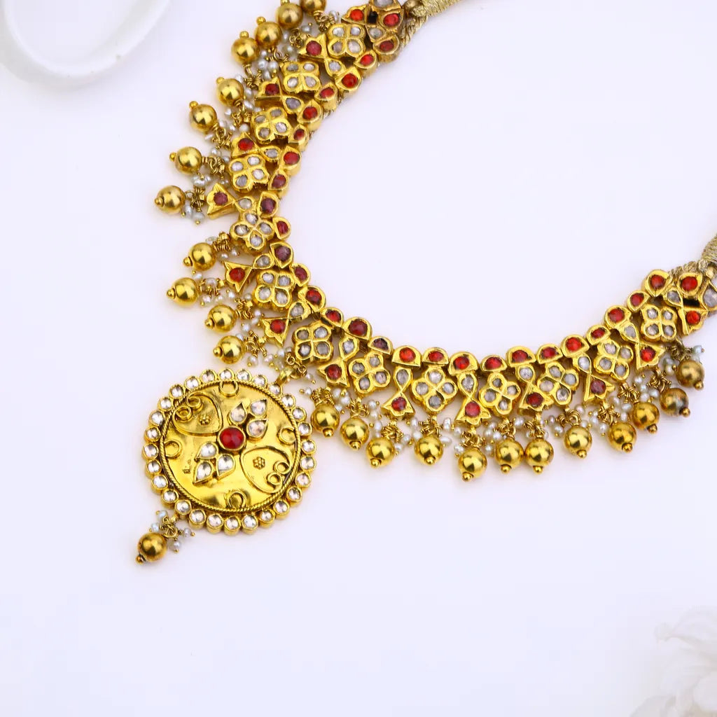 Glamor meets the great outdoors in this luxury necklace set that captures the untamed allure of the desert rose. Eye-catching garnet, radiant moissanite, and exotic khakho pearls intertwine in a ravishing blend that elevates any ensemble from ordinary to opulent. This isn't just a necklace, it's a wearable work of art that commands attention and ignites a spark wherever it goes. Whether worn for a night on the town or an intimate soiree, the bold yet refined design transcends trends to become a timeless signature piece. For the woman who radiates confidence and embraces her inner queen, this luxury necklace set is a natural complement to an already stunning presence. After all, when you've got it, flaunt it.
