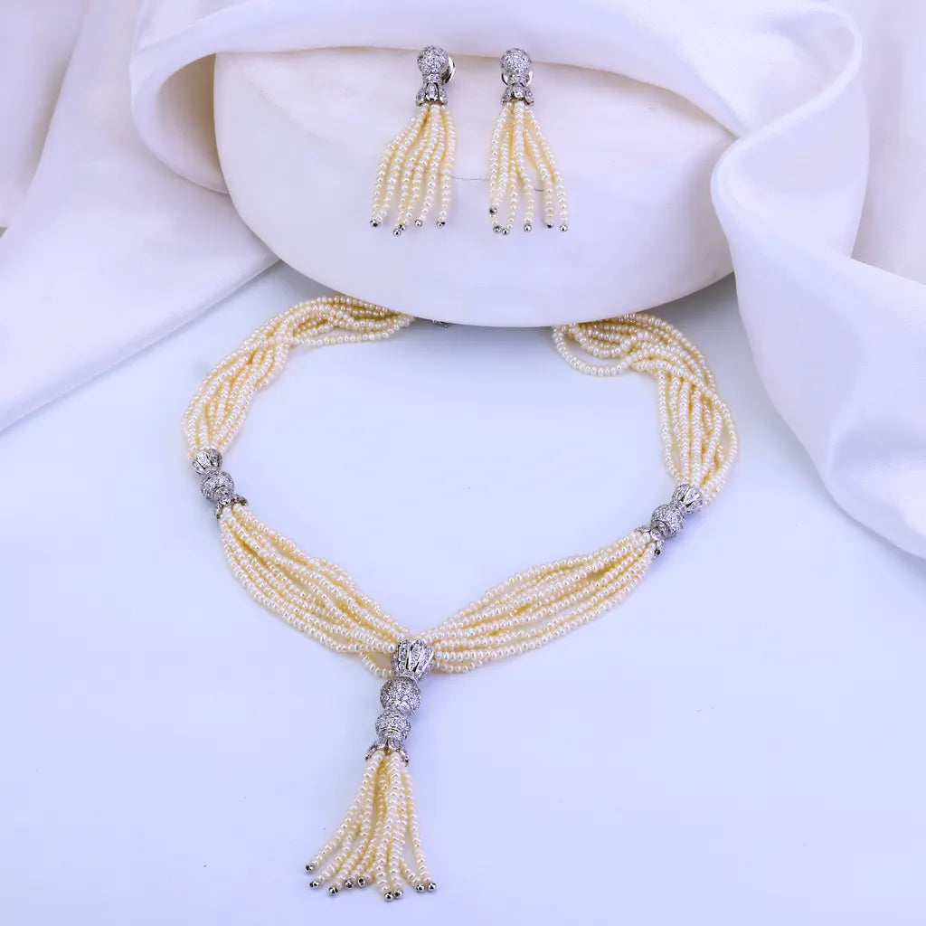 Indulge in a touch of regal opulence with this Sujhal Golden Wreath luxury necklace set. Dazzling cubic zirconia and exotic khakho pearls blend seamlessly in an elegant design radiating confidence and sophistication. The brilliant synthetic gemstones and lustrous pearls add an alluring, opulent flair that elevates any look from day to night. Whether worn for a formal gala or special occasion like a wedding, the timeless style of this ensemble effortlessly blends tradition and contemporary flair. Surprise that special someone with the luxurious gift of feeling like royalty. Crafted to make a statement, this necklace set is the epitome of decadent glamor for a lavish evening out or whenever you desire to indulge in life's finer things.
