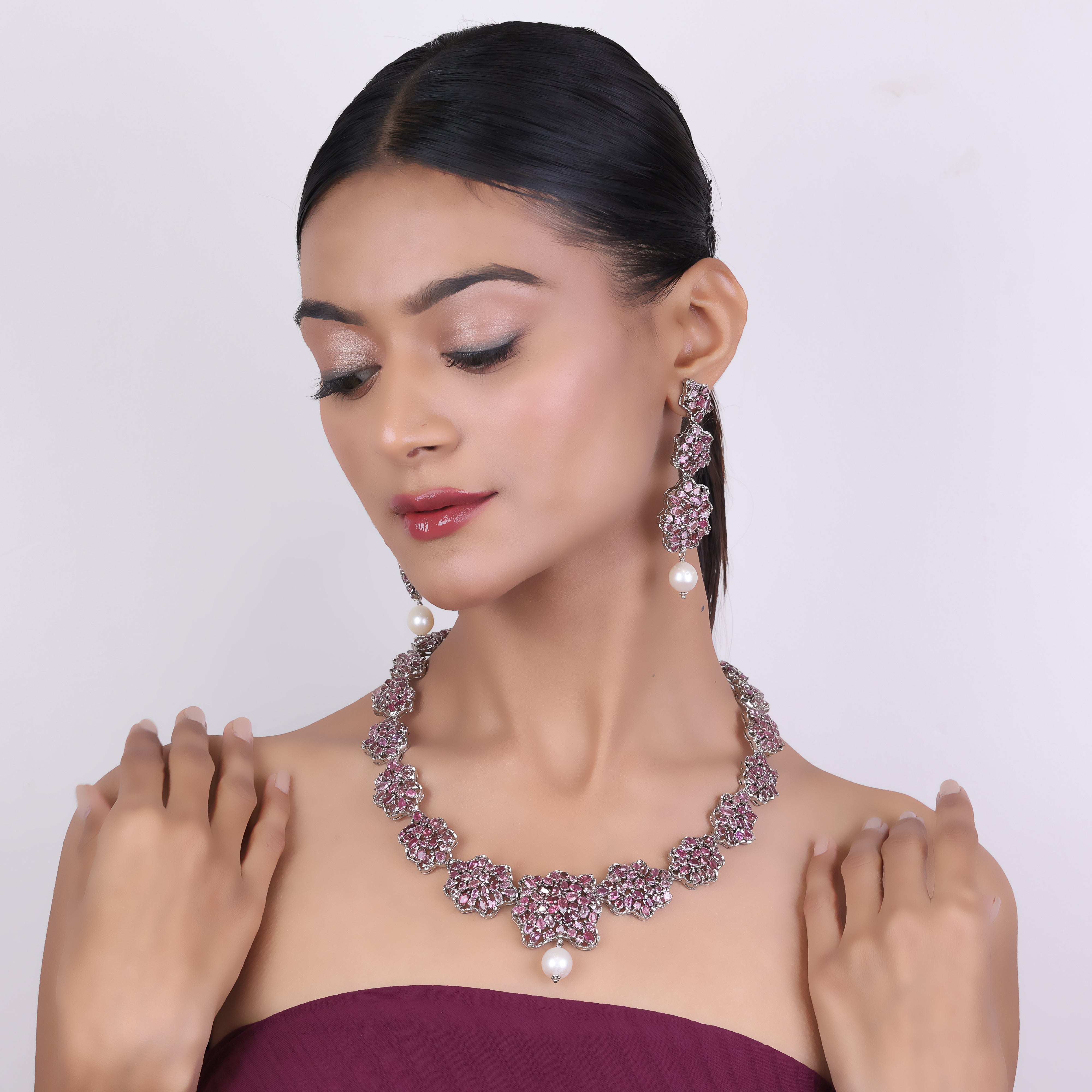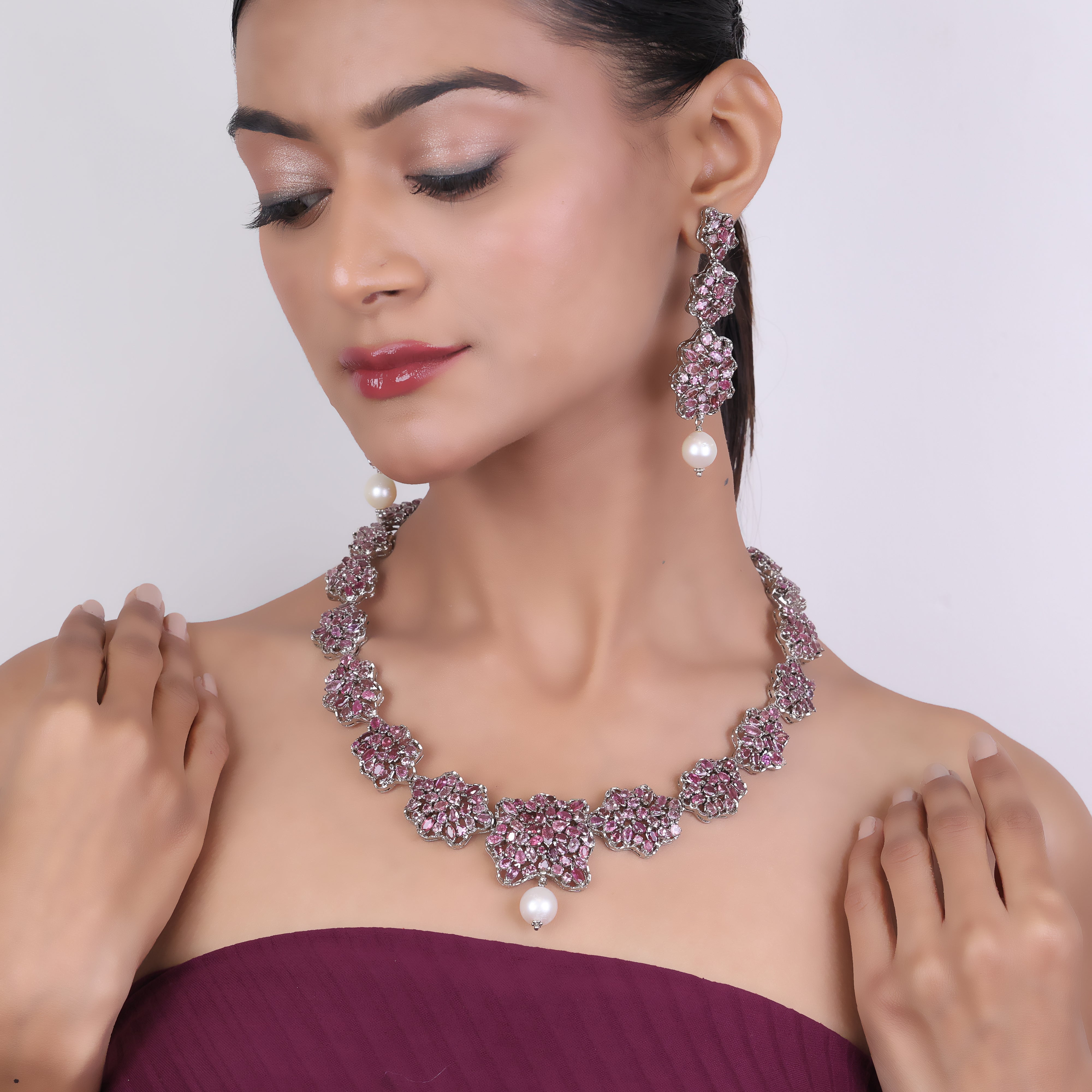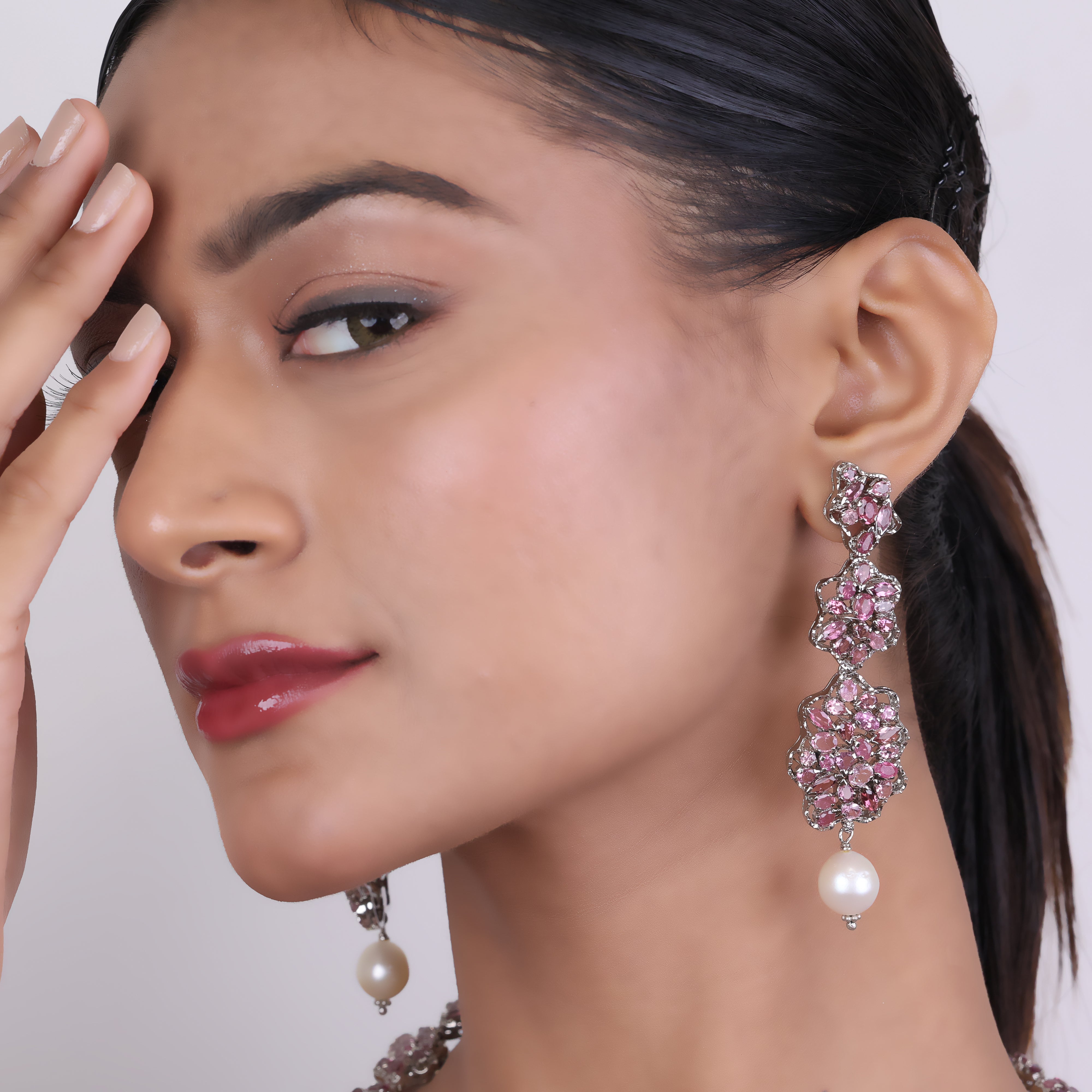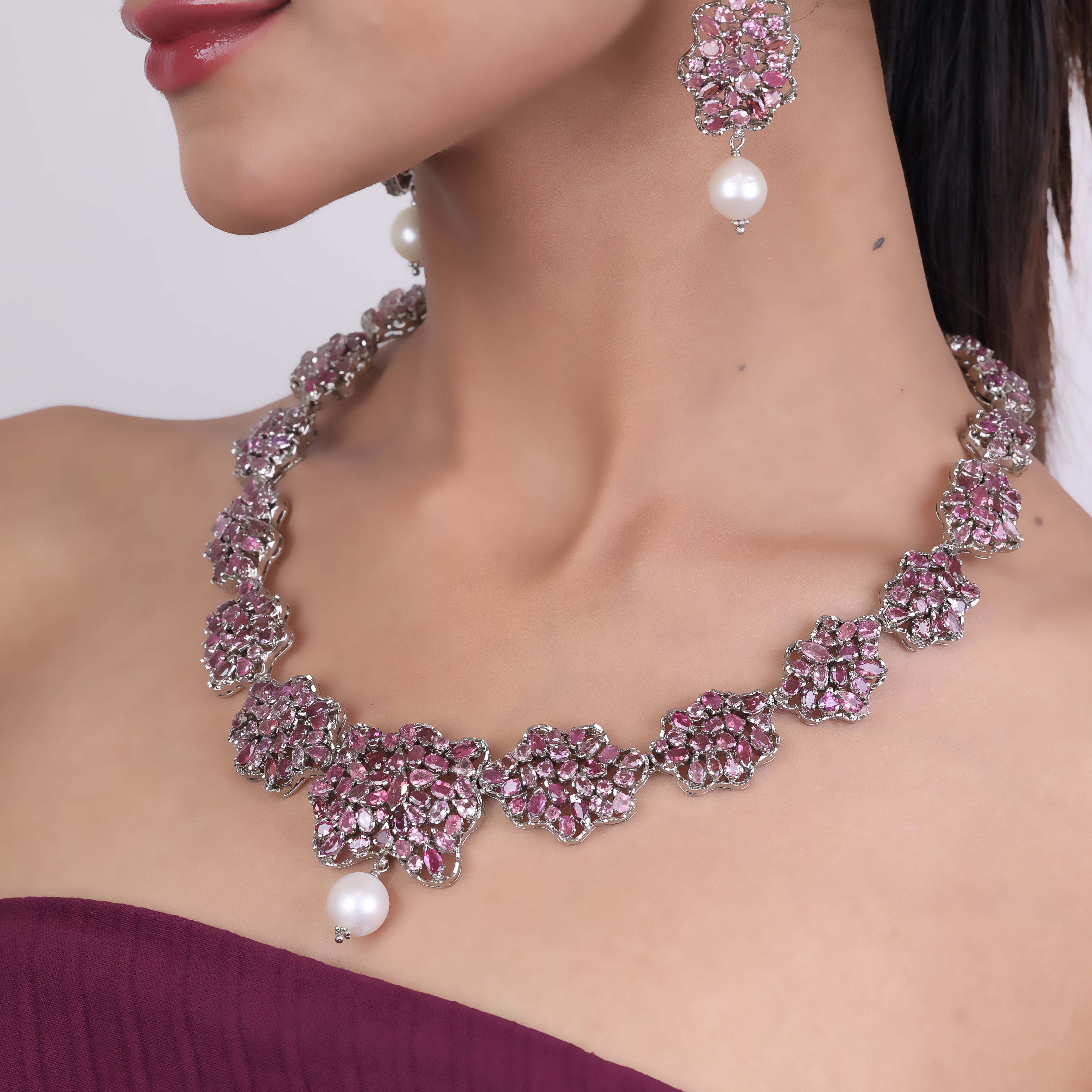 Passion and grace collide in this regal ruby and South Sea pearl necklace set. Like an East-meets-West luxury blend, fiery rubies from the subcontinent join ethereal pearls from the South Seas in a striking symphony of opulence. The rich ruby hue conveys passion and prosperity, while the luminous pearls symbolize purity—a harmonious marriage of bold and demure. Yet this decadent set transcends cultural lines through its timeless artistry. Meticulously handcrafted by skilled Bengali artisans using an elegant white rhodium plating, each piece exudes a sense of heirloom quality and old-world glamor. Whether worn as a romantic accent or statement-making adornment, these lustrous gemstone and pearl strands elevate any look with their regal splendor. Step into the reverie of modern royalty.