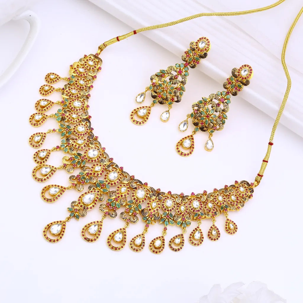 What woman doesn't dream of draping her neck in lavish rubies and dazzling moissanite? Introducing the Eternal Ruby necklace set—a stunning blend of precious gemstones certain to leave a trail of admiring glances wherever you go. Ruby and emerald jewels catch the light with fiery brilliance, while moissanite diamonds effervesce with a sparkle that radiates pure luxury. This glamorous set instantly elevates any ensemble from the aisle to the opera with its sophisticated shimmer. Timeless yet utterly modern, these jewels encapsulate the captivating allure of a woman at her most confident. After all, when you look this radiant, heads are bound to turn. So grace that elegant neckline with rubies deserving of royalty and let the world bask in your eternal ruby glow.