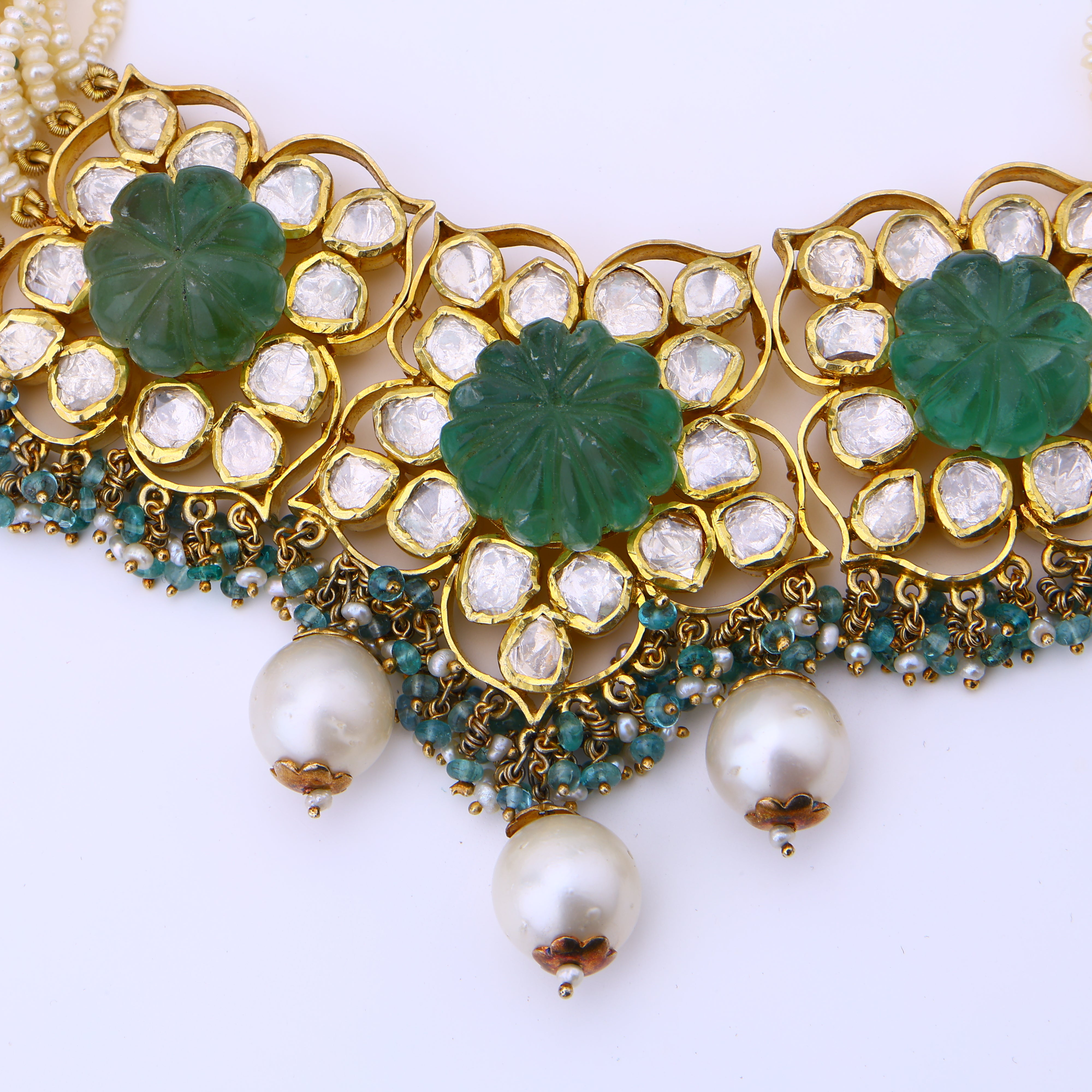 Luxury has a new name—and it's spelled S-U-J-H-A-L. This exquisite Passion Candy necklace set is a decadent fusion of precious gemstones and Bengali craftsmanship that will make you feel like royalty. Carved emeralds, fire-flashing moissanites and luminous cultured pearls create a kaleidoscope of colors that dances with every movement. But the real jewel? Those exotic khakho pearls harvested from the waters of India's coasts. Each bead is an artisan-made treasure imbued with centuries of cultural heritage. Tie it all together with opulent 18K gold plating, and you've got a head-turning statement piece that elevates any ensemble from drab to dazzling. Whether worn with jeans or an evening gown, this necklace set will command attention and admiring glances wherever you go. Indulge your regal side—it's time to treat yourself like the queen you are.