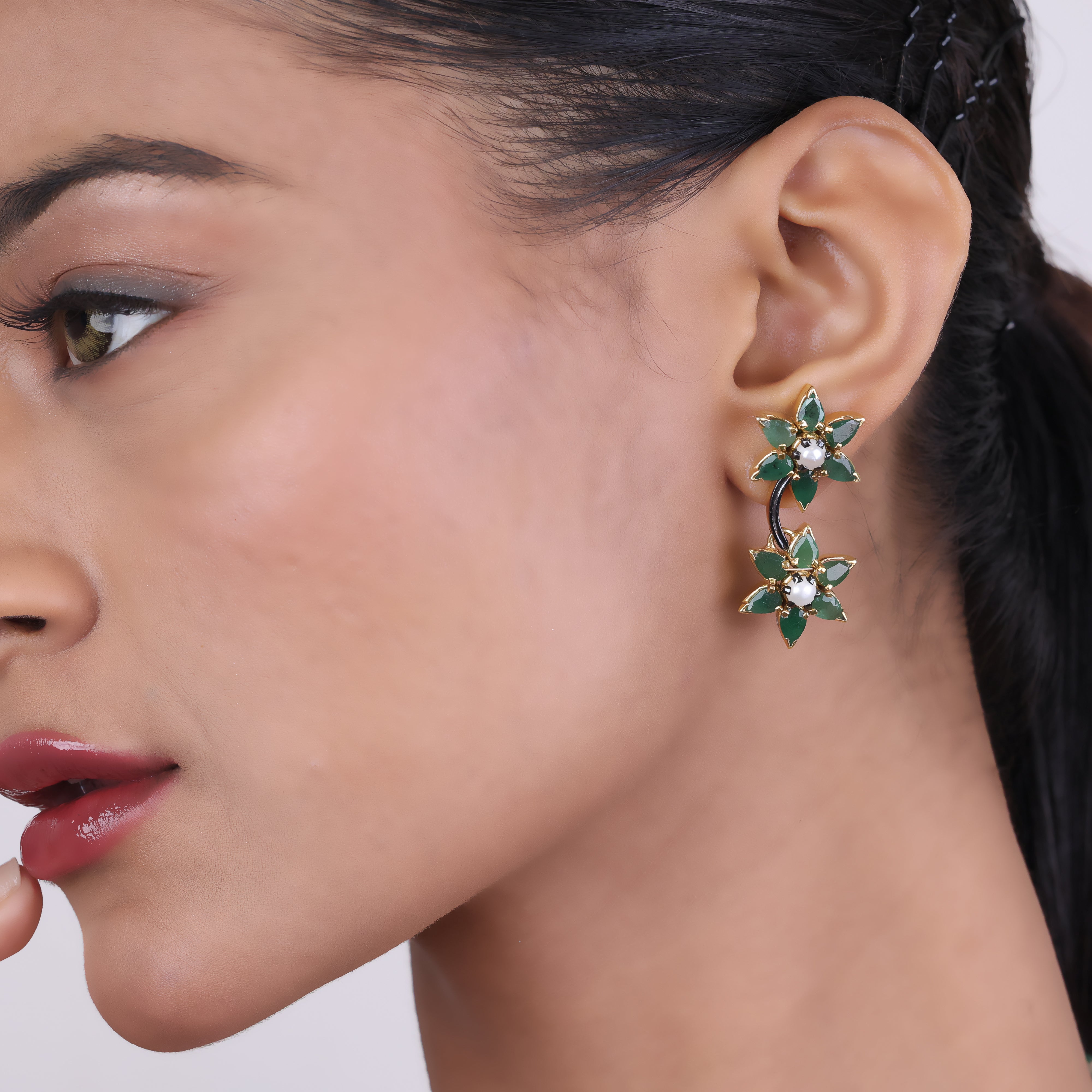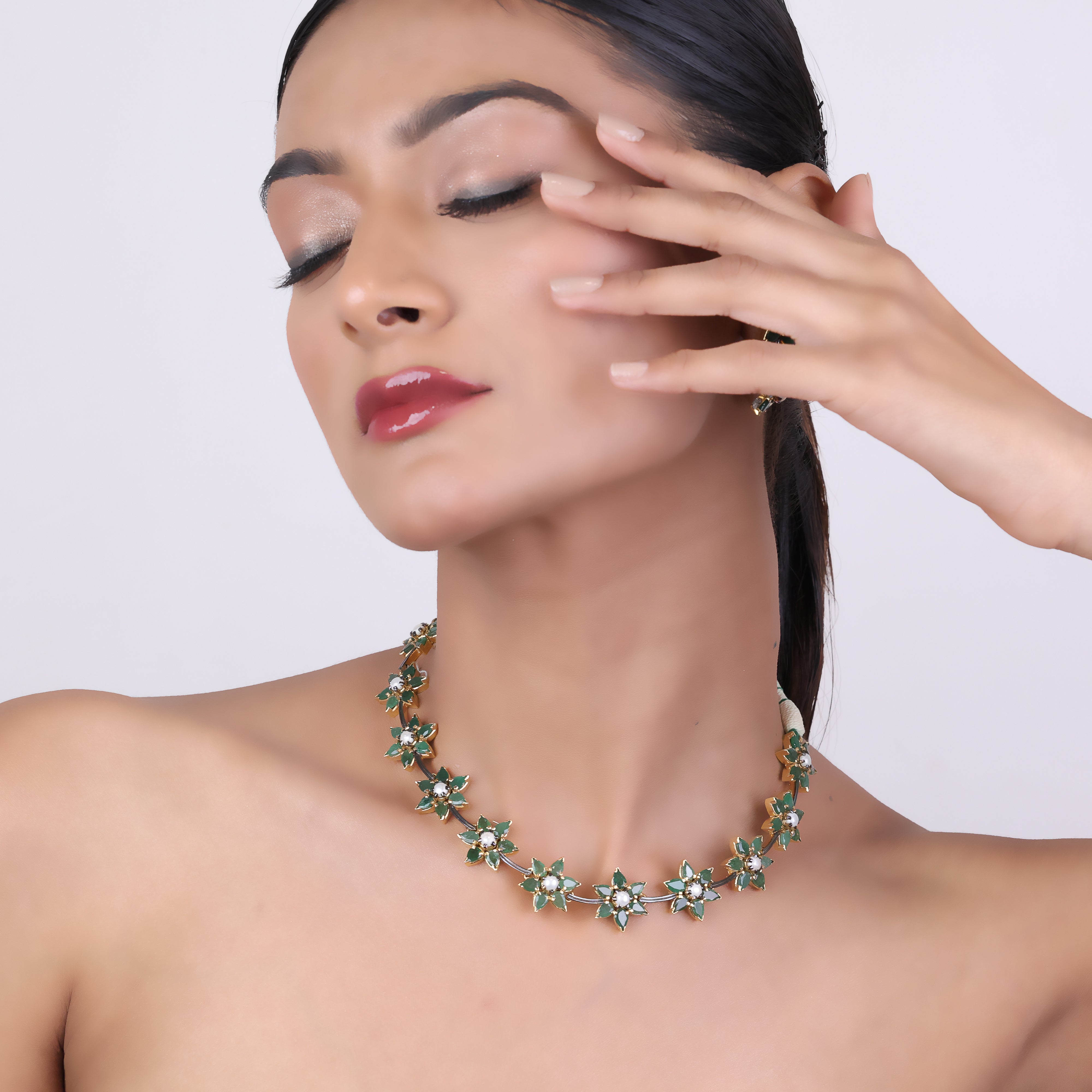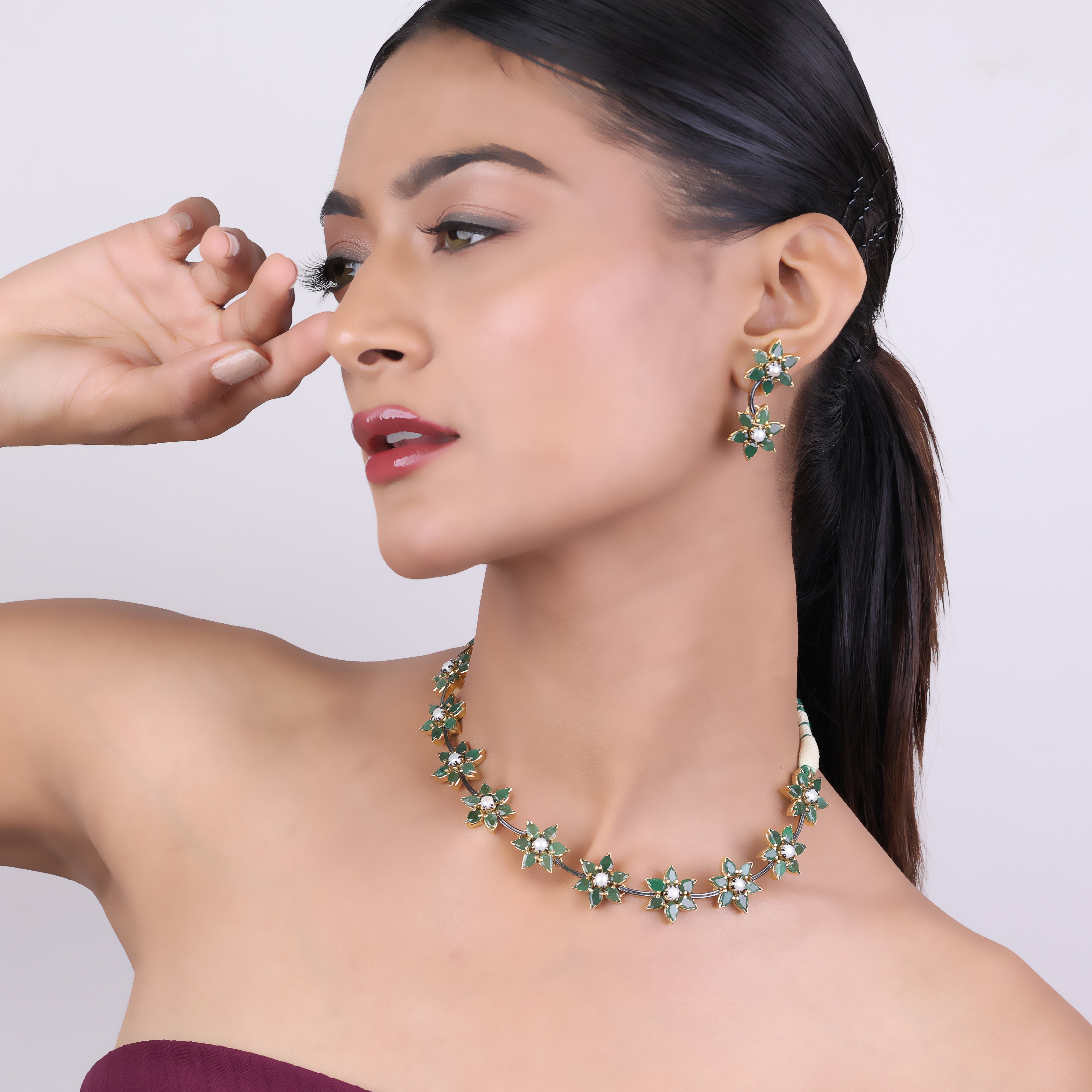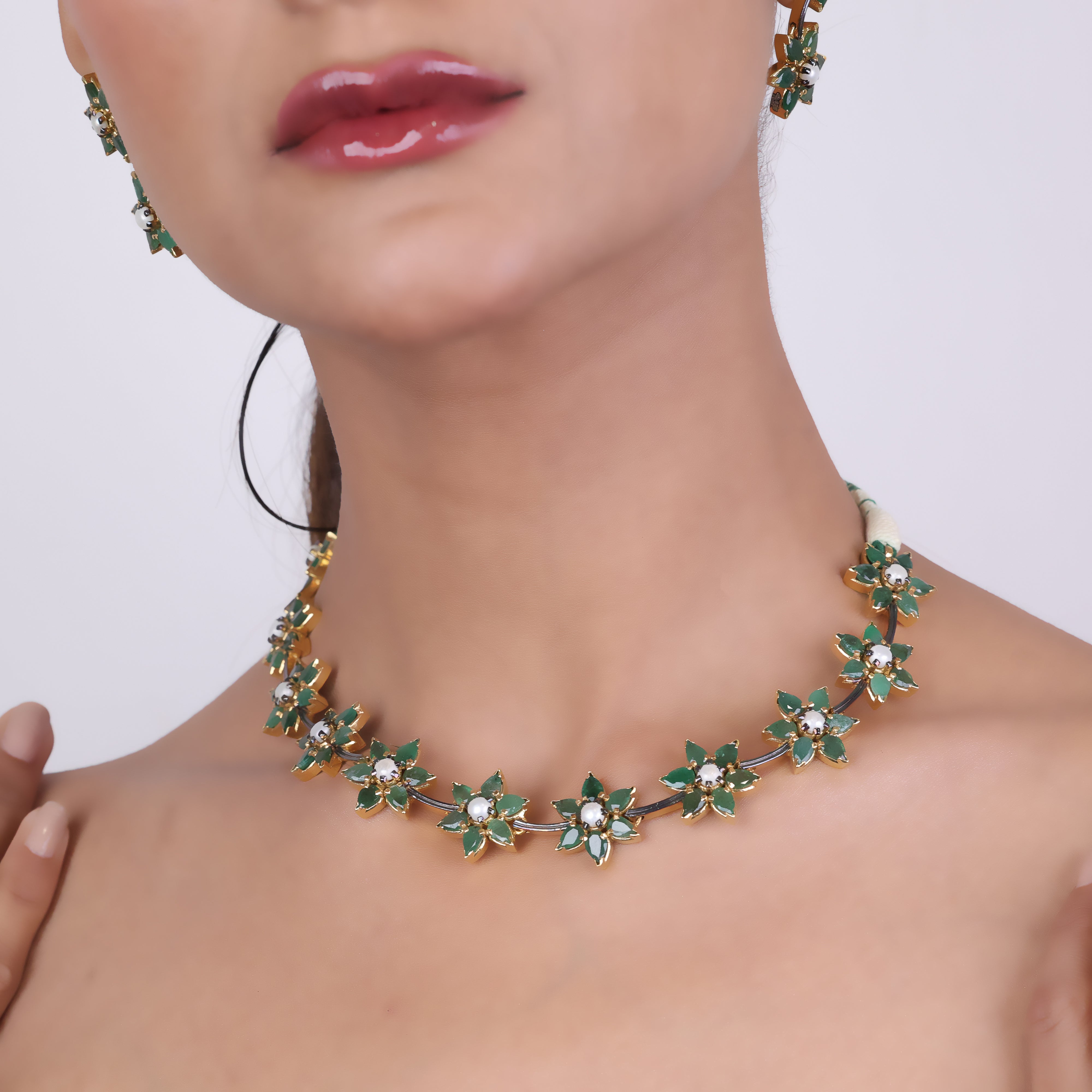 Radiant and refined, this luxury necklace set is a true summer bloom. Delicate khakho pearls and vibrant emeralds come together in an elegant floral design that captures the beauty of nature. Each gemstone is hand-selected and expertly arranged into a precious emerald and pearl blend, creating a timeless accessory that exudes sophisticated elegance. This summer bloom shines brightest on special occasions, whether you're attending a fancy dinner, garden wedding, or chic cocktail party. Slip it on for an instant touch of luxury and let the precious gems catch the light, sparkling like morning dew on summer petals. A statement piece that captivates with its natural grace, this necklace set is a must-have for fashionable jewelry collections.