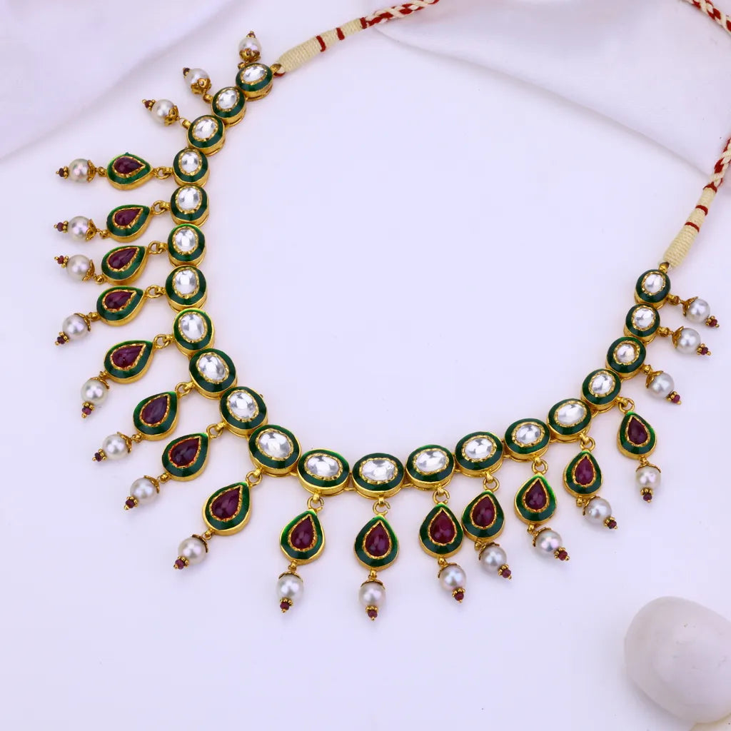 Let this ruby and cultured pearl necklace set drench you in glamor. Masterfully crafted, the sumptuously hued rubies glisten alongside scintillating moissanite while lustrous pearls lend an air of sophistication. But the real pièce de résistance? The intricate meenakari enameling - a true hallmark of artisanal mastery. Elevate your look from park stroll to palace ball with this regal accessory combo. Each necklace seamlessly layers for maximum impact, whether worn individually or all together in an opulent display. This isn't simply jewelry - it's a work of wearable art. Indulge in the luxury of feeling like a queen in this dazzling, one-of-a-kind set. After all, you reign supreme when adorned in rubies.