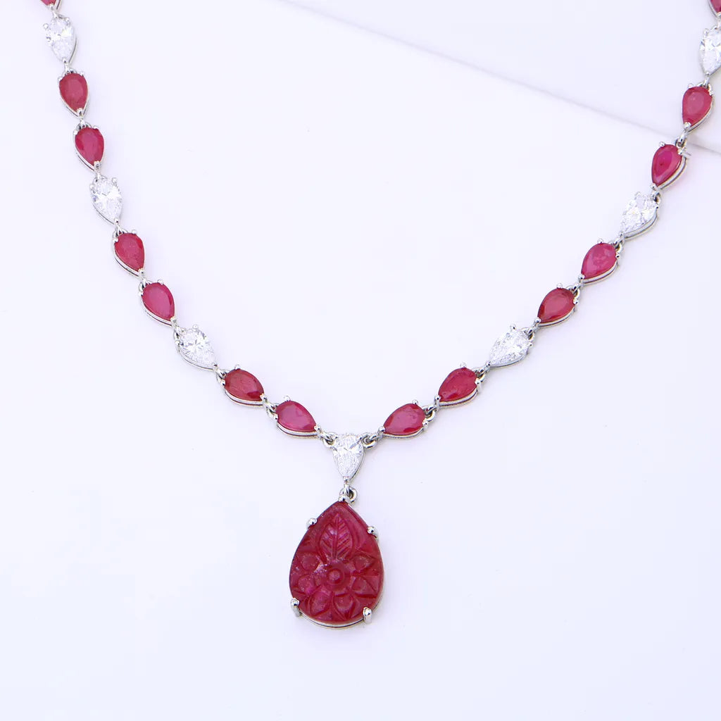 Swan's Grace lives up to its name with a graceful, timeless design fit for royalty. This exquisite necklace set is a stunning marriage of artistry and luxury, from the handcarved rubies that drip with intricate detailing to the shimmering Swarovski diamond accents that cast prismatic brilliance. Meticulously crafted with precious gemstones and crystals, this piece is a true heirloom treasure that instantly elevates any look with elegant, regal sophistication. Whether for a special occasion or just because, Swan's Grace is a statement-making adornment that demands to be noticed. Its rich ruby hues complement any skin tone, while the versatile design seamlessly transitions from day to night. More than mere jewelry, this heirloom set is an artisanal investment that will dazzle for generations.