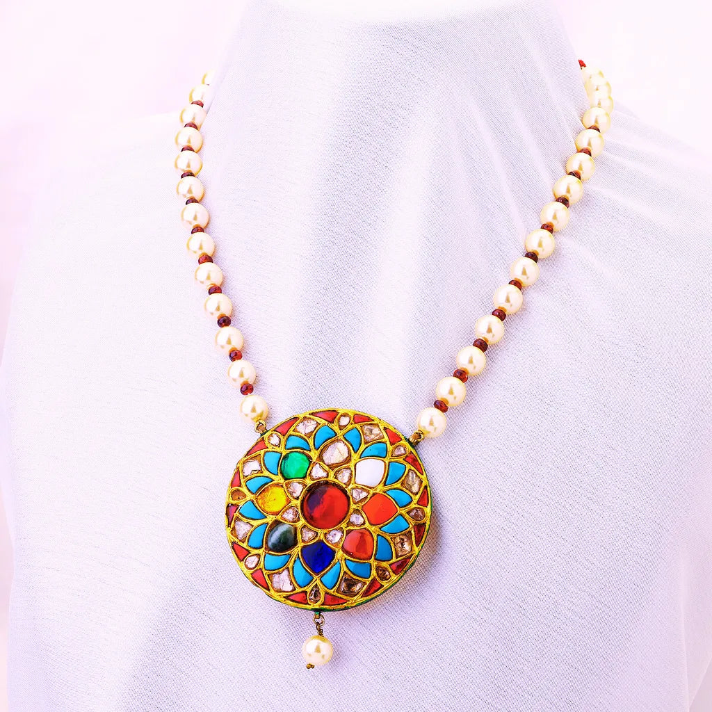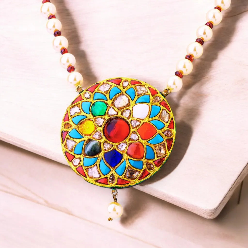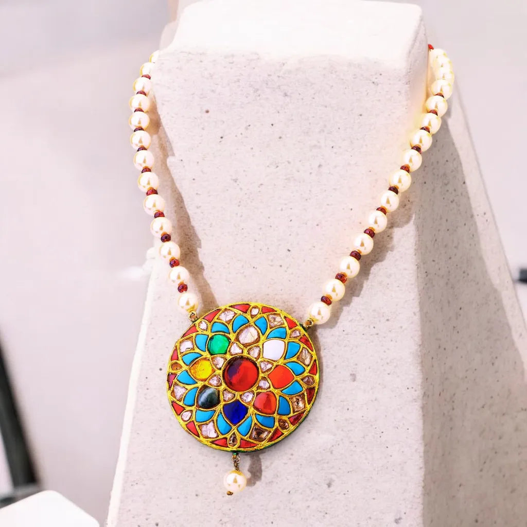 Adorn yourself like modern royalty in this lustrous pearl pendant, Sujhal's Mosaic Petals. Strands of luminous pearls intermingle with vibrant tourmaline gemstones in a rich, saturated rainbow of hues - an eye-catching blend that commands attention. Each strand is meticulously hand-crafted in the centuries-old traditions of Indian jewelers, resulting in an artisanal statement piece that feels like a precious heirloom. Effortlessly elevate any look, from glammed-up soirees to casual weekends, with the timeless elegance of this signature Sujhal creation. Luxurious yet versatile, the Mosaic Petals pendant is a worthwhile indulgence you'll treasure for years to come.