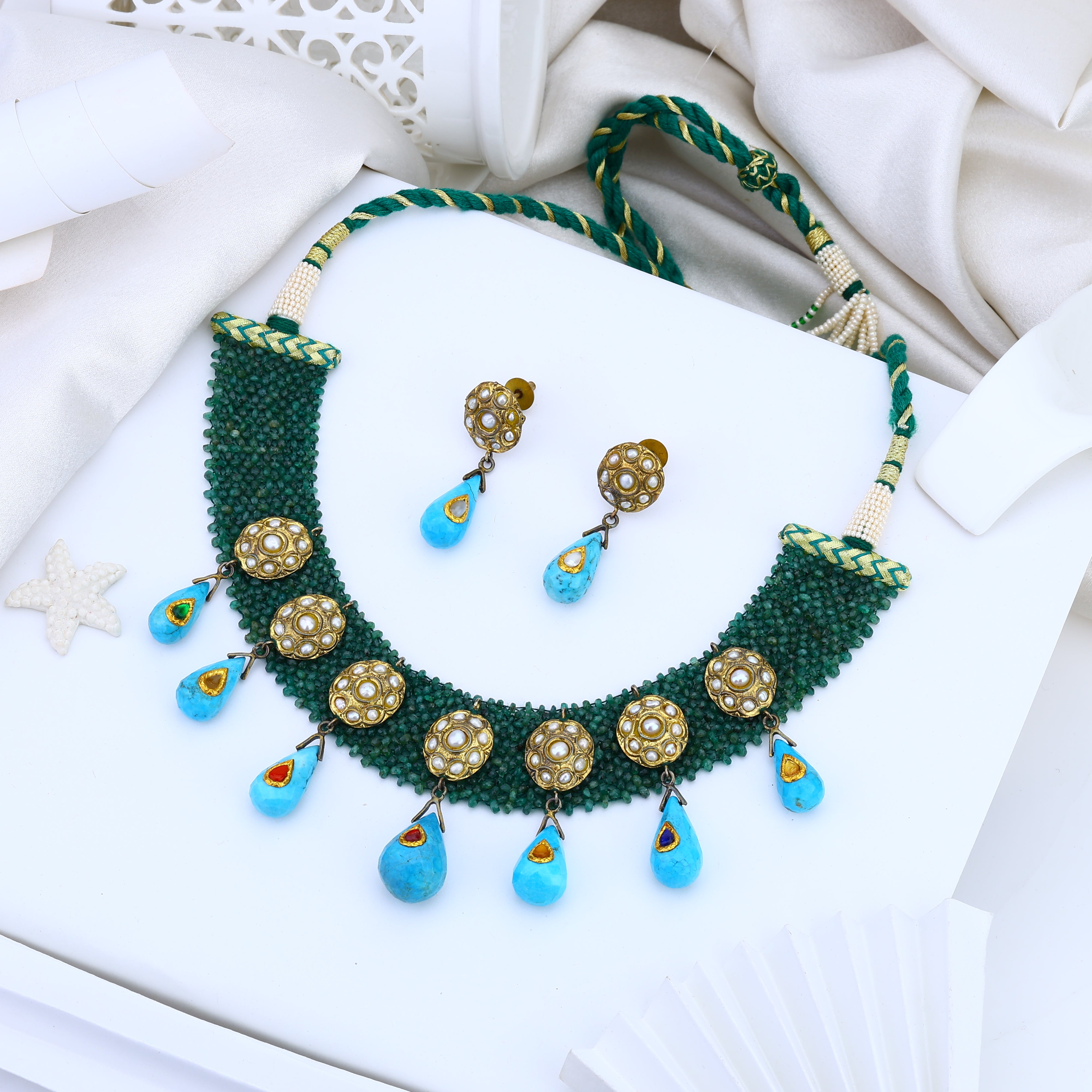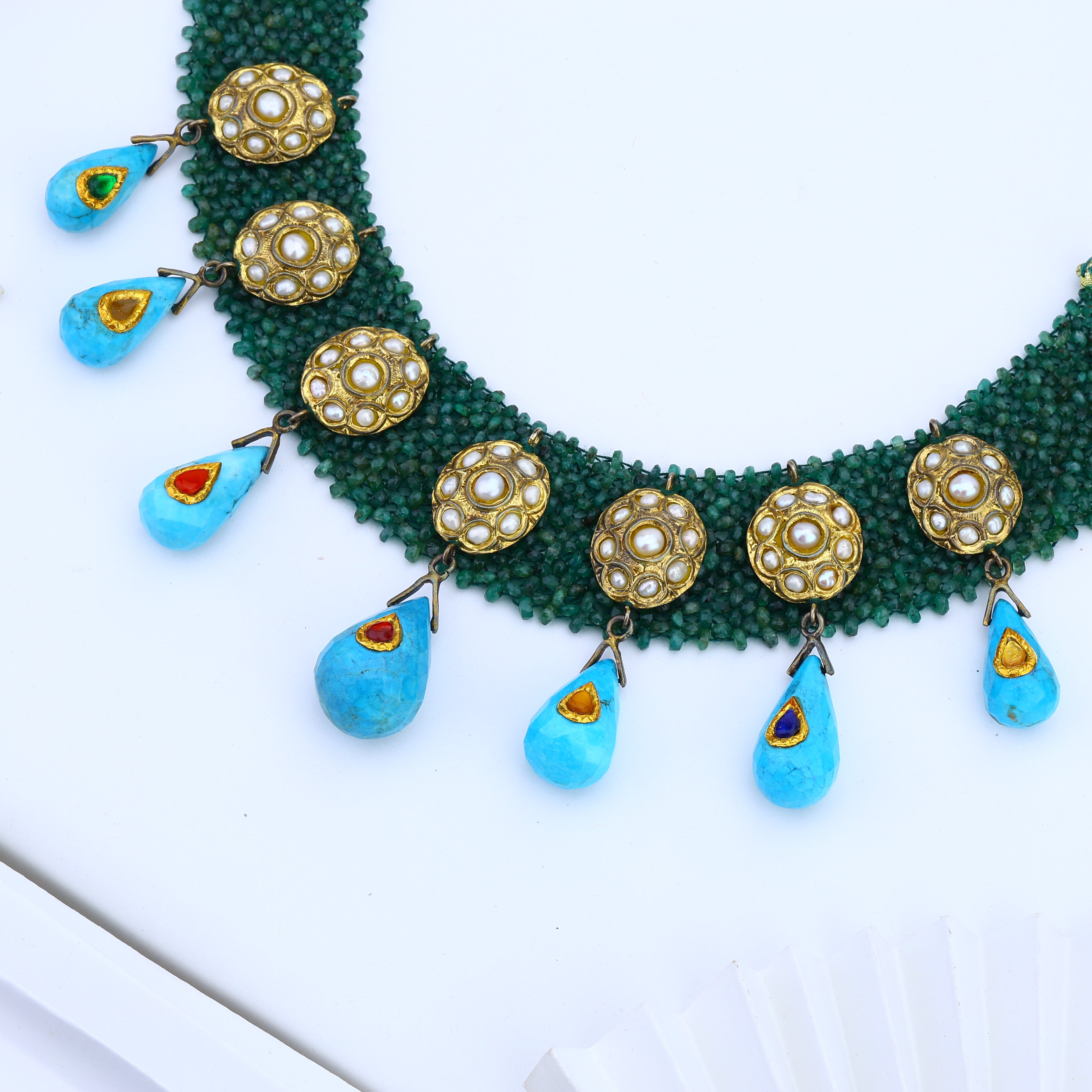 Release your inner regal splendor with the Peacock Pulse necklace set by Sujhal. This decadent creation flaunts intricate Bengali craftsmanship and a vibrant color story of precious khakho pearls alongside fiery rubies, verdant emeralds, celestial blue sapphires, shimmering citrines, and sparkling moissanites. Plated in radiant 18K gold, the jewel-encrusted necklaces evoke visions of royal opulence and fanciful peacocks unfurling their majestic plumage. Drape these striking gemstone strands around your neck to channel instant luxury. Whether worn solo or layered, this dazzling set makes every day feel like a lavish celebration. Indulge like modern-day royalty in Sujhal's exquisite Peacock Pulse necklaces.