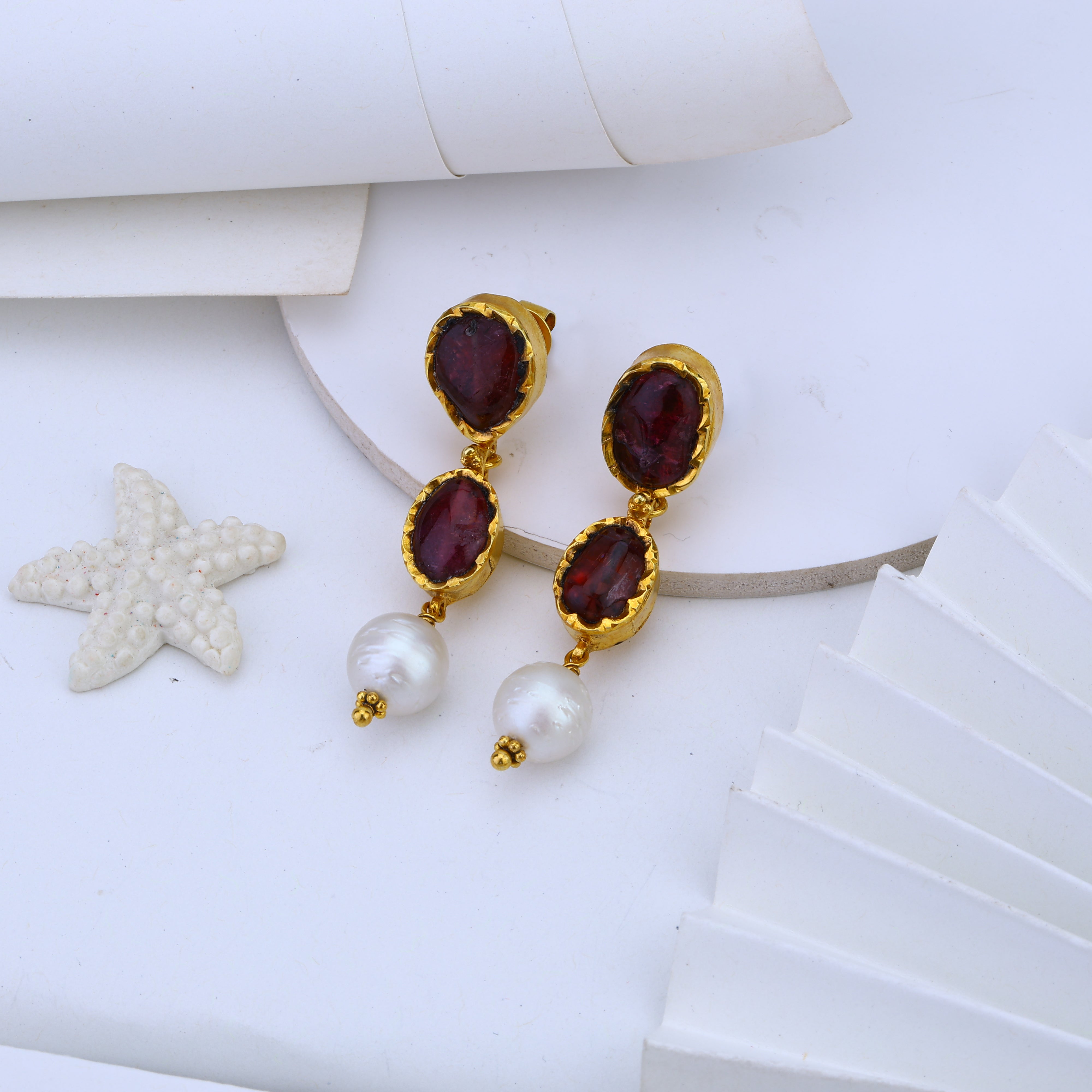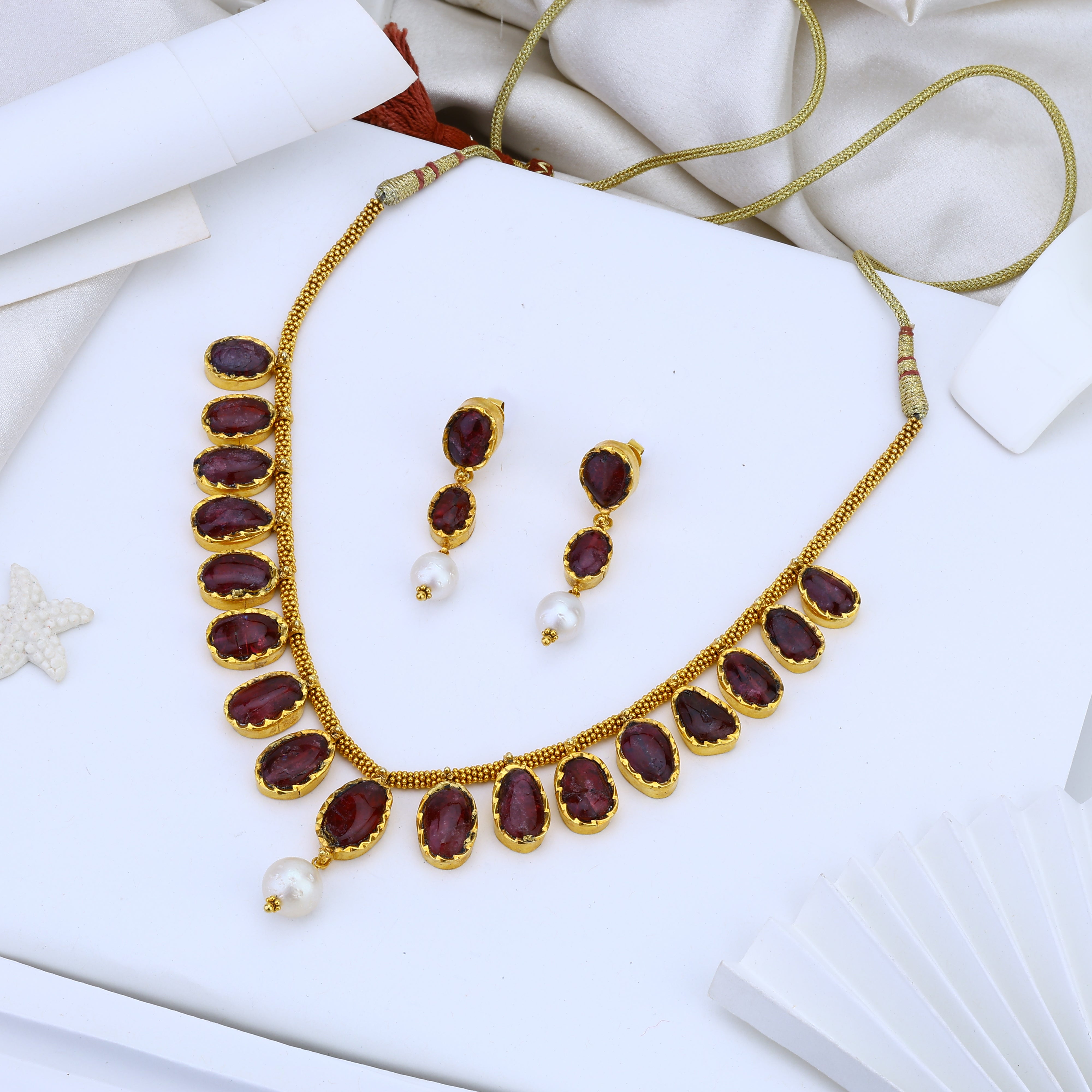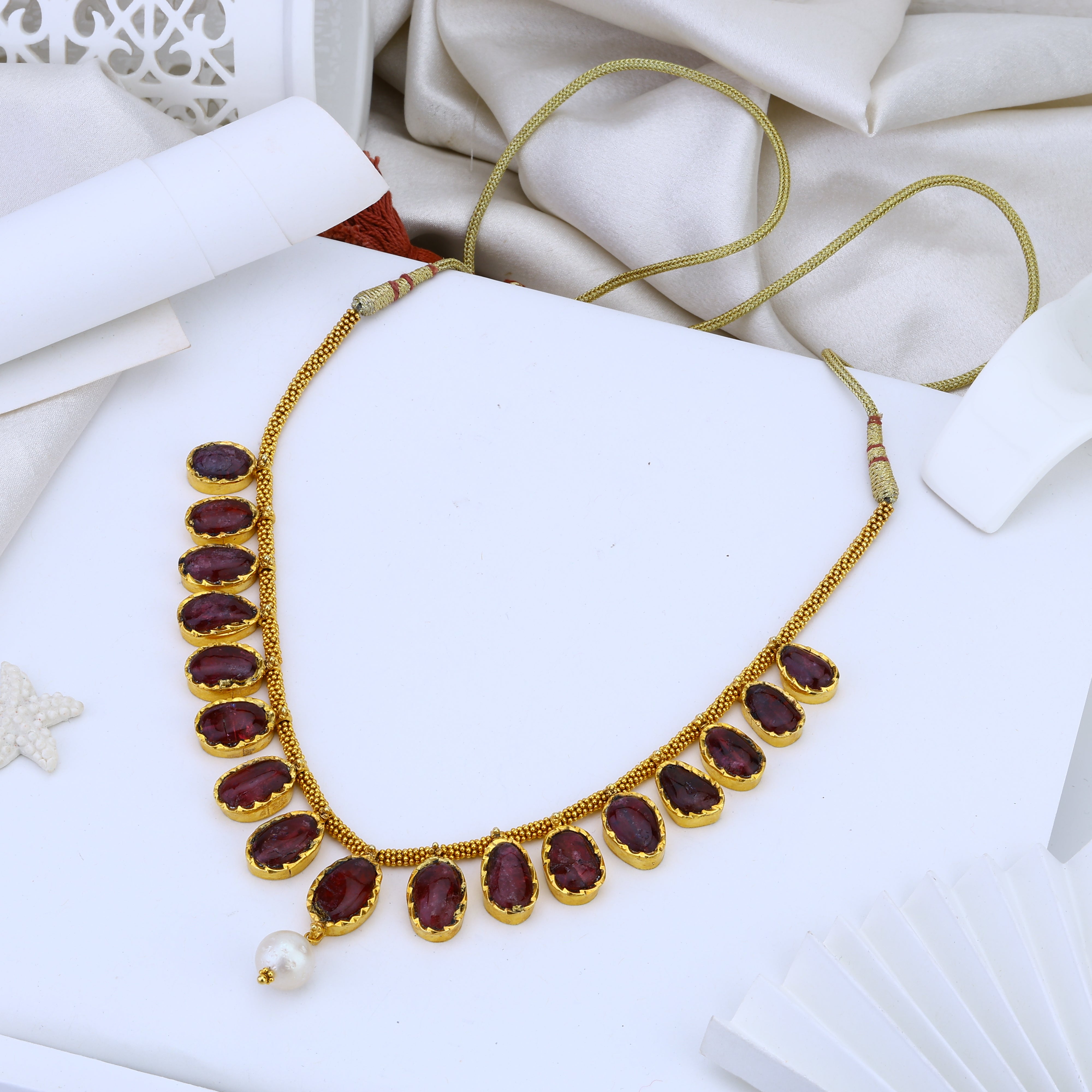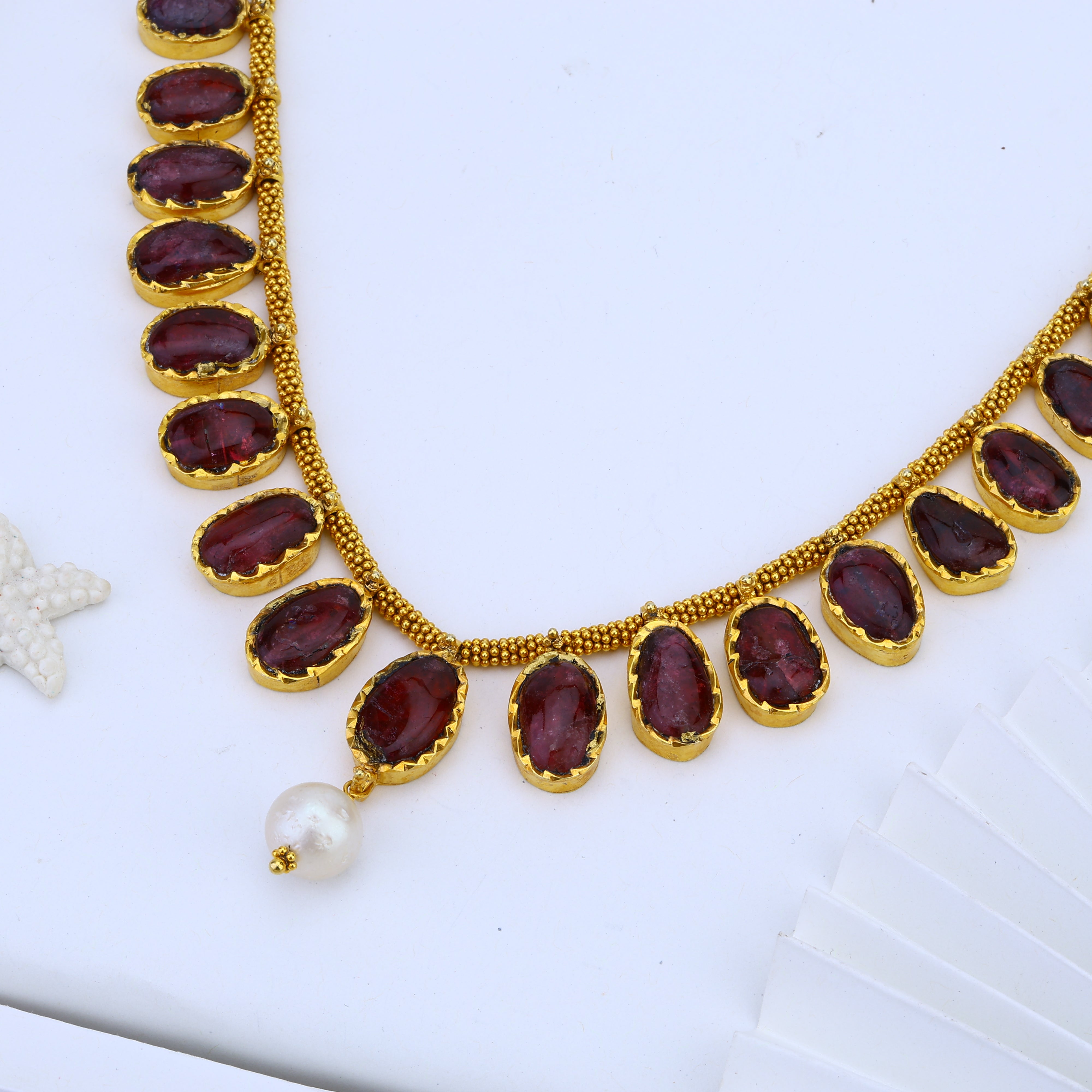 Inspired by the Greek goddess Persephone's emergence from the underworld, this luxurious necklace set blooms with vibrant life. At its heart, fiery rubies glimmer amidst lustrous cultured pearls, their radiance echoing Persephone's rebirth each spring. An 18K gold plating adds a rich, regal luster to every gemstone. Crafted by skilled Bengali artisans, every curve and flourish holds the imprint of generations' worth of meticulous, handmade skill. Slip the Persephone's Bloom around your neck and let its elegant opulence ignite your inner goddess, exuding confidence and romantic mystique wherever you go. This isn't just a necklace—it's a talismanic heirloom that will blossom through the ages.