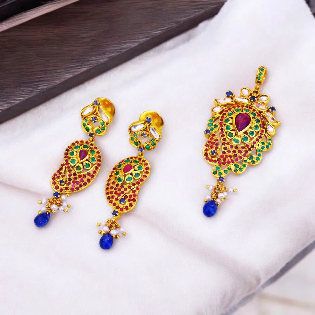 She radiates confidence in any room she enters, so why shouldn't her jewelry follow suit? Sujhal's Ruby Spark pendant set is a head-turning combination of bold rubies, glittering emeralds, brilliant moissanite gemstones and lustrous khakho pearls with a precious blue sapphire. This vibrant set has all the makings of a cherished statement piece that will make her feel like a million bucks, whether worn with a little black dress or elevating her favorite jeans and tee. Eclectic yet sophisticated, the unique gemstone blend is destined to become her new signature accessory. A perfect gift for the stylish woman who appreciates fine jewelry and isn't afraid to sparkle.