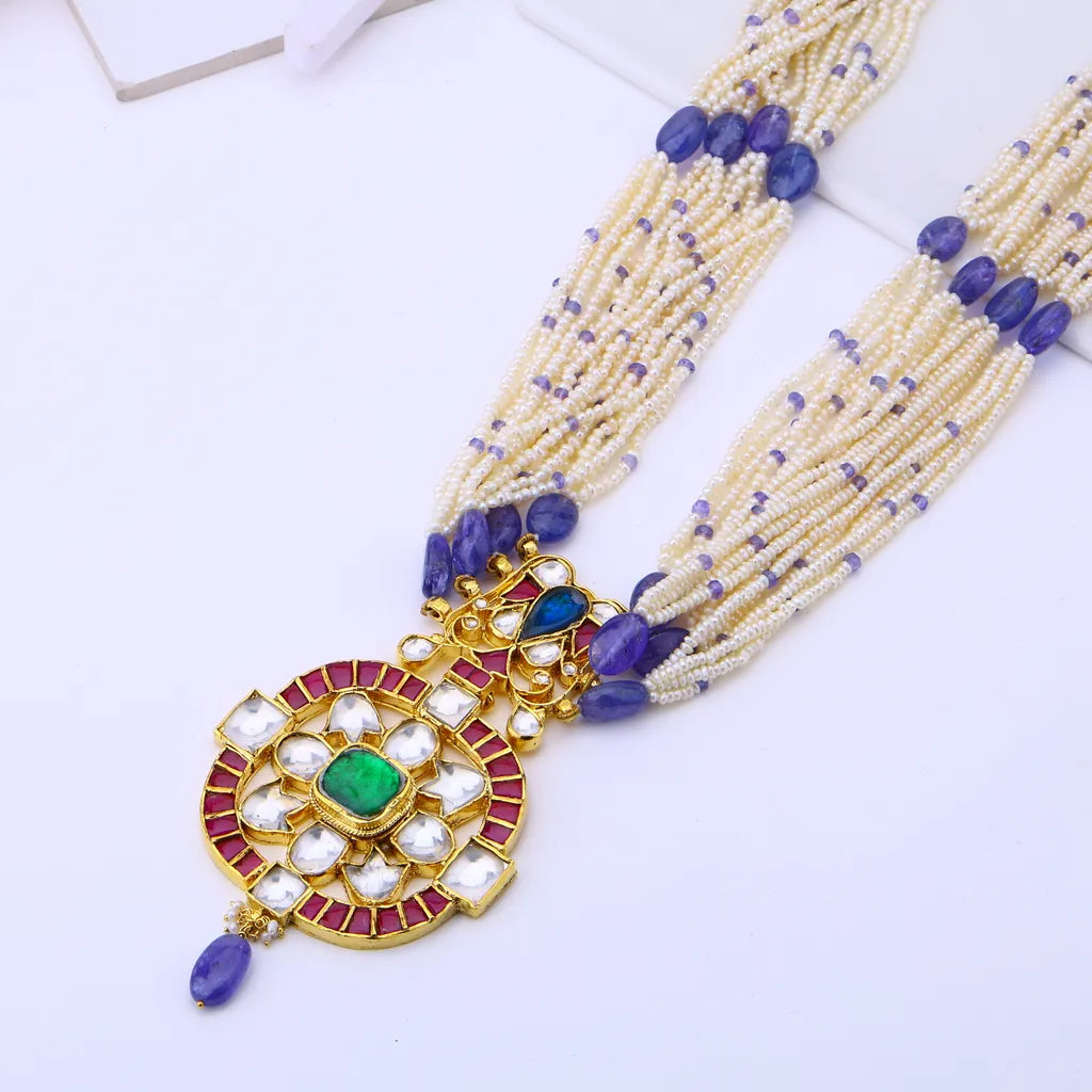Where high fashion meets heirloom allure, this tanzanite and moissanite pendant set dazzles. Its vibrant rubies evoke passion's flame, while strands of radiant khakho pearls epitomize timeless sophistication. Onyx's modern noir sheen lends an edgy refinement to the jewelry suite. Bold yet elegant, this pendant set is a brilliant blend of gemstones that captivates from every angle. Whether for a special occasion or everyday flair, this collection elevates any look with its regal, multi-gemstone splendor. Crafted with superior materials and an eye for luxury, this set is an exquisite jewel box addition and surefire compliment magnet.