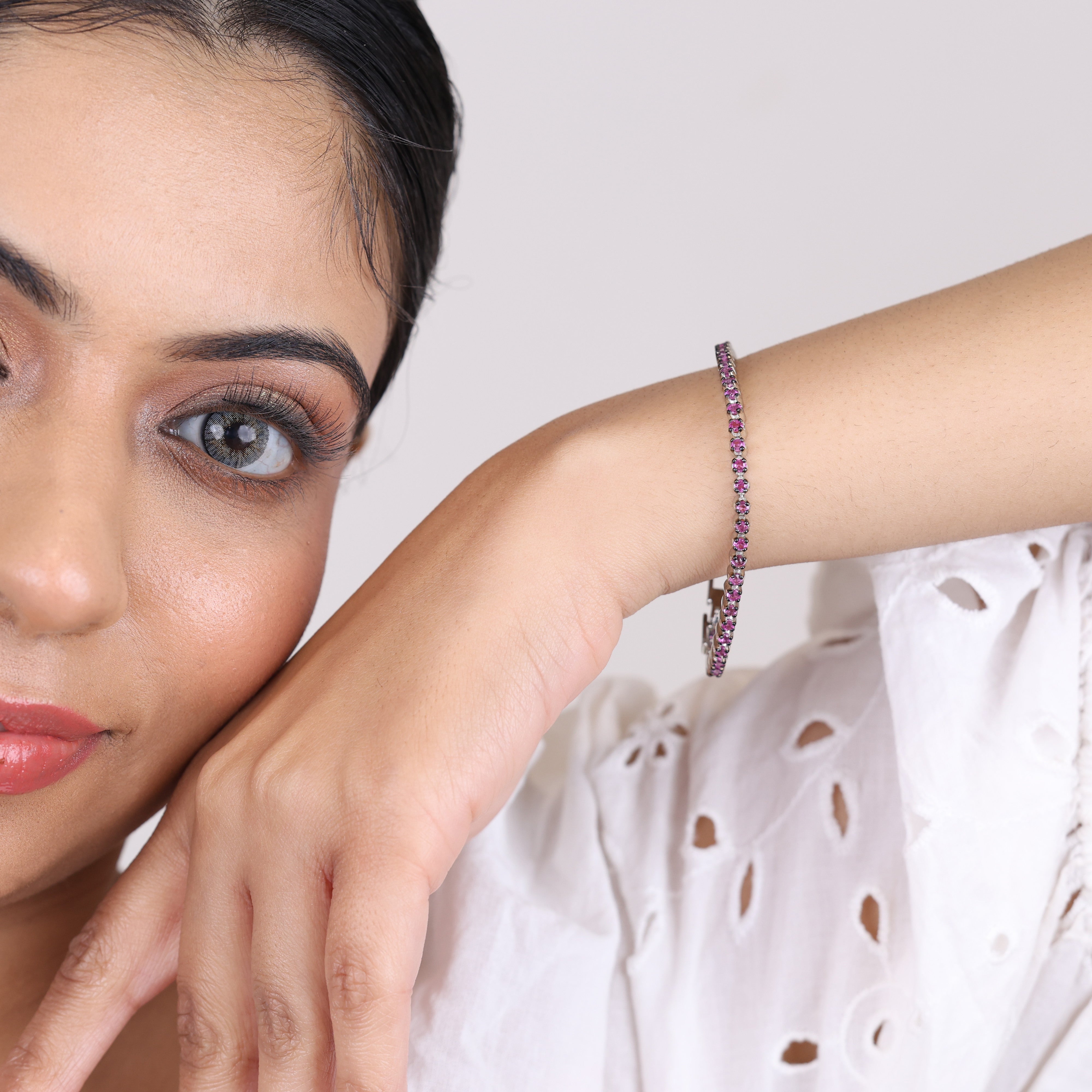 Crave rebellion, minus the regrets? Slip on the Red Rebel bracelet. This ruby-studded gem flaunts a brilliant crimson blaze, framed by a sleek black rhodium plating that radiates edge and sophistication. Each stone is painstakingly hand-selected, a hallmark of the bracelet's artisanal Bengali craftsmanship that honors ancient techniques. Yet the design strikes a defiant modern attitude—the ideal accessory for unleashing your inner rebel while indulging in a touch of luxury. After all, playing by the rules is overrated. With its marriage of precious materials and subversive spirit, this bracelet proves you can have your rebellion and rock it, too. Adorn your wrist with a scintillating statement that garners admiring glances and elevates any look, from couture to casual.