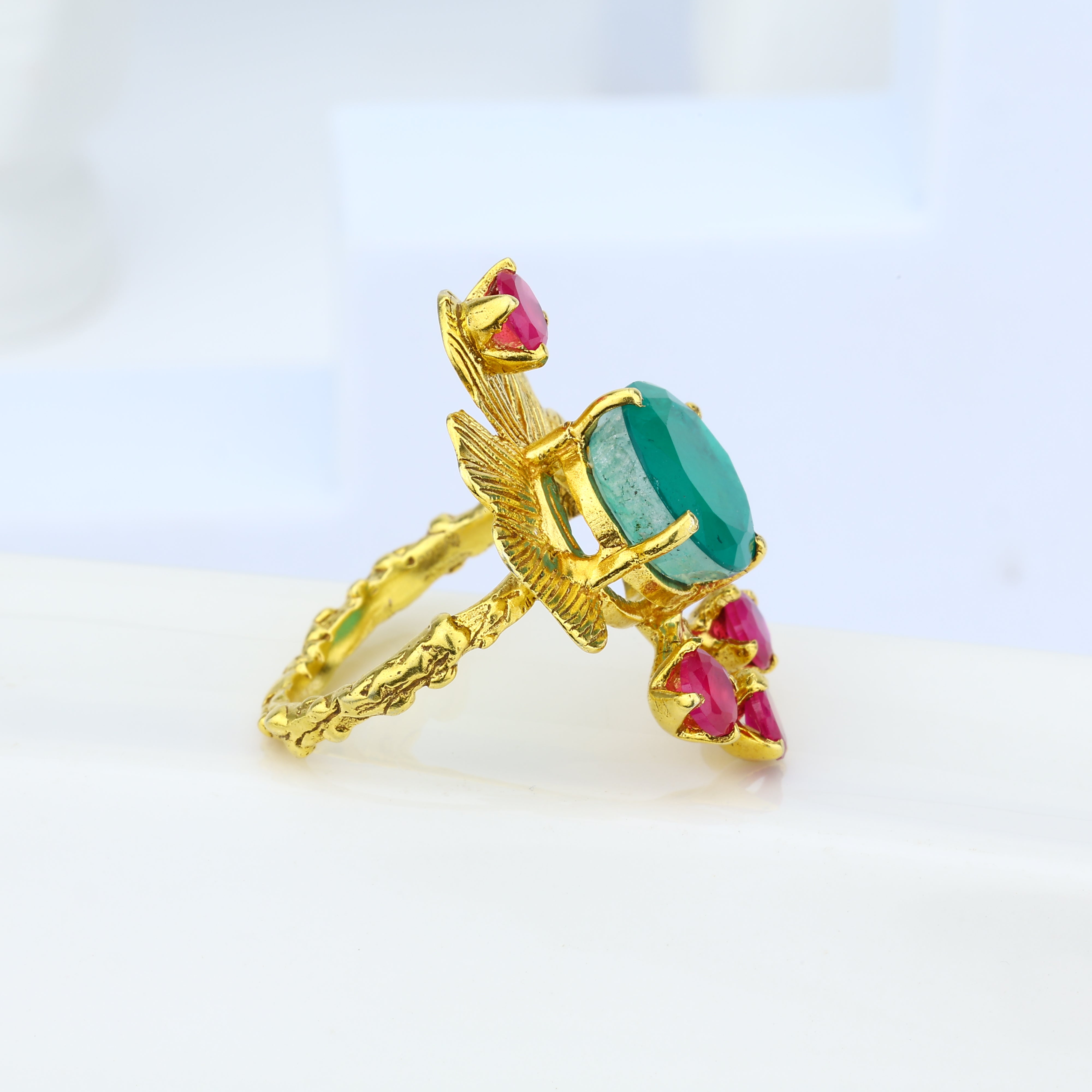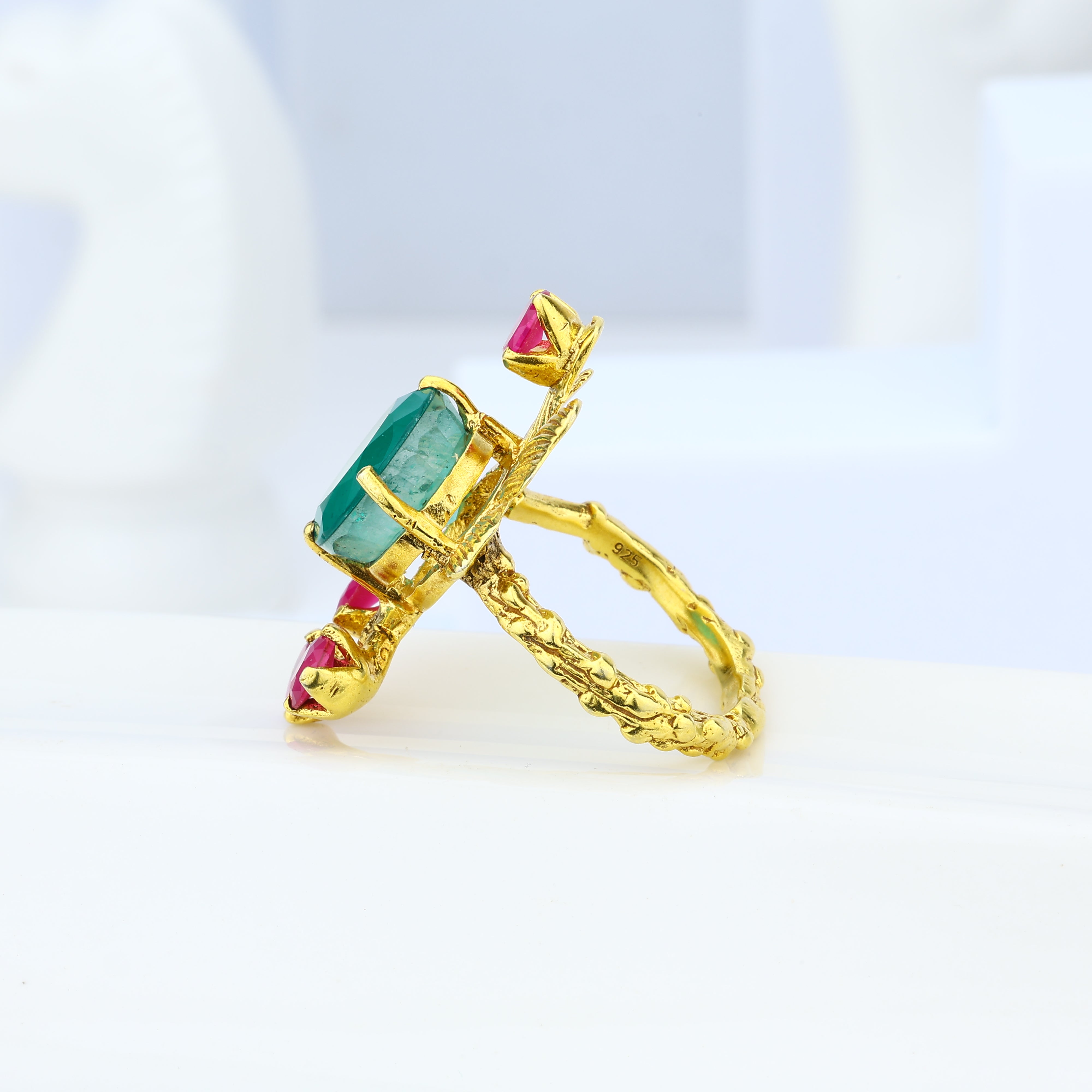 All eyes will linger when you adorn your fingers with these opulent Aurora Verde rings. Lavished with rare green onyx gemstones and plated in lustrous 18K gold ruby, each ring exudes timeless luxury. Yet their true radiance emanates from the painstaking Bengali craftsmanship imbued within every delicate detail. These aren't mere accessories—they're heirlooms celebrating the ancient jewelry traditions of a culture renowned for its artistry. From the shimmering gems to the intricate metalwork, every element whispers of rarity and refinement. Whether worn for a special occasion or an everyday reminder of life's precious beauty, the Aurora Verde rings are a statement of impeccable taste. Slip them on and let their splendor shine.