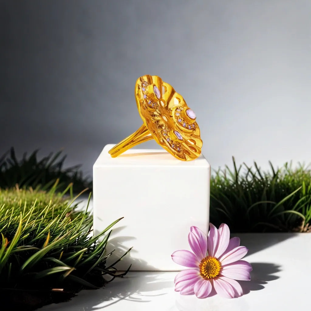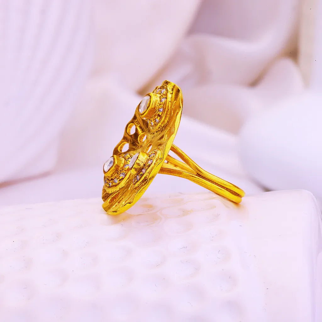 You know that feeling when you slip on a ring so blindingly brilliant, so impeccably crafted, that it instantly transforms your entire look? Verdant's moissanite and cubic zirconia rings possess exactly that kind of luxurious, head-turning allure. Each exquisite jewel glitters with multifaceted, diamond-like sparkle thanks to the superior gemstone blend and expert polki craftsmanship—all wrapped in a lustrous 18K gold sheath. These rings radiate glamor, from their ornate, gemstone-encrusted metalwork to the subtly rich hue of real gold plating. It's maximum dazzle and shine in a single statement piece. Equal parts elegant and eye-catching, these moissanite jewels strike a perfect balance between timeless sophistication and bold, contemporary flair. Because why go for subtlety when you can claim your crown as a reigning jewelry icon?