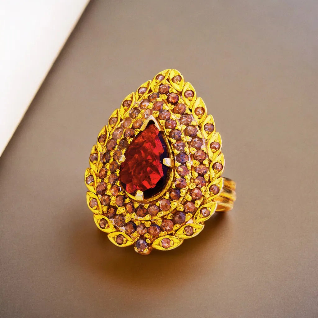 This ring radiates luxury, their garnet and moissanite gemstones shimmering with a hypnotic allure. Each one is a handcrafted masterpiece, plated in lavish 18K gold using time-honored Bengali techniques. Slip one on and prepare to turn heads—these stunners were made to be admired. More than just accessories, they're transportive talismans that evoke the splendor of another era. The rich, multifaceted garnet stones smolder with an eternal glow, while the moissanite's prismatic brilliance casts an ethereal spell. From the first glimpse, you know these are no ordinary rings. Their extravagant opulence hints at lives of grandeur and adventure, of regal soirees and strolls through lush, jewel-toned gardens. Prepare for a fresh infusion of glamor to elevate your everyday.