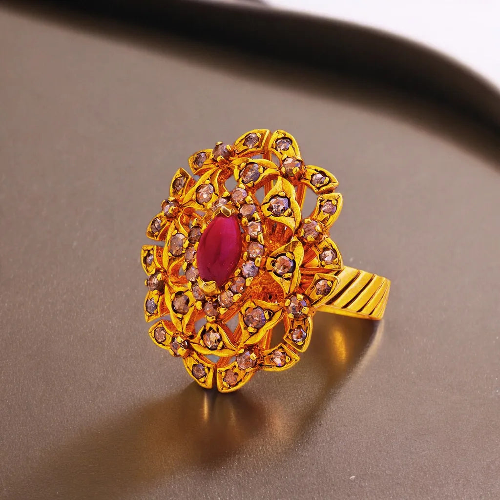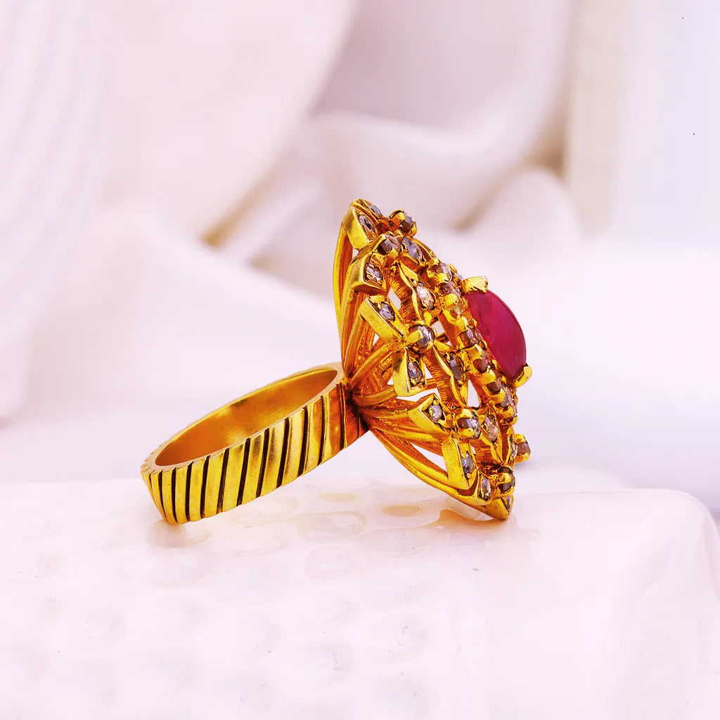 For the woman who wears confidence like a crown, the Verdant Halo ring exudes lush decadence. Masterfully crafted by Bengali artisans, this regal beauty unites rubies and moissanite gemstones in an ornate 18K gold-plated design. Like a dazzling halo encircling your finger, this ring's jewel-encrusted splendor shines bright - subtlety not included. With a nod to verdant botanicals, its textured metalwork evokes the opulence of exotic foliage. More than a mere accessory, the Verdant Halo is an emblem of inner radiance, empowering the modern woman to embark on her day cloaked in glamor. Embrace your queenly spirit; this ring demands nothing less.